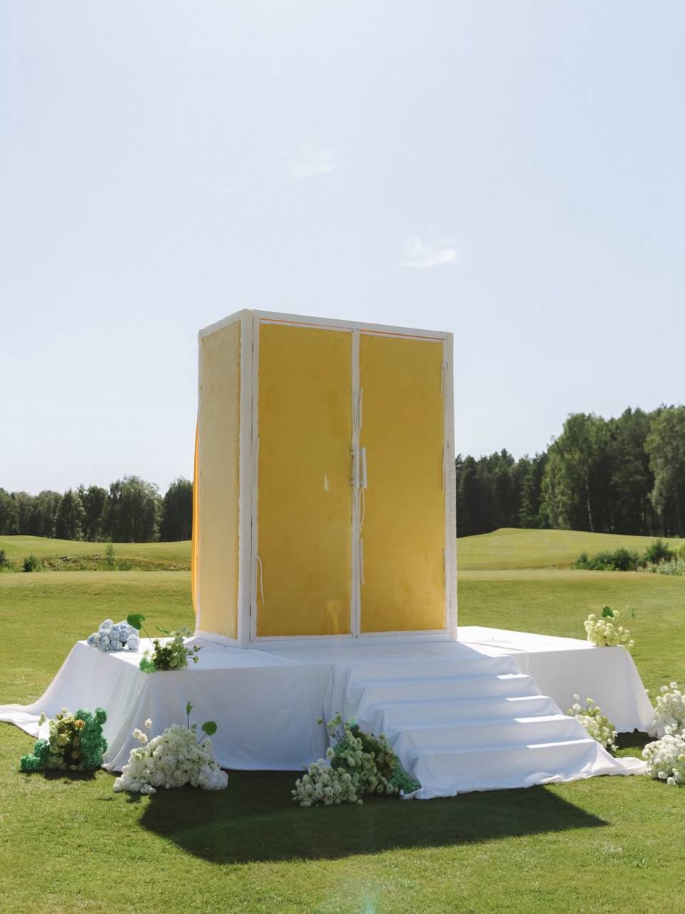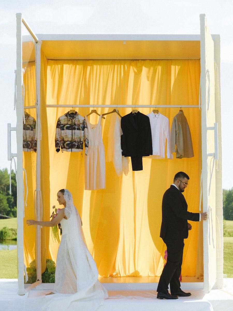Церемония прошла в глэмпинге, где прямо у кромки воды разместили «алтарь» — не классическую арку, а инсталляцию с языческими мотивами.