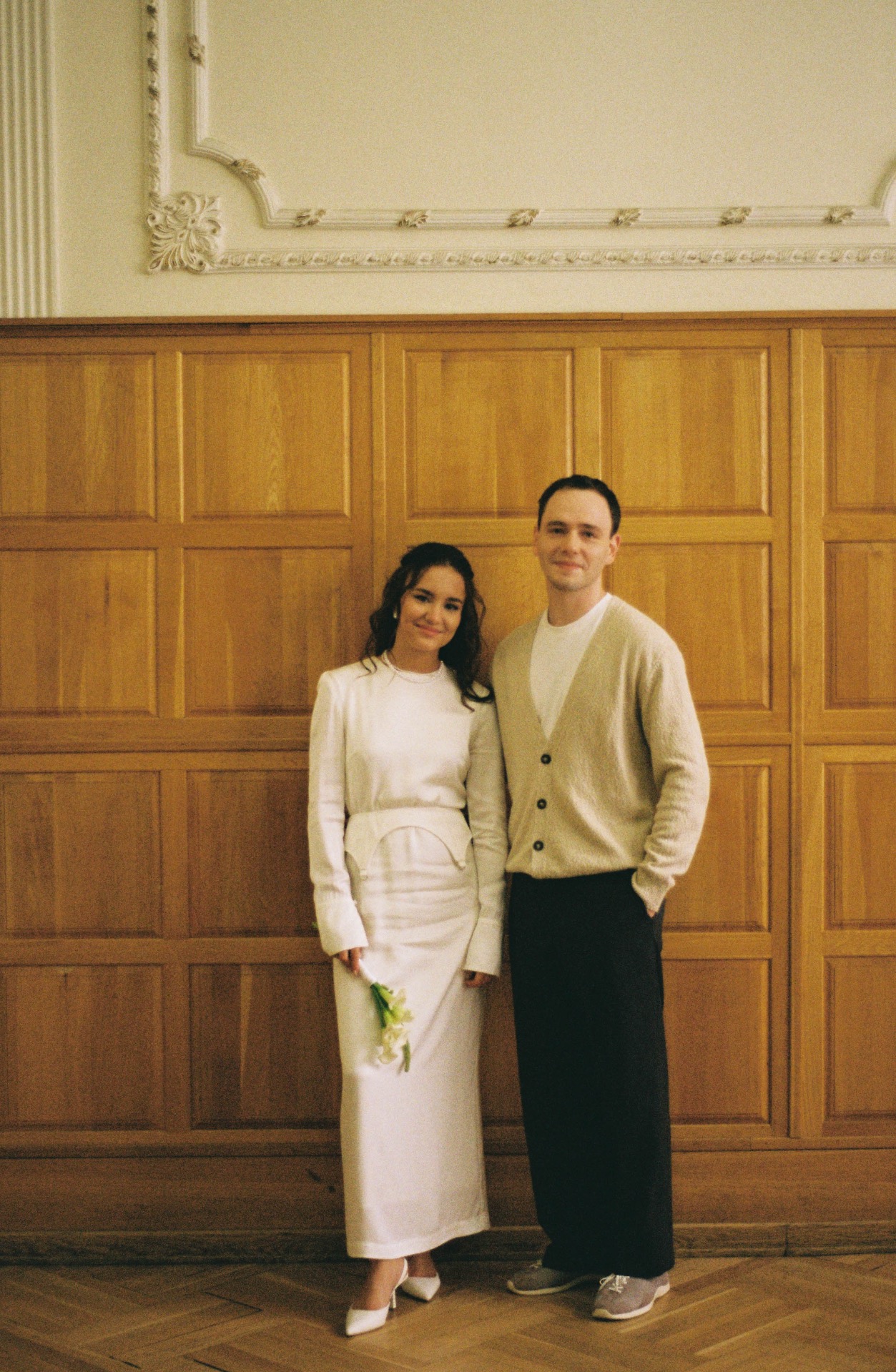 С образом для Саши было сложнее. Он не самый высокий и крупный мужчина, к тому же имеет чёткий собственный вкус и стиль. Выбирали мы долго и мучительно. Изначально мы знали лишь два ключевых условия: ткань должна быть качественной и дорогой, а цвет — коричневым. Мы разрывались между двумя вариантами: костюмом от бренда Newrubrend с классической косовороткой и оверсайзной, уже почти классической моделью от бренда Some people.