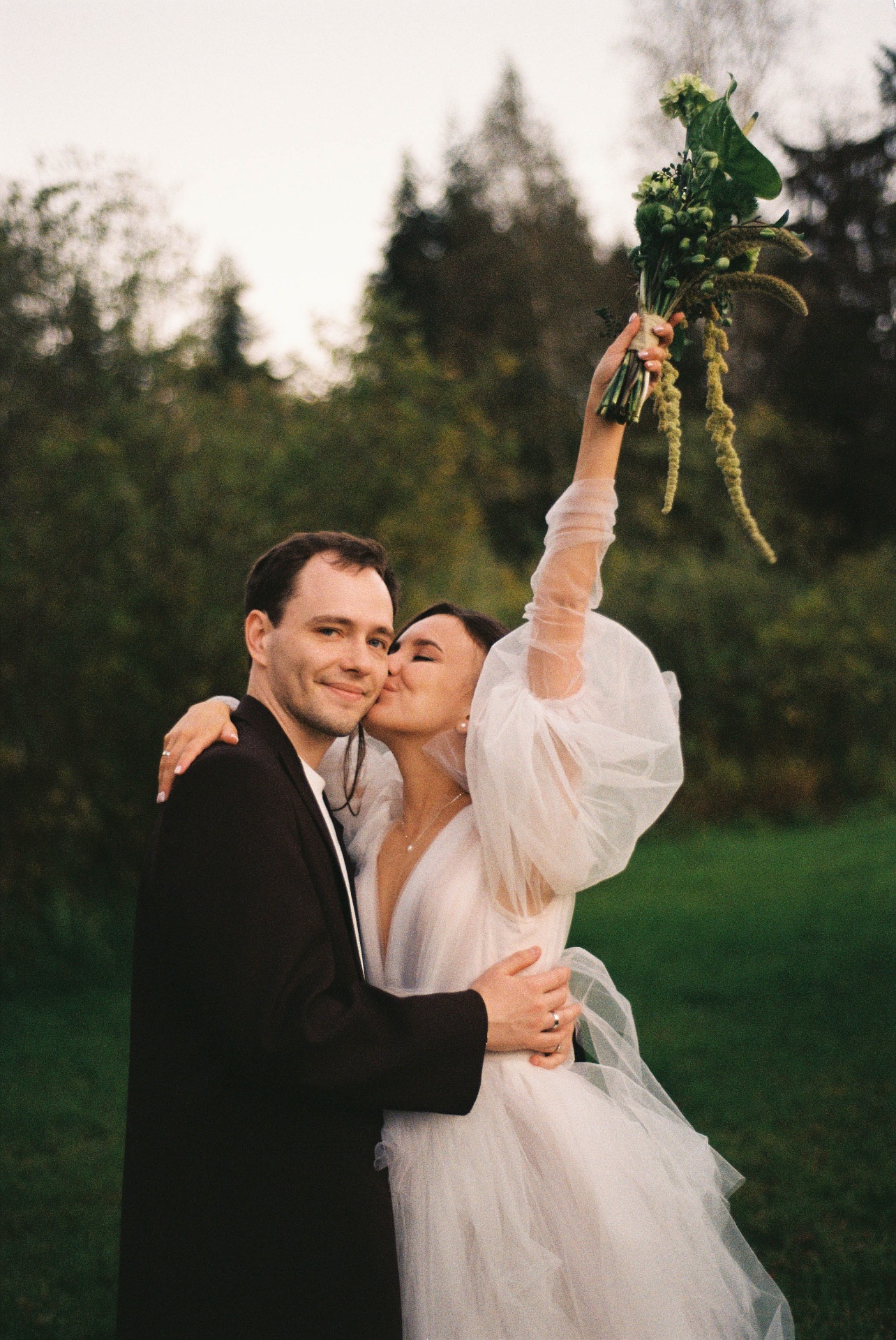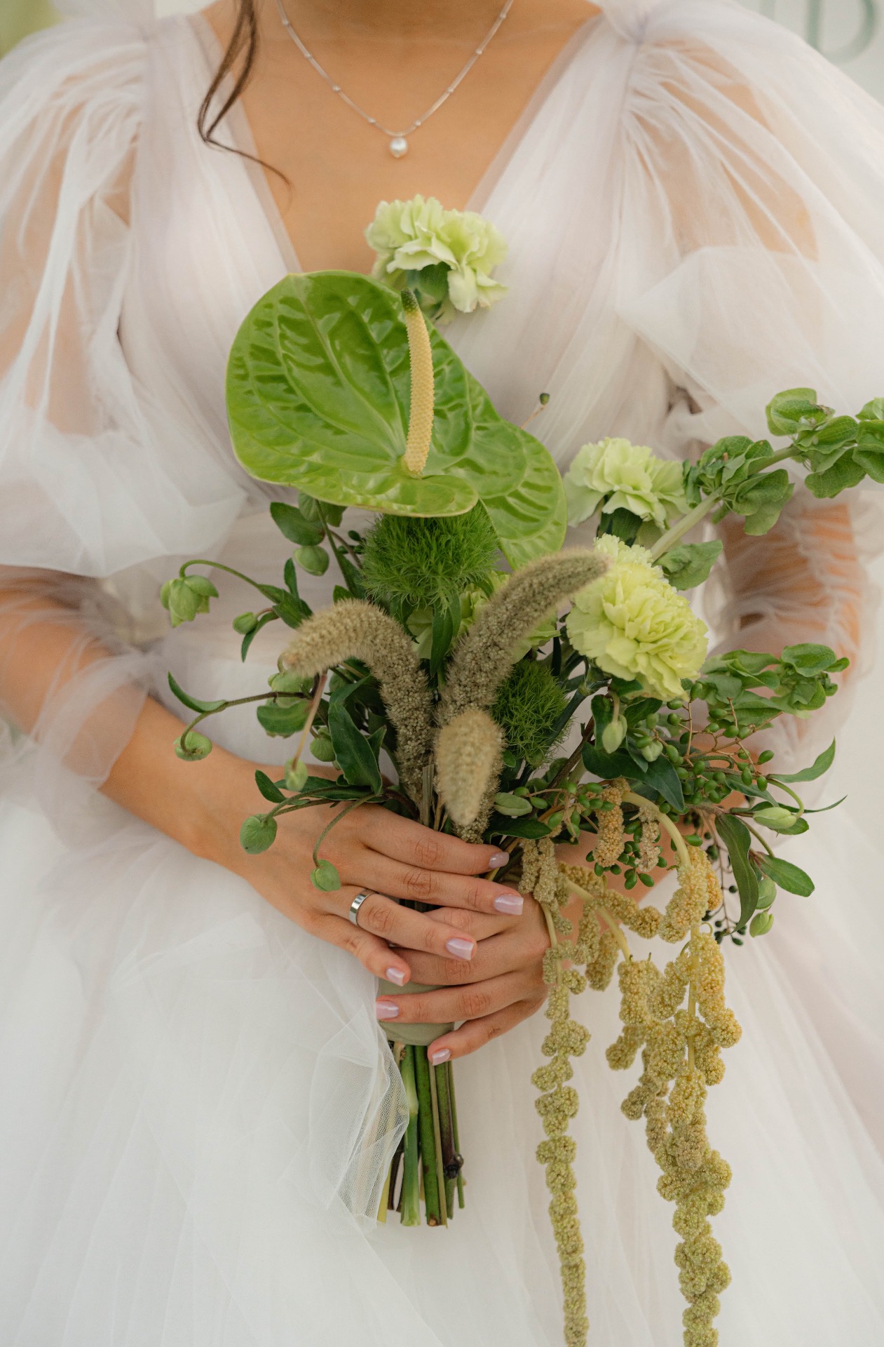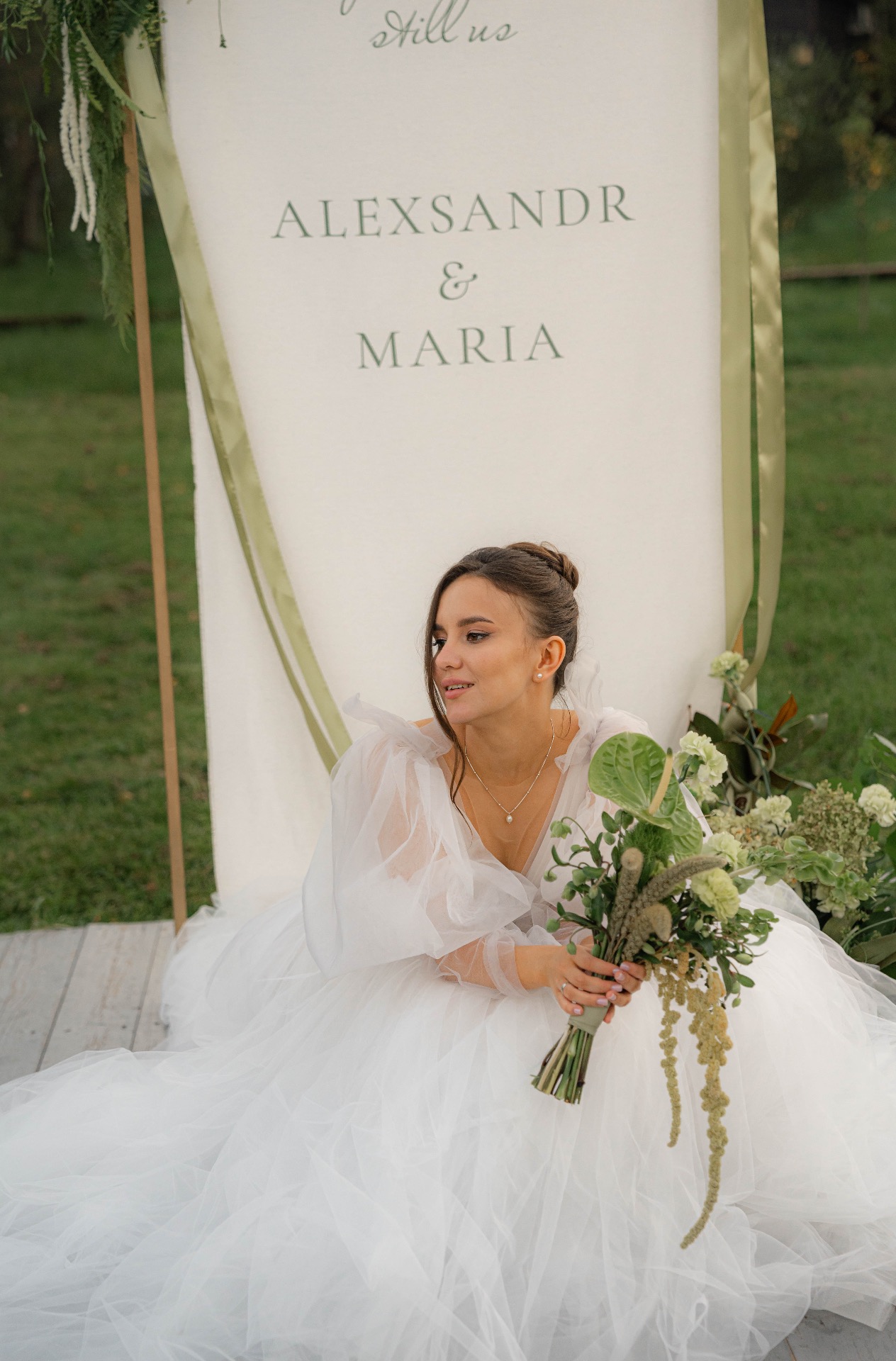 Цветовую палитру и выбор цветов (гортензии, диантусы и другие) мы также продумали заранее. Это сочетание зелени и нежных оттенков неслучайно — оно часто прослеживается в букетах, которые Саша дарит мне на протяжении всех наших отношений. Он всегда выбирает что-то интерьерное и сложное. Нам хотелось перенести эту нашу историю в свадьбу, хотя бюджет был ограничен.