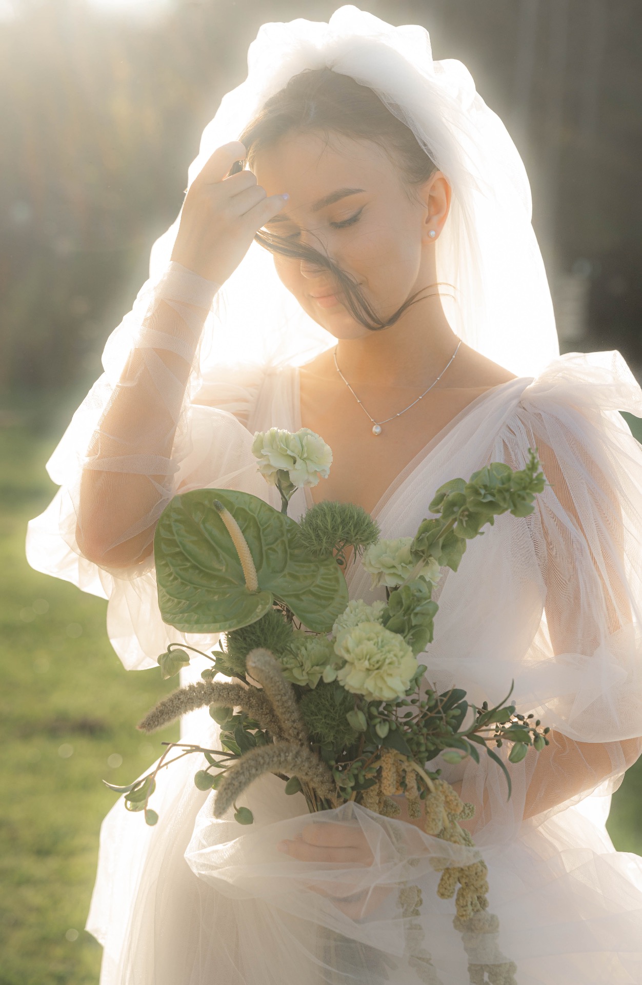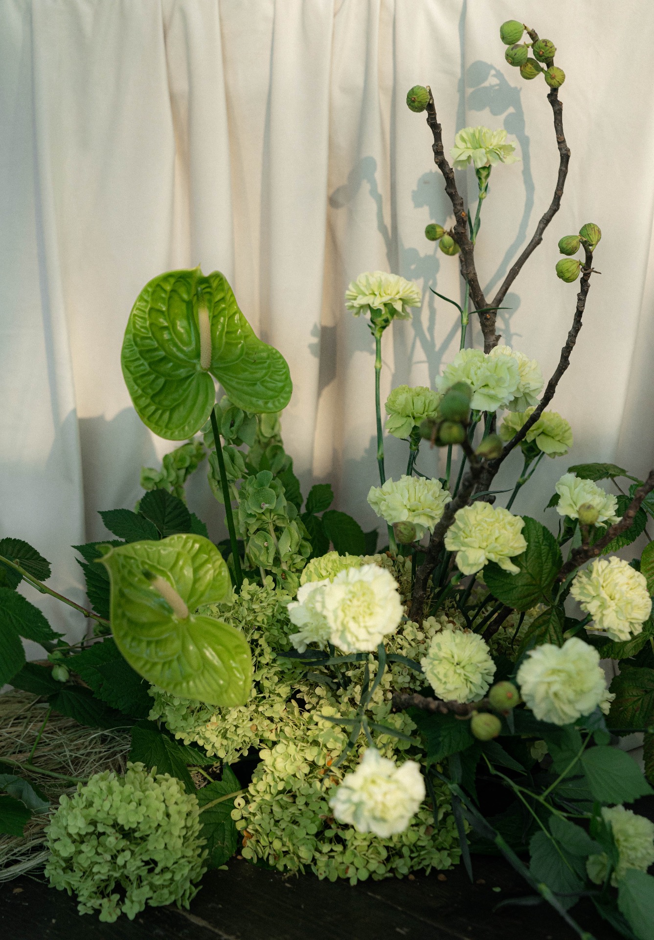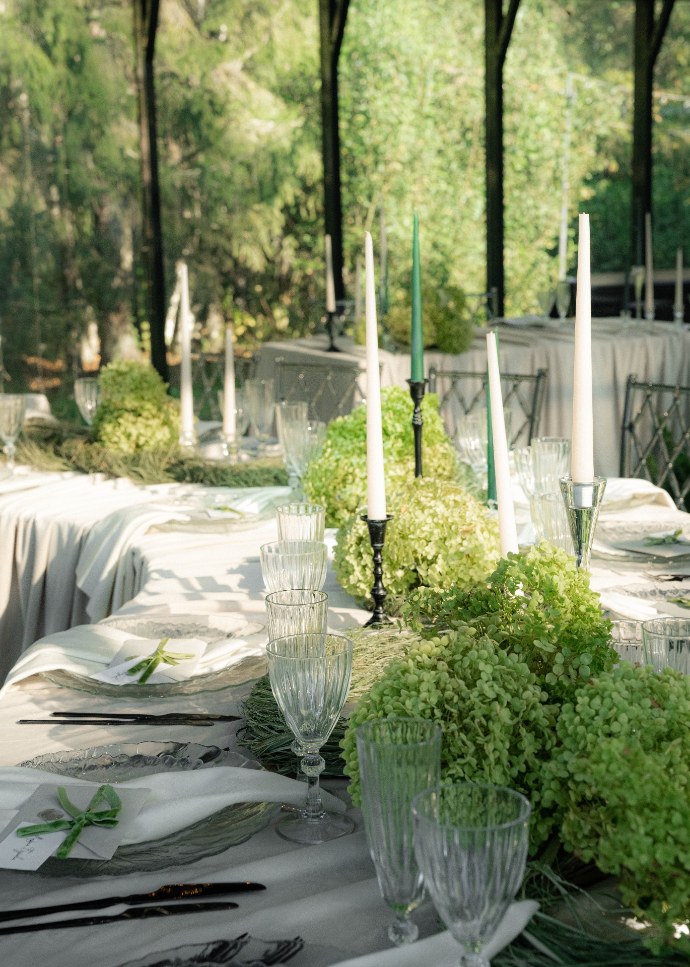 Цветовую палитру и выбор цветов (гортензии, диантусы и другие) мы также продумали заранее. Это сочетание зелени и нежных оттенков неслучайно — оно часто прослеживается в букетах, которые Саша дарит мне на протяжении всех наших отношений. Он всегда выбирает что-то интерьерное и сложное. Нам хотелось перенести эту нашу историю в свадьбу, хотя бюджет был ограничен.
