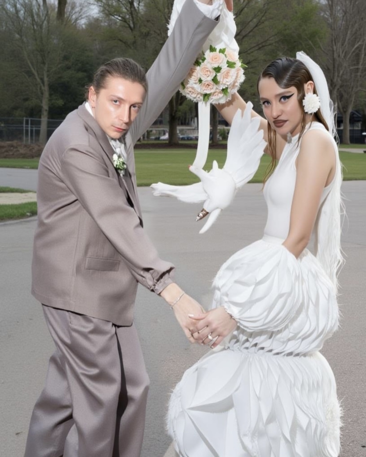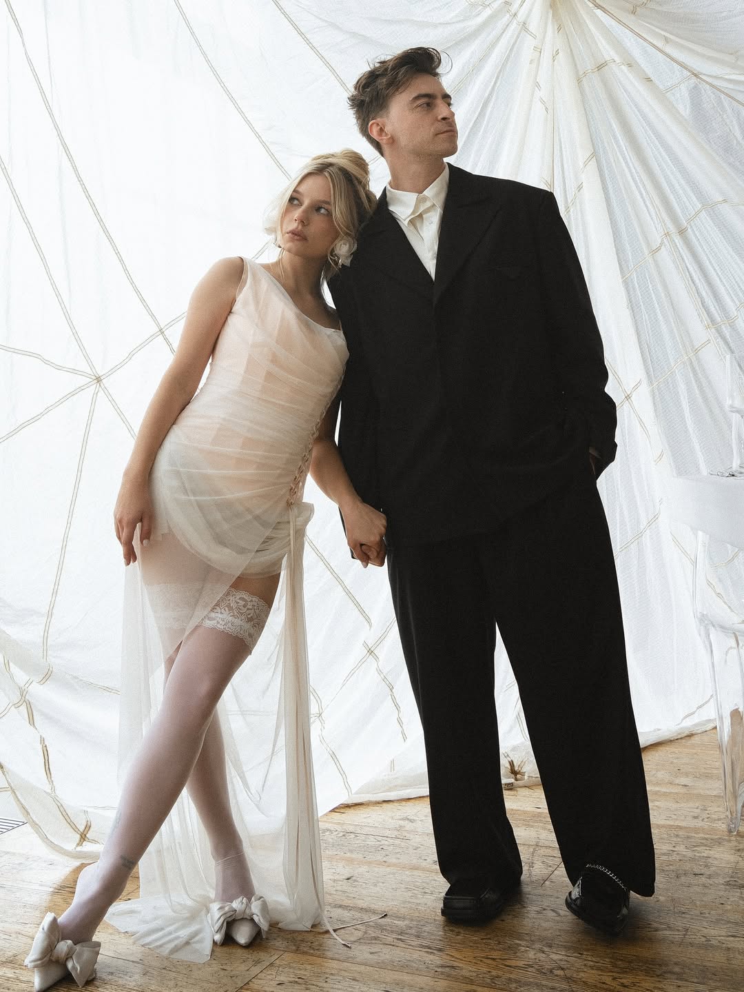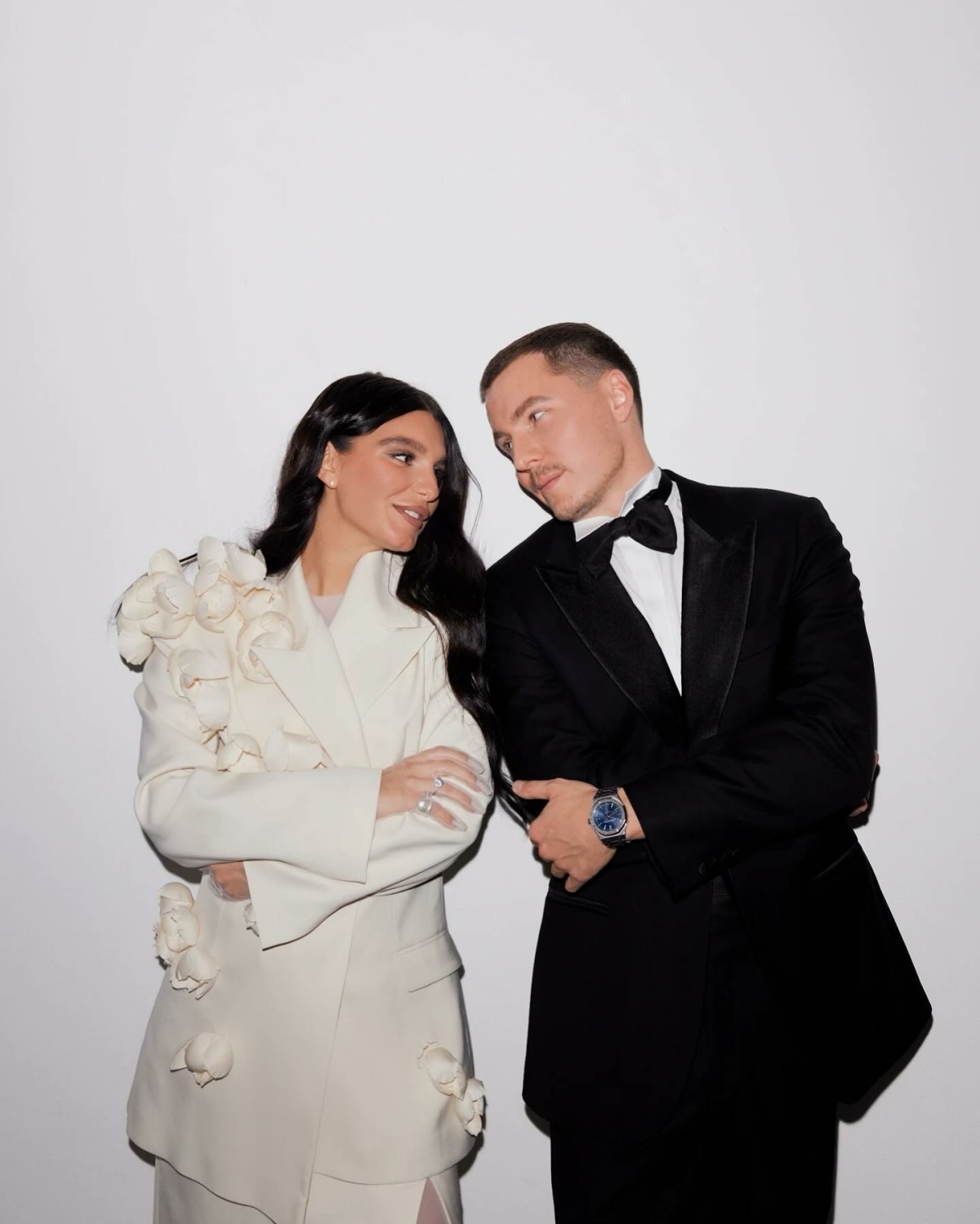 Ребята расписались в сентябре 2025 года, а основной праздник прошёл в отеле «Метрополь», кадры с которого мы всё ещё ждём. Помимо этого, у них было сразу четыре концептуальные съёмки. Одна из них прошла по знаковым локациям Петербурга: её главный замысел — воплощение русских традиций в современном прочтении, поэтому мы увидели и белого коня, и взлетающих голубей, и, конечно, классических лебедей на торте.