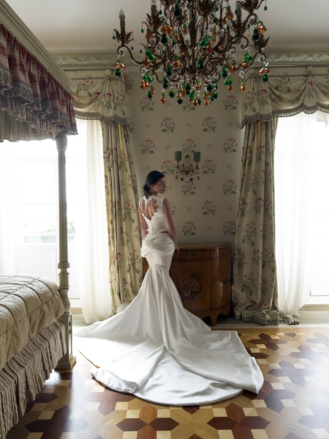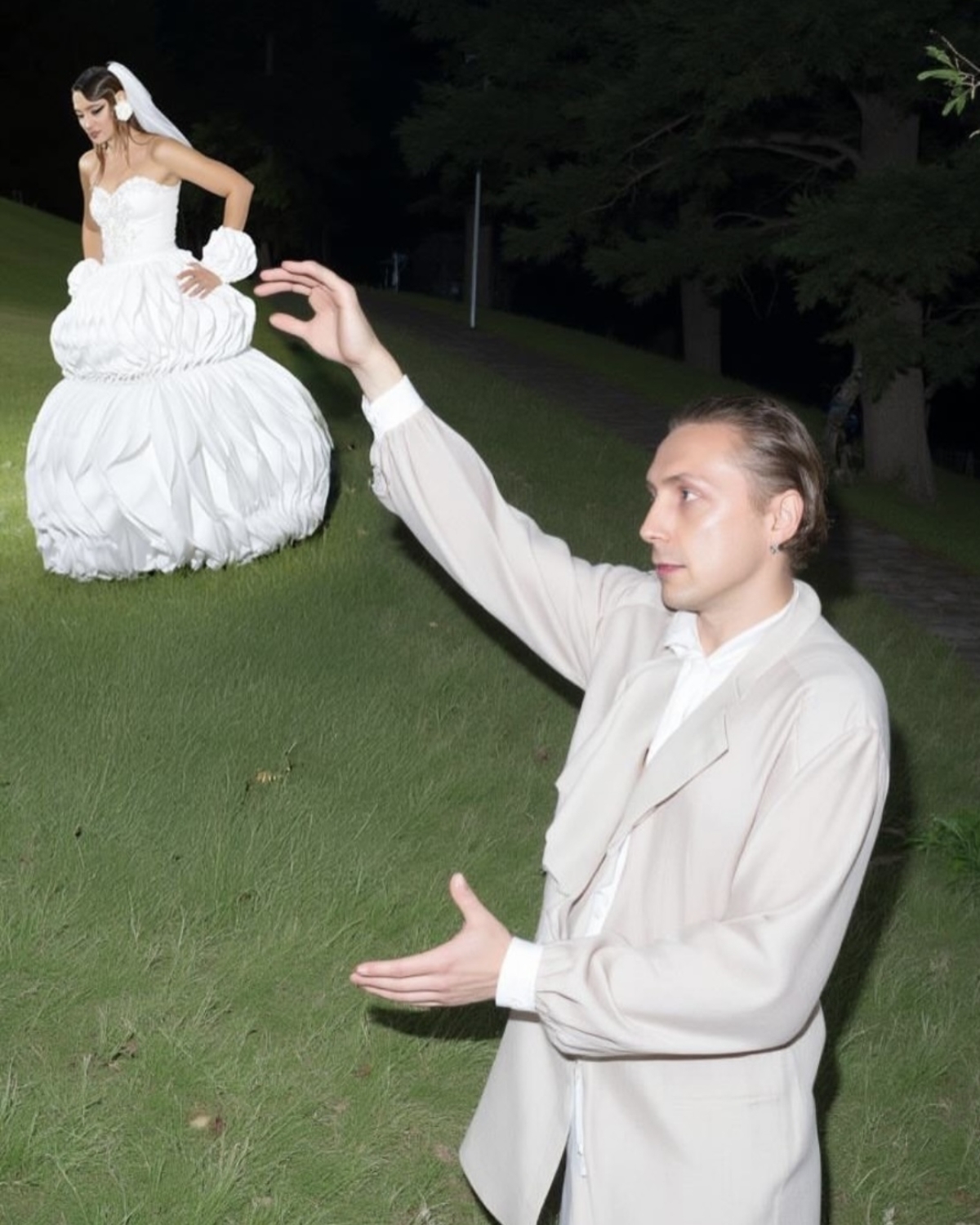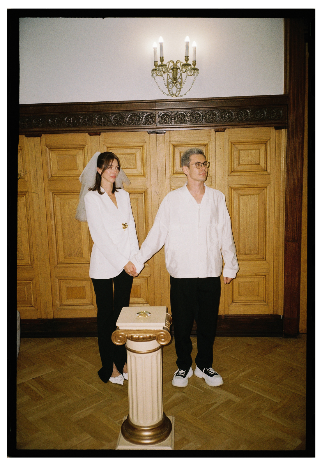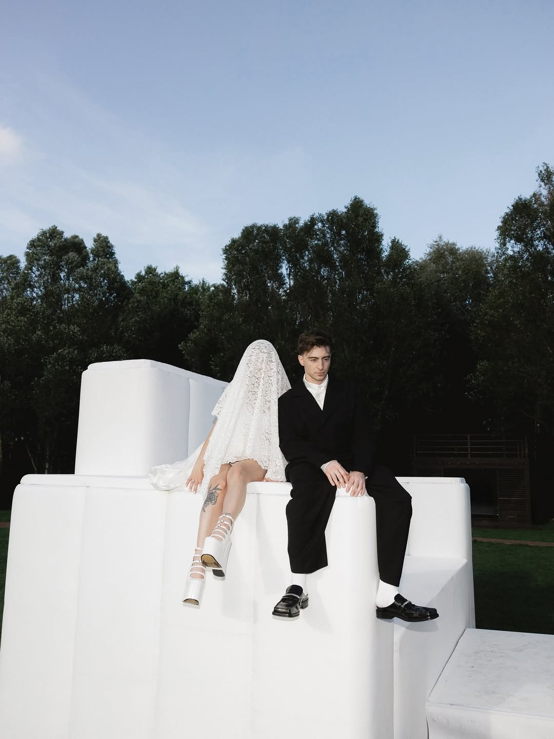 Ребята расписались в сентябре 2025 года, а основной праздник прошёл в отеле «Метрополь», кадры с которого мы всё ещё ждём. Помимо этого, у них было сразу четыре концептуальные съёмки. Одна из них прошла по знаковым локациям Петербурга: её главный замысел — воплощение русских традиций в современном прочтении, поэтому мы увидели и белого коня, и взлетающих голубей, и, конечно, классических лебедей на торте.