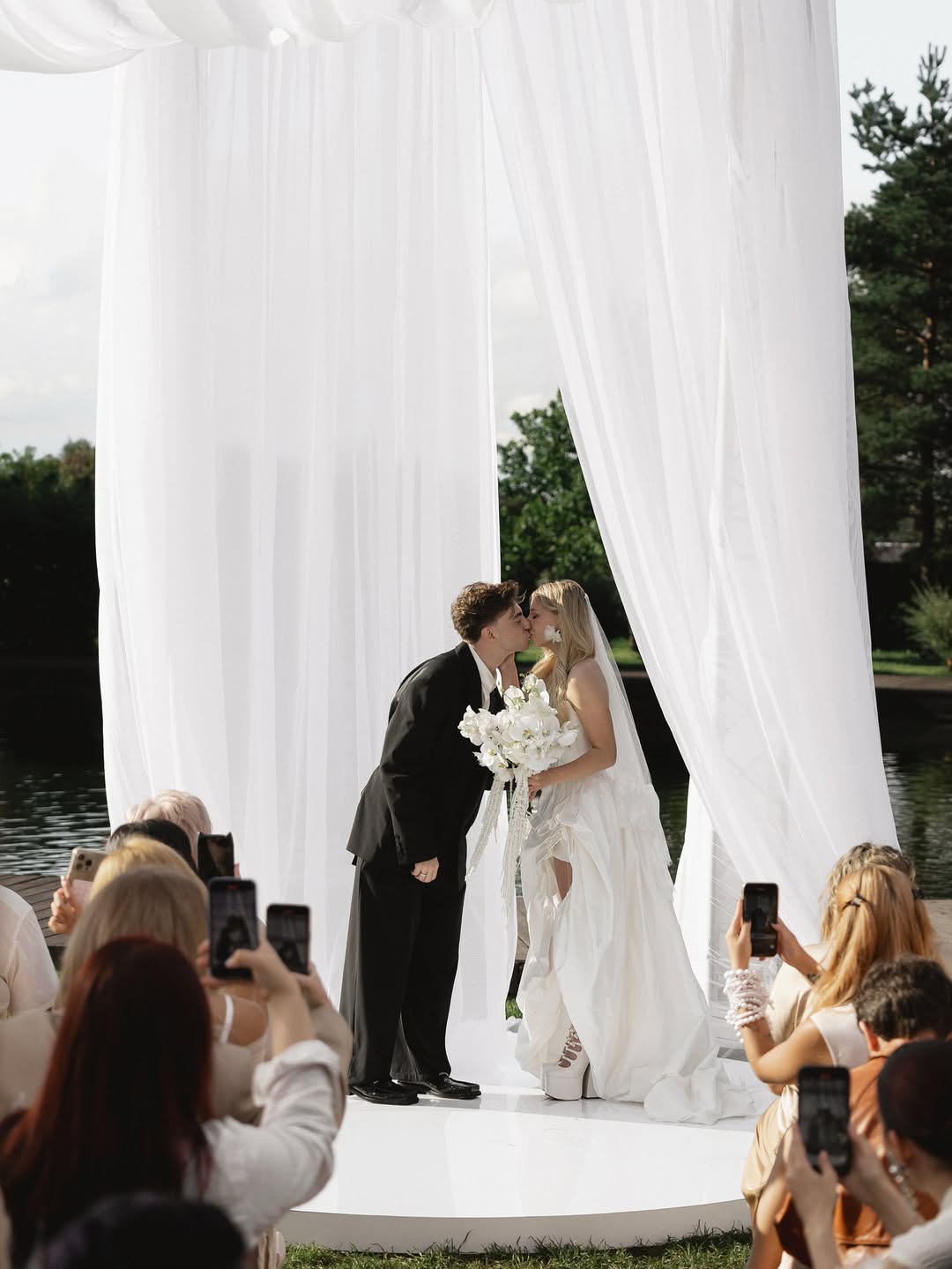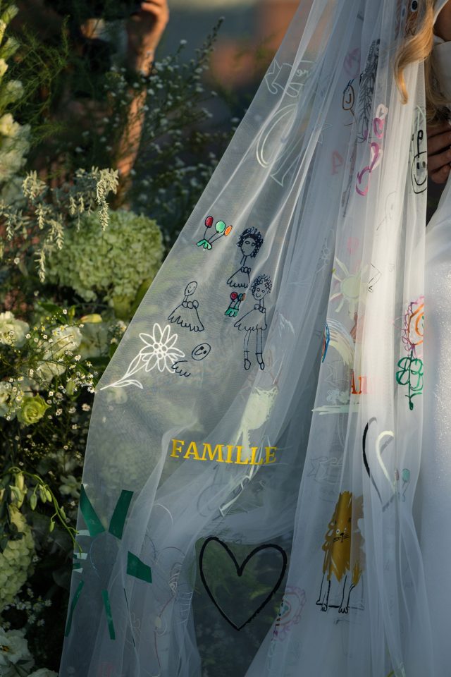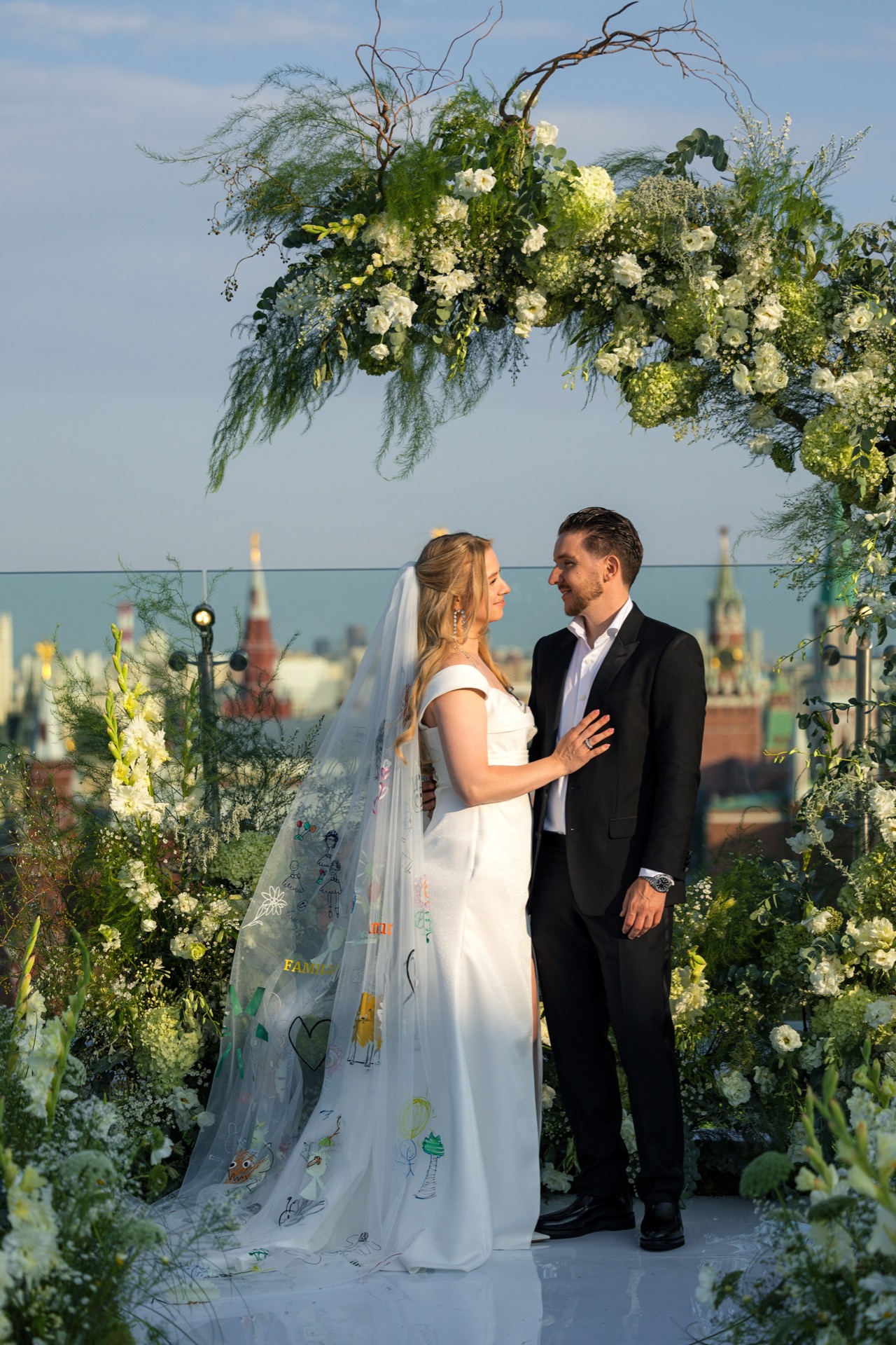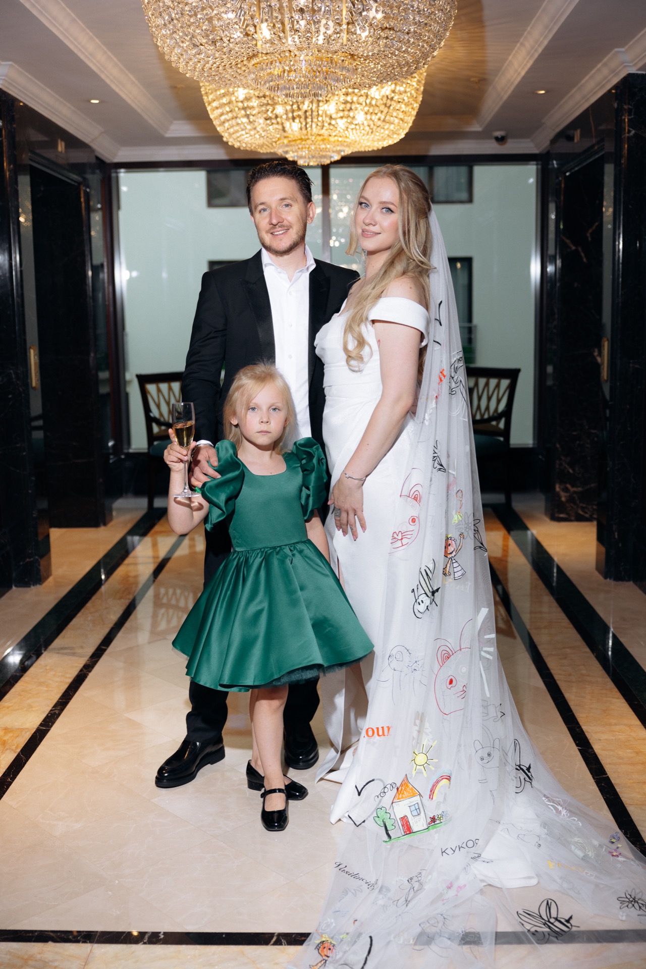 Церемония получилась невероятно трогательной: кольца паре вынесла их дочь, а сама Лена выбрала символичный образ с фатой, украшенной детскими рисунками, это тонкая отсылка к семье и их пути.