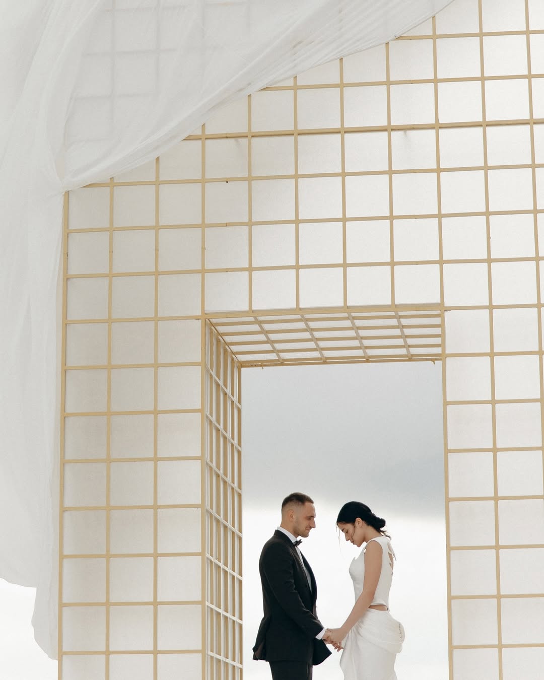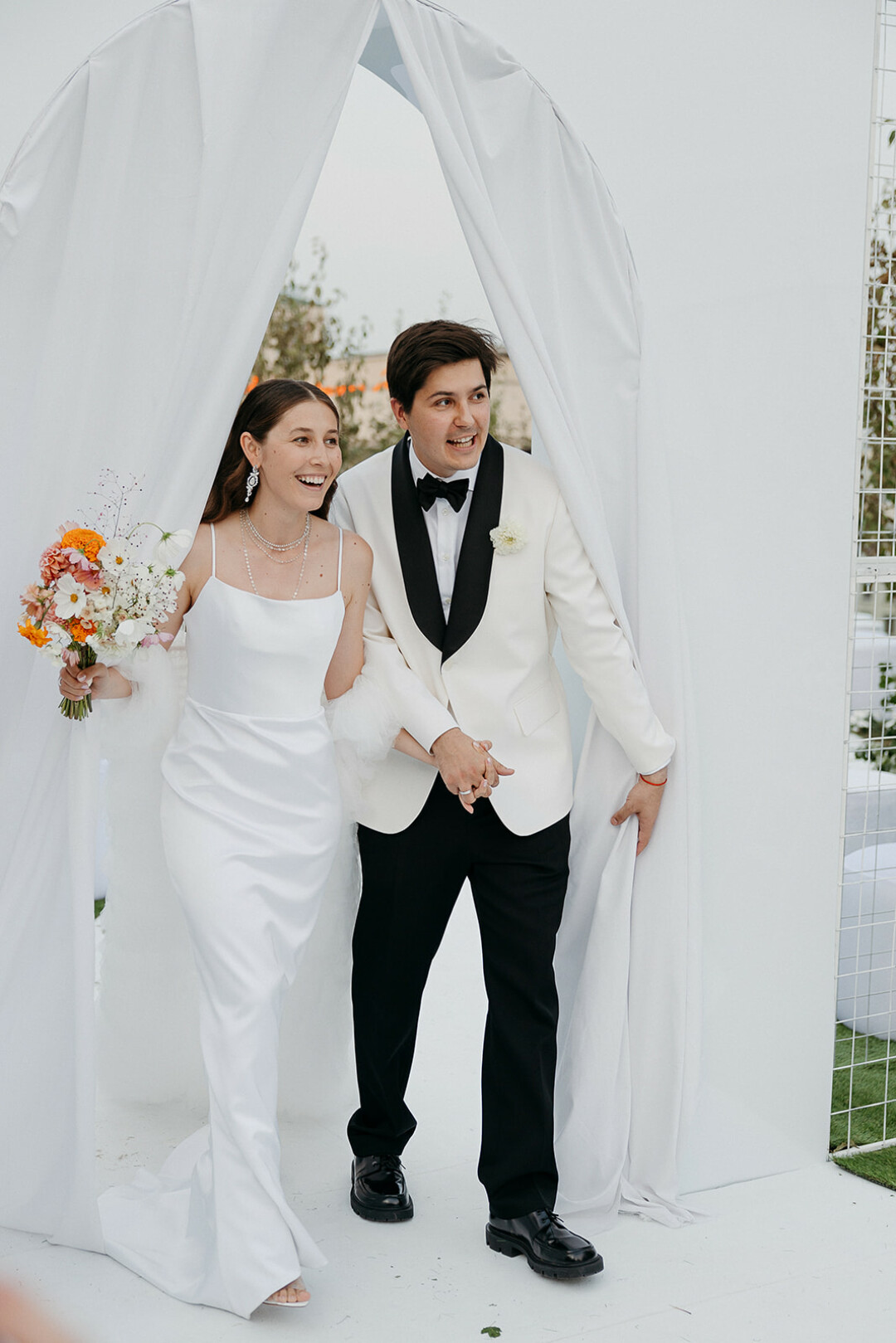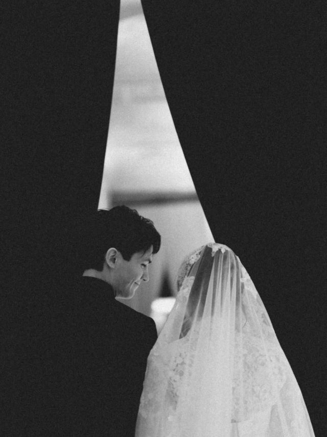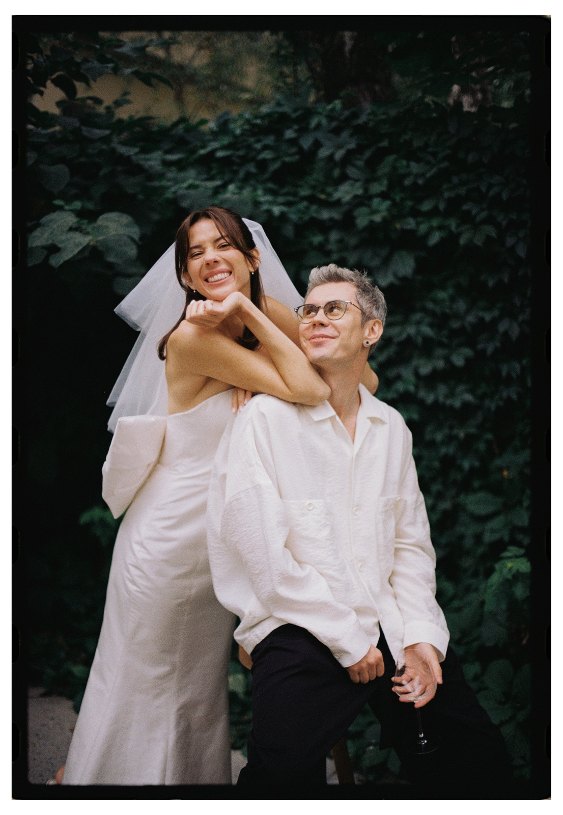 Церемония получилась невероятно трогательной: кольца паре вынесла их дочь, а сама Лена выбрала символичный образ с фатой, украшенной детскими рисунками, это тонкая отсылка к семье и их пути.