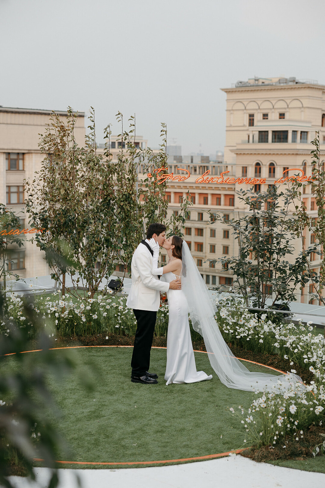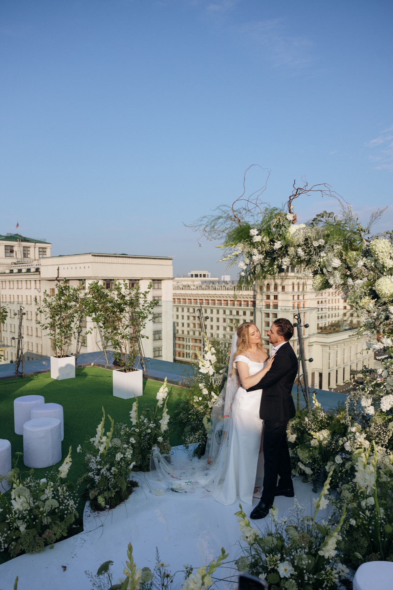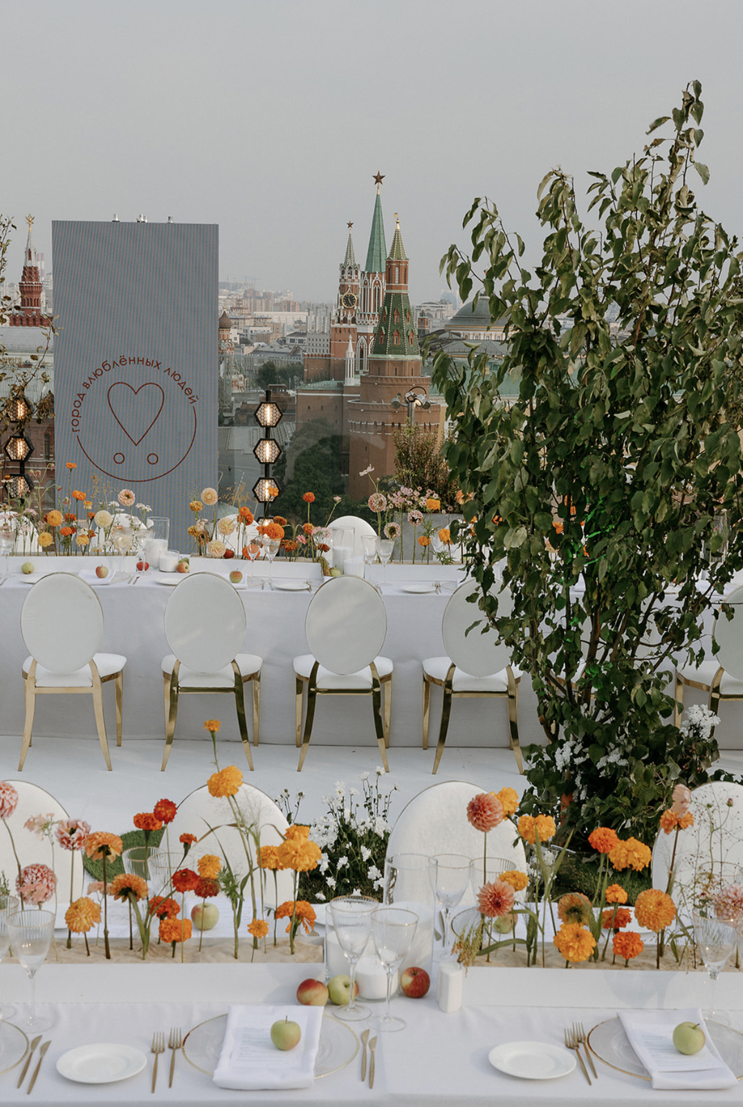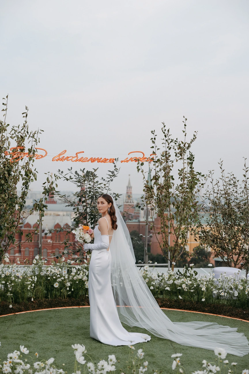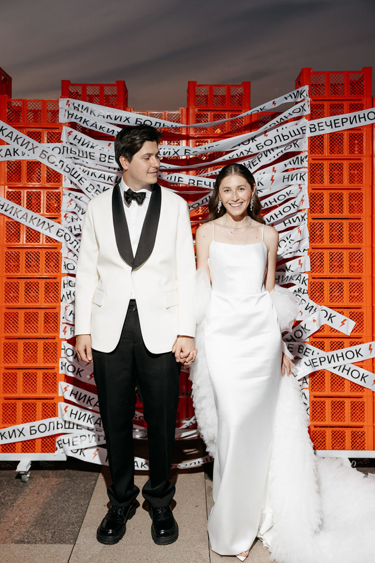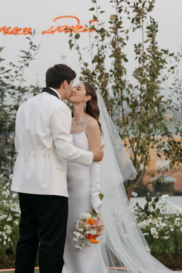Свадьба Саши и Жени прошла в легендарном The Carlton Moscow. На крыше отеля для них разбили настоящий сад с видом на Кремль — всё это было отсылкой к яблоневым садам и тёплой южной атмосфере Краснодарского края, откуда ребята родом.