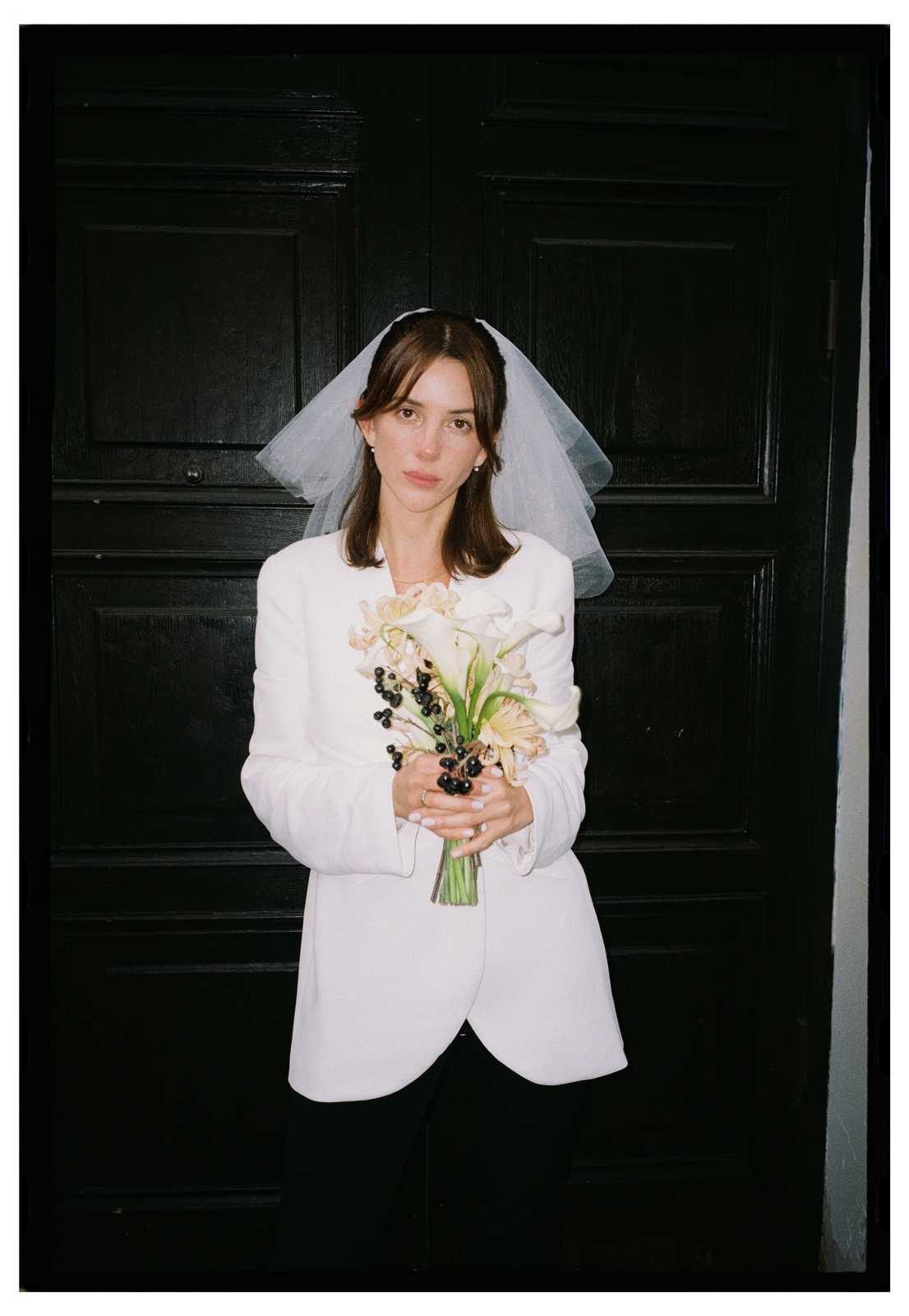 За этим последовала подготовка, которая была очень спонтанной, ведь даже образы для ЗАГСа ребята выбрали буквально за два дня до росписи. Кстати, образ невесты был далеко не классический: вместо привычного платья на Кате были чёрные брюки клёш и белый жакет. Особенно нас покорил букет невесты — каллы и ветви чёрной рябины.