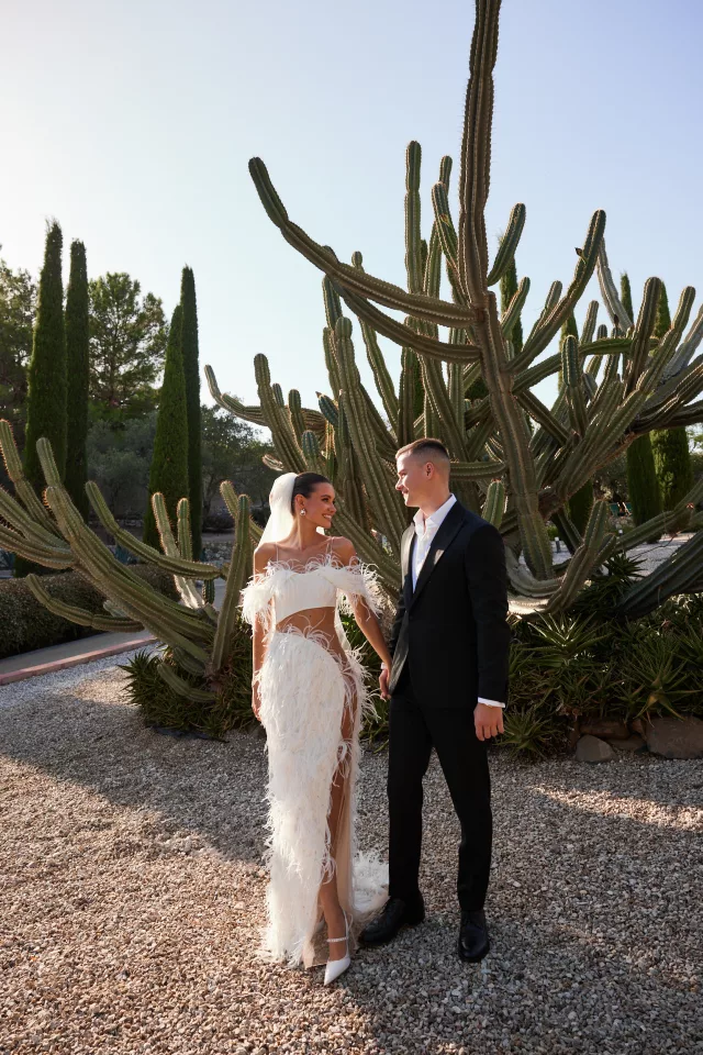 Церемония прошла в необычной зоне – на фоне огромного кактуса, который эффектно контрастировал с образом невесты. Катя поделилась, что «голое» платье, полностью украшенное перьями, сразу влюбило её в себя и стало точным отражением концепции свадьбы.