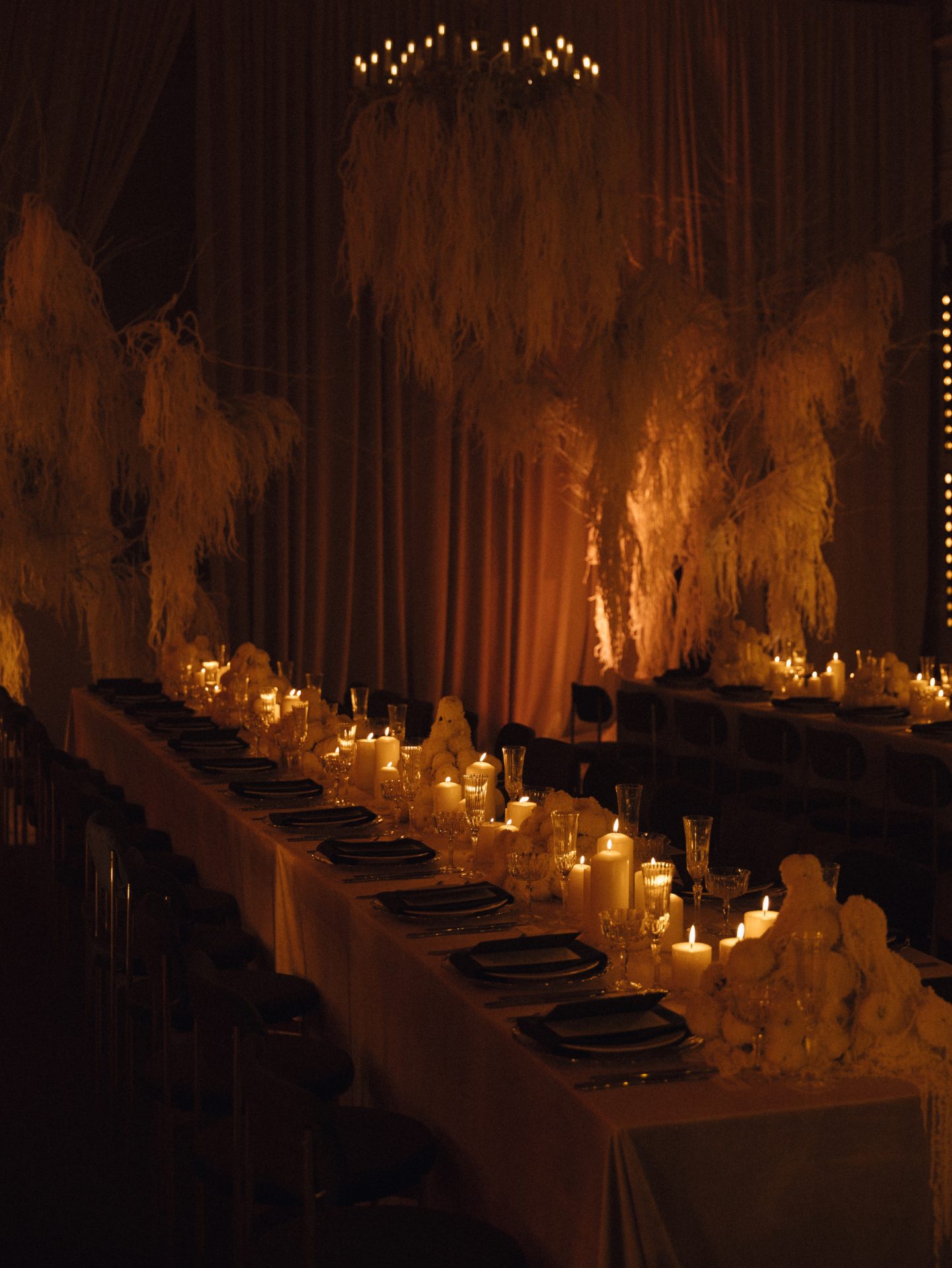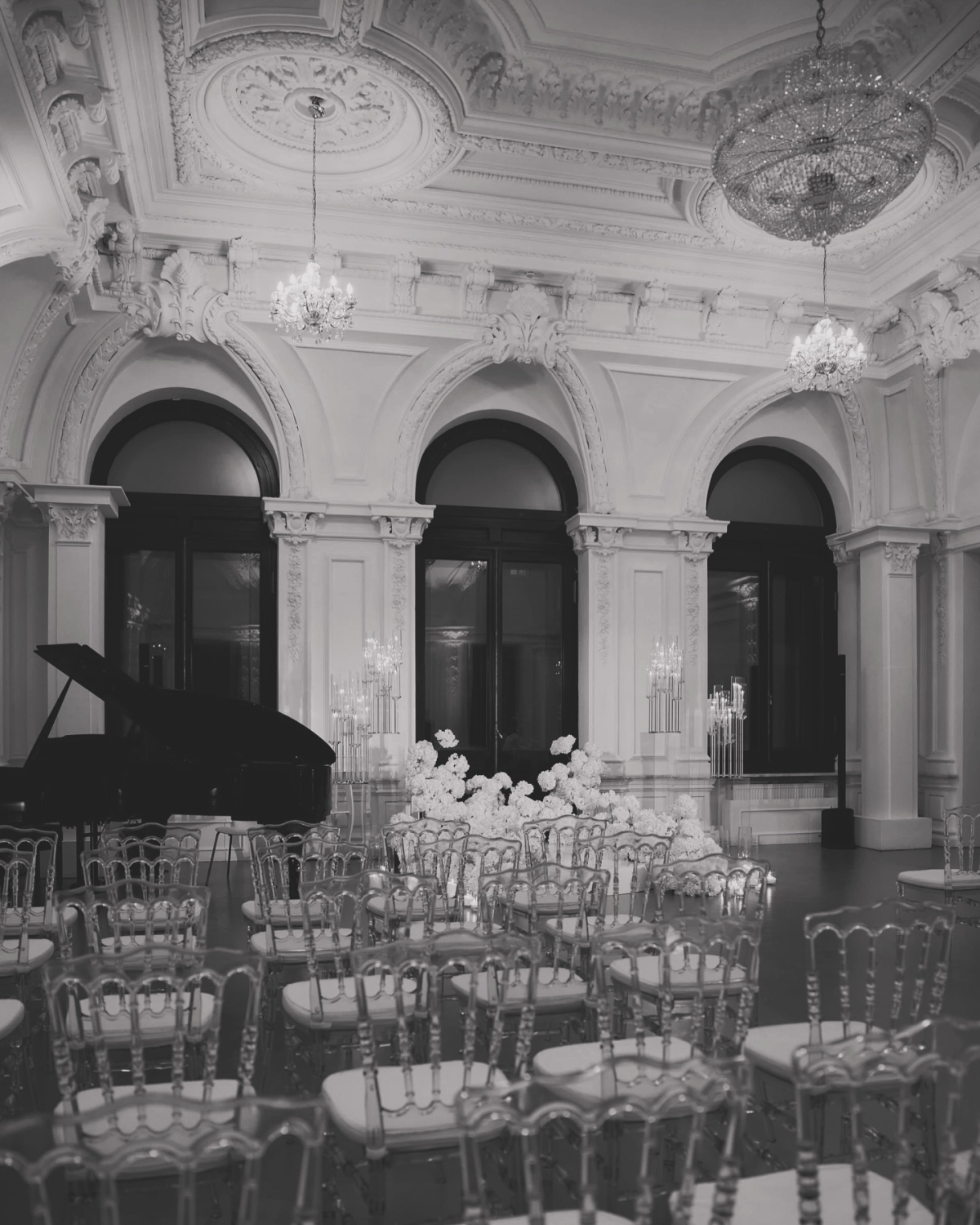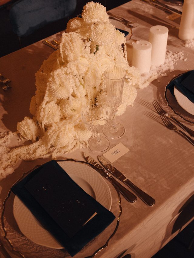 Праздничный ужин прошёл в особняке 19 века, а сама концепция торжества была пропитана волшебной зимней атмосферой: зона церемонии была украшена снежными тюльпанами, на столах разместились белоснежные амаранты и свечи, а центром декора стала проекция звёздного неба с созвездиями жениха и невесты. Одним словом, вау! Кстати, организацией этого праздника тоже занимались Feerique Event.