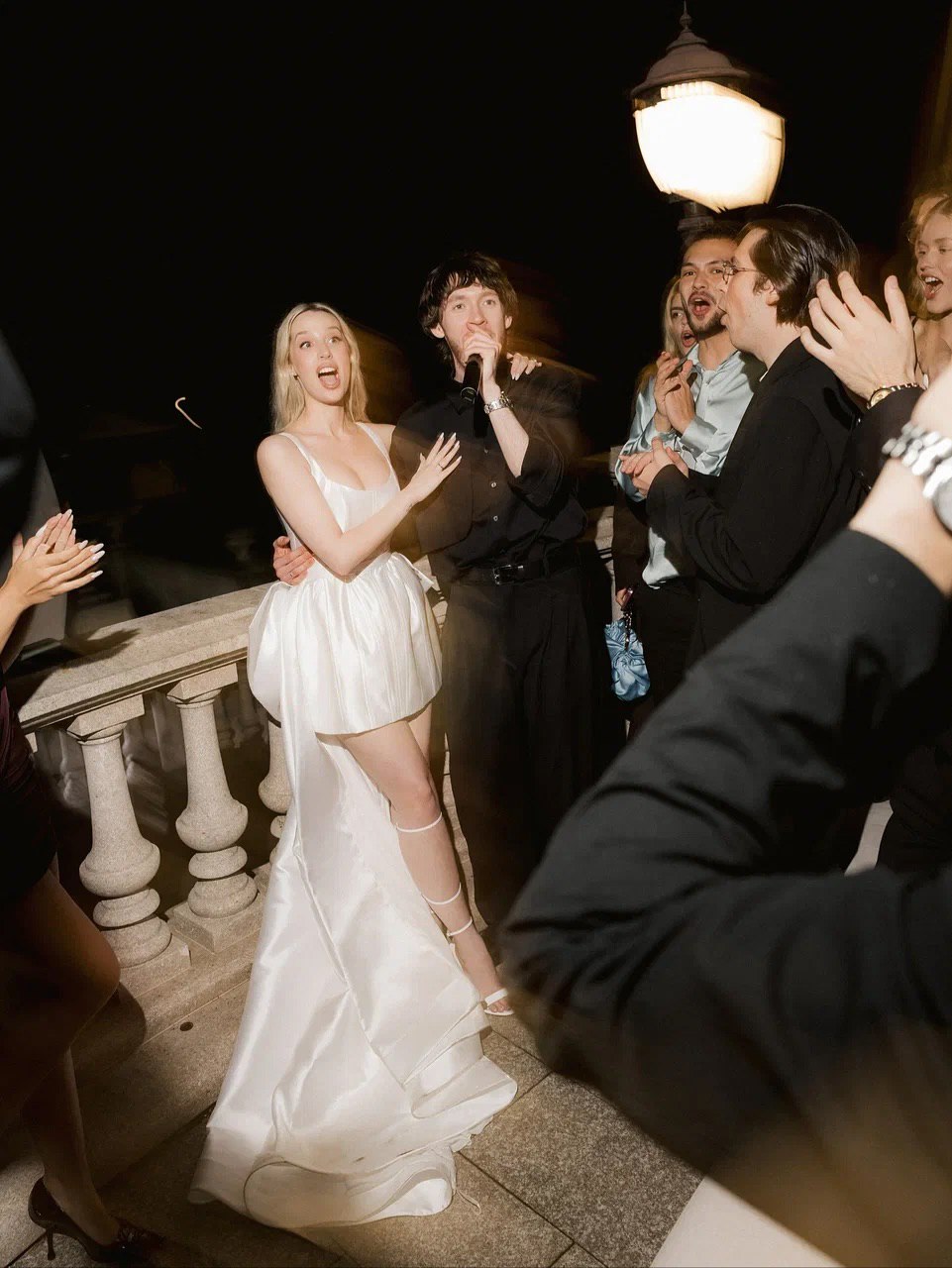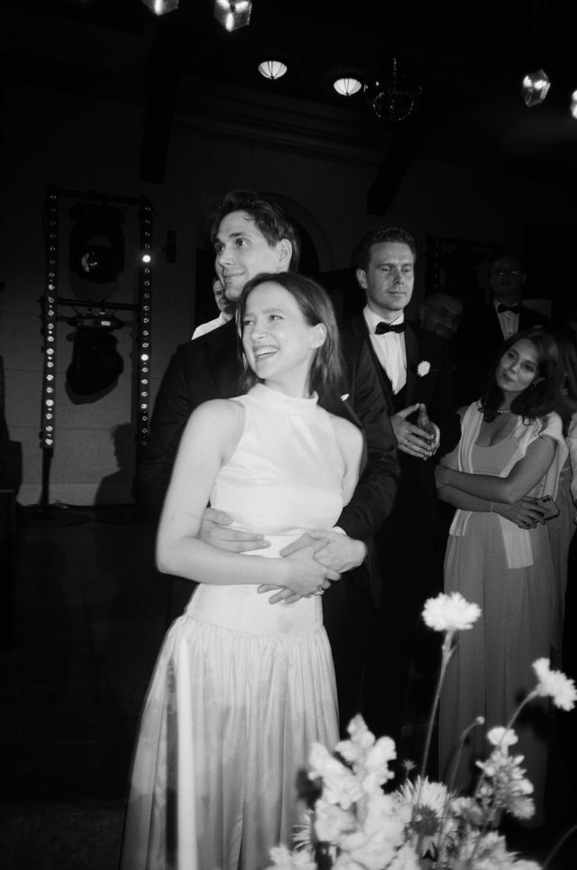 Завершился вечер свадебной вечеринкой, где пара исполнила свой первый танец под песню «Хлопья летят наверх».