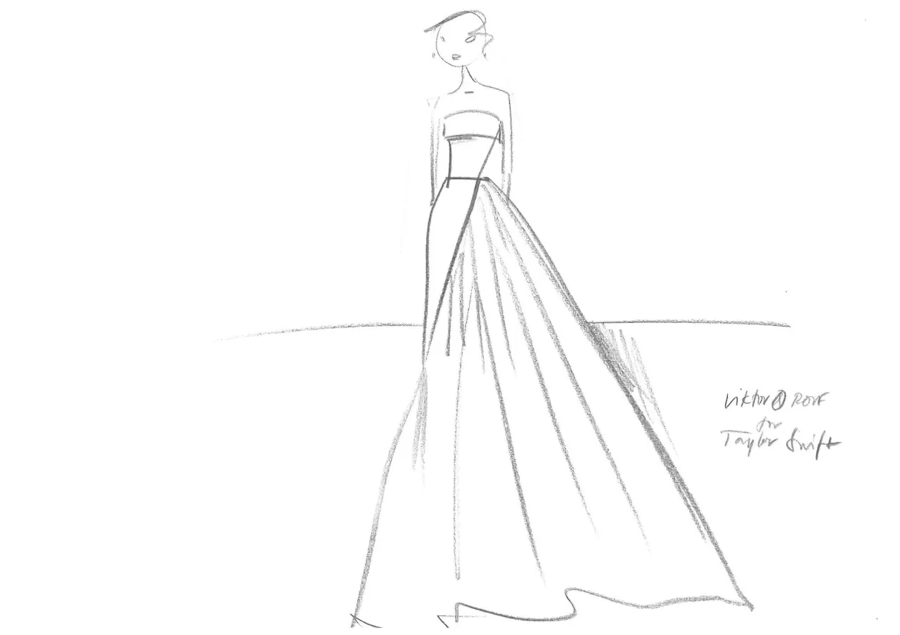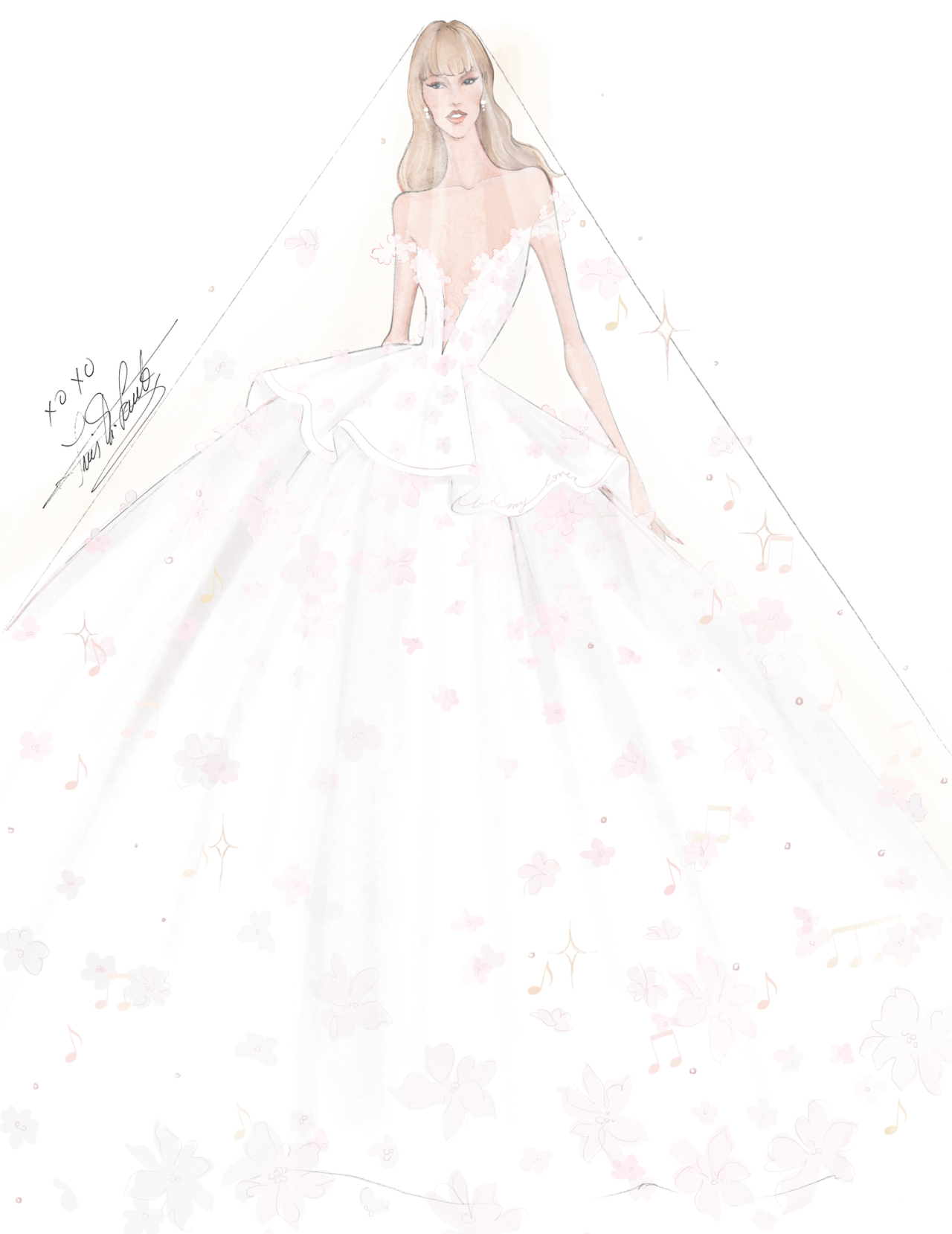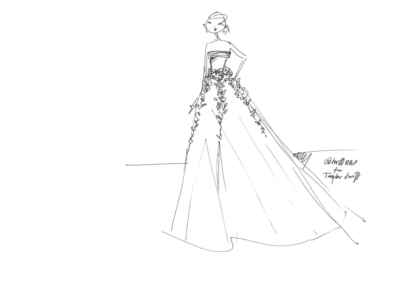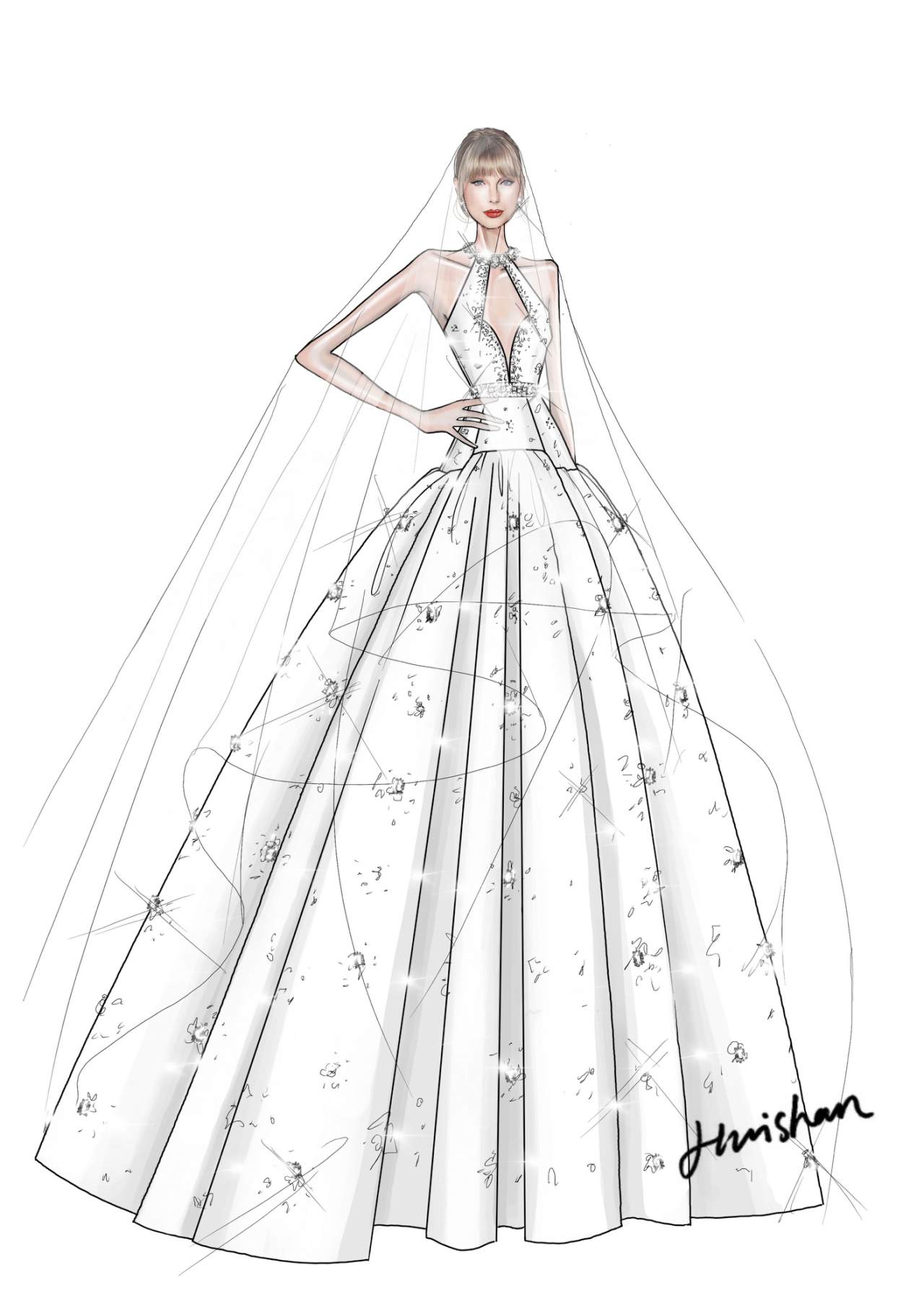 Дизайнер представила три эскиза свадебных платьев, выполненных в стиле роскошной и драматичной классики. Все три эскиза — произведения искусства, созданные для невесты, мечтающей о королевском, театральном и безупречно элегантном образе. Все образы отражают разные черты Тейлор — современная и уверенная в себе невеста, невеста-мечтательница словно из сказки и классическая невеста-принцесса, которая не боится быть в центре внимания.