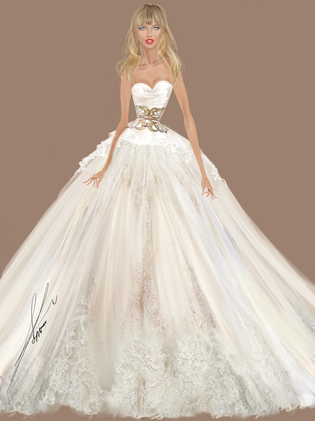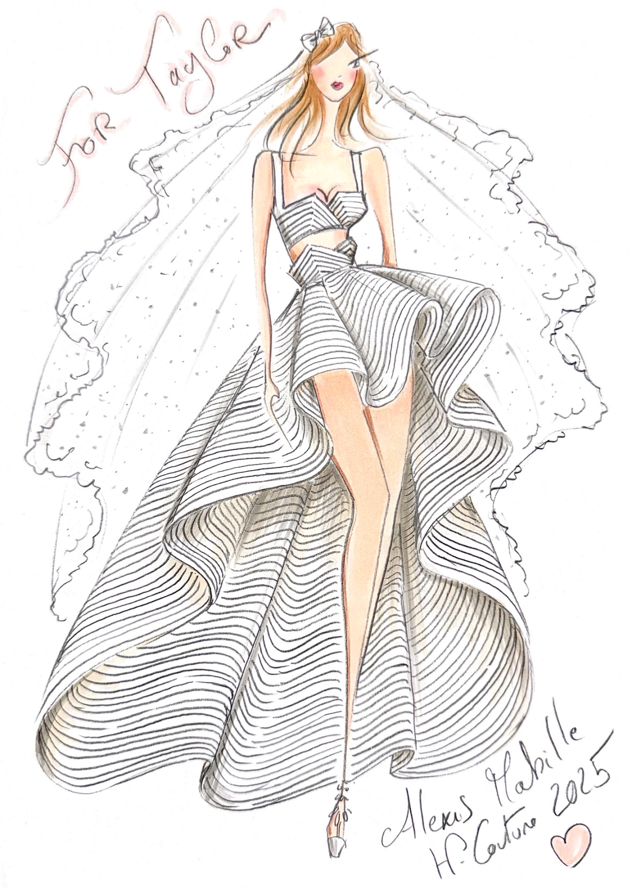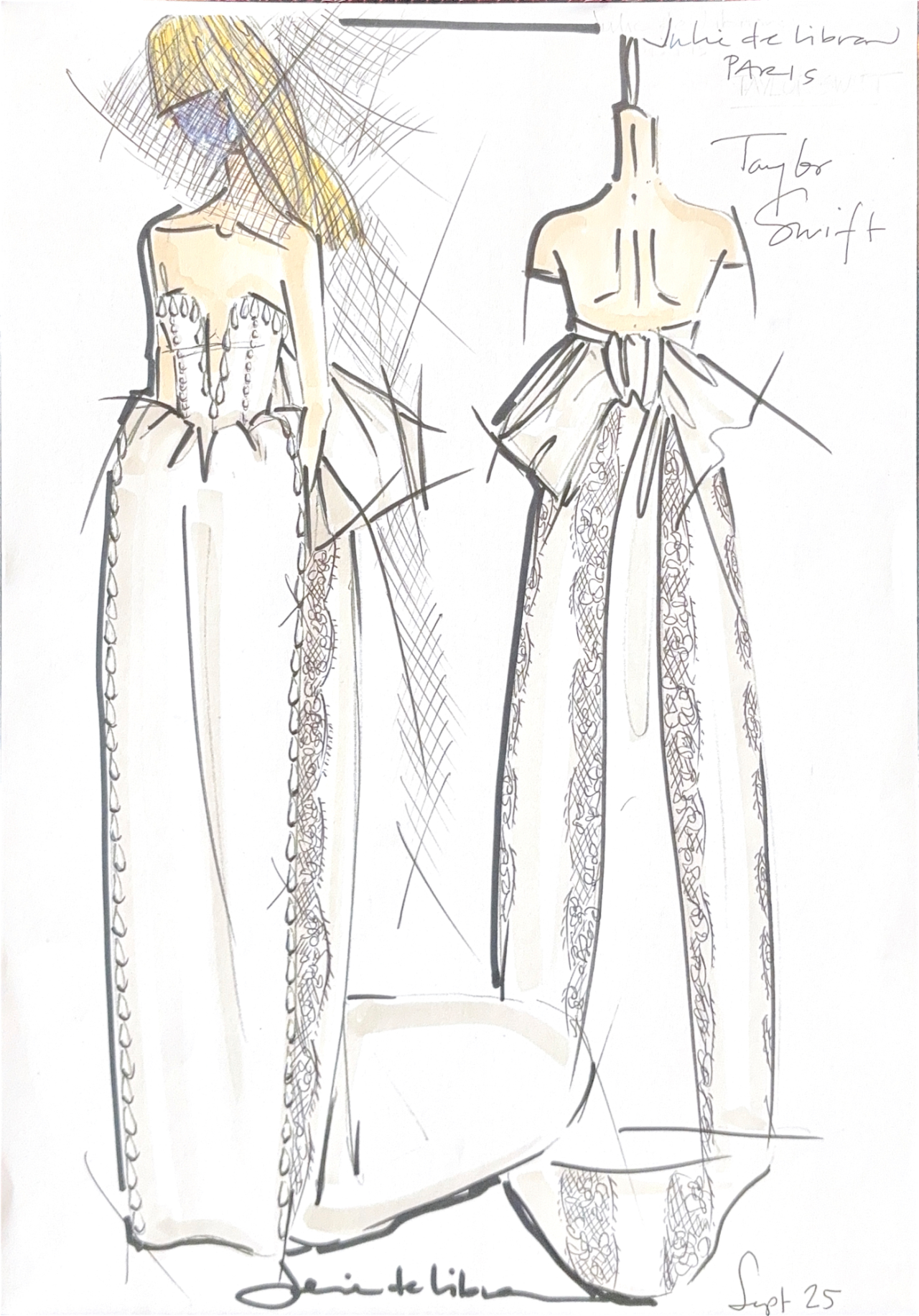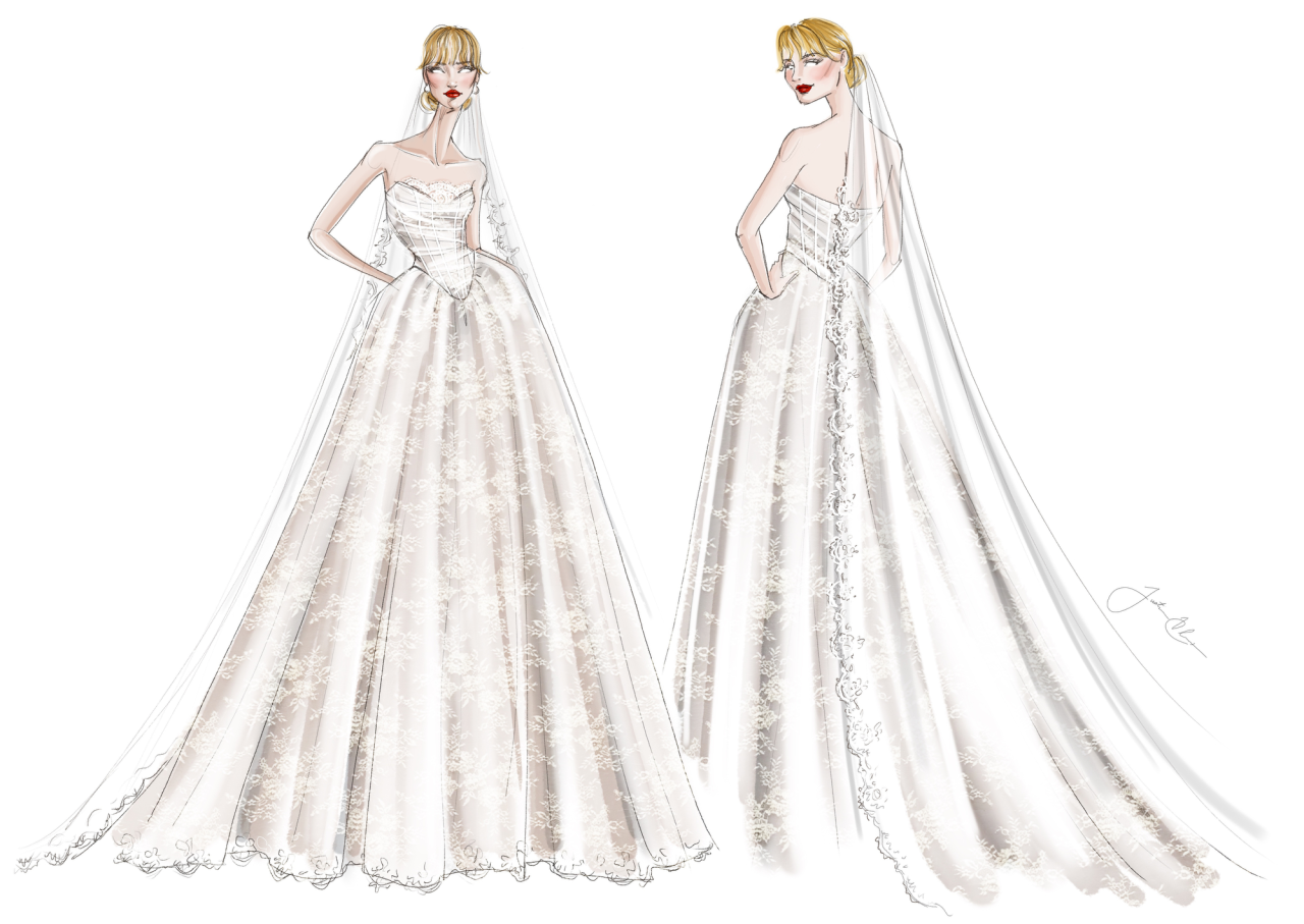 Дизайнер представила три эскиза свадебных платьев, выполненных в стиле роскошной и драматичной классики. Все три эскиза — произведения искусства, созданные для невесты, мечтающей о королевском, театральном и безупречно элегантном образе. Все образы отражают разные черты Тейлор — современная и уверенная в себе невеста, невеста-мечтательница словно из сказки и классическая невеста-принцесса, которая не боится быть в центре внимания.