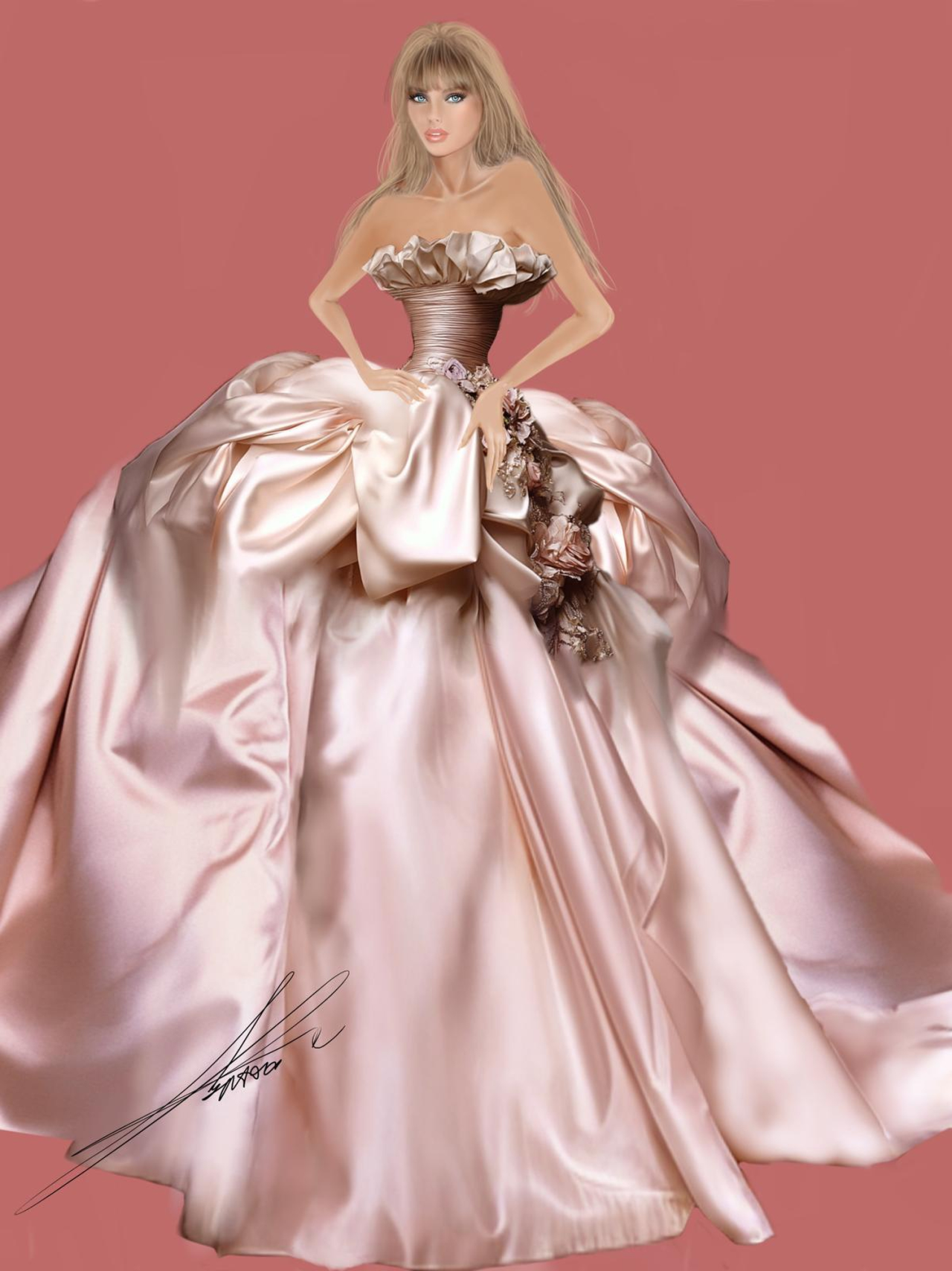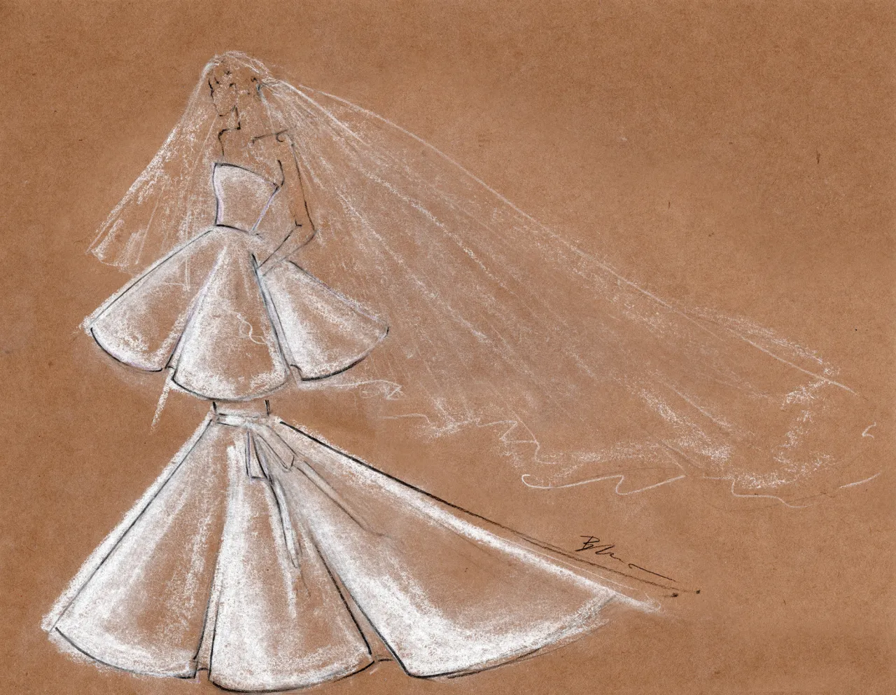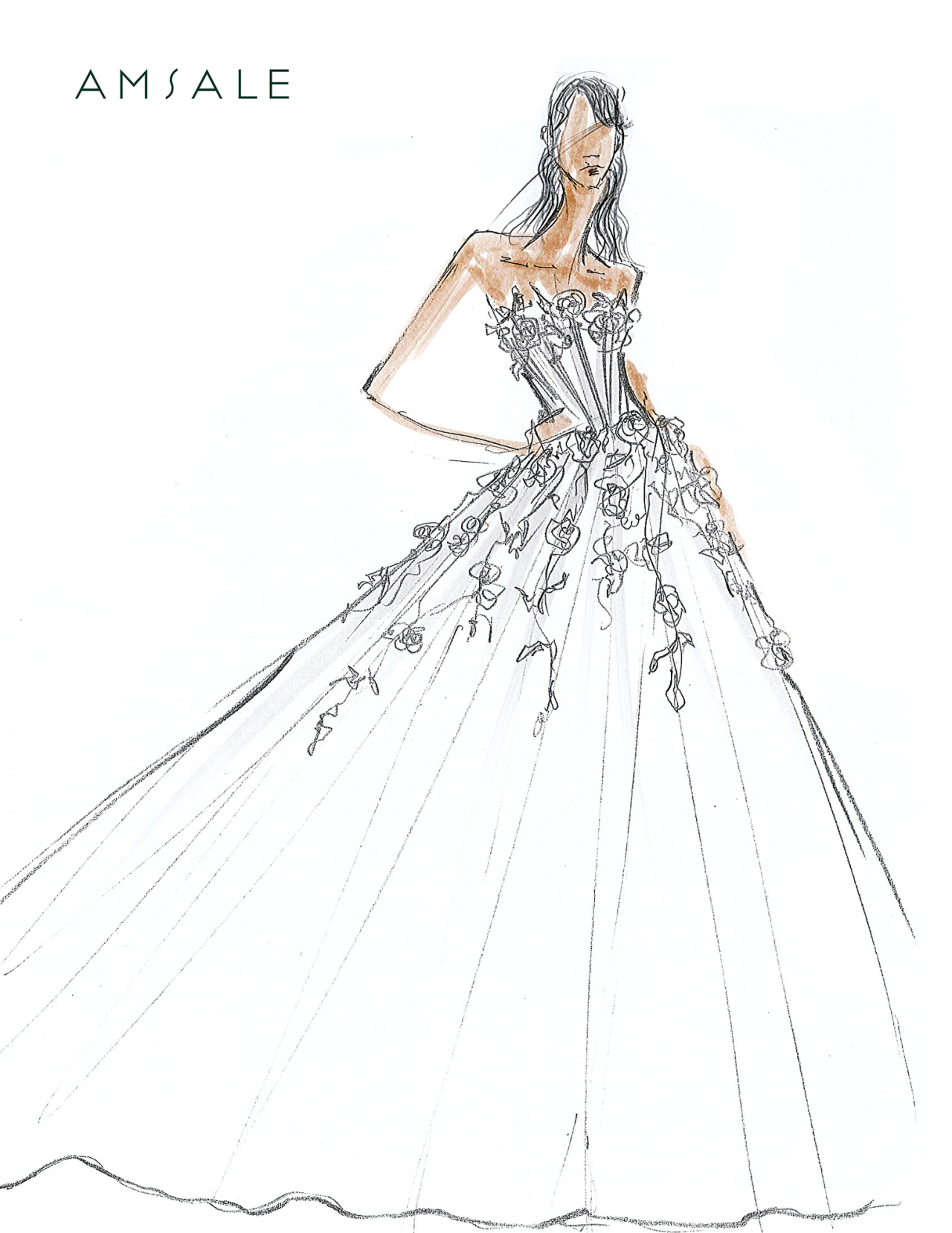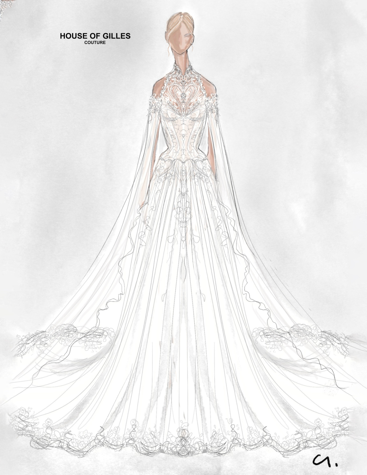 Дизайнер представила три эскиза свадебных платьев, выполненных в стиле роскошной и драматичной классики. Все три эскиза — произведения искусства, созданные для невесты, мечтающей о королевском, театральном и безупречно элегантном образе. Все образы отражают разные черты Тейлор — современная и уверенная в себе невеста, невеста-мечтательница словно из сказки и классическая невеста-принцесса, которая не боится быть в центре внимания.