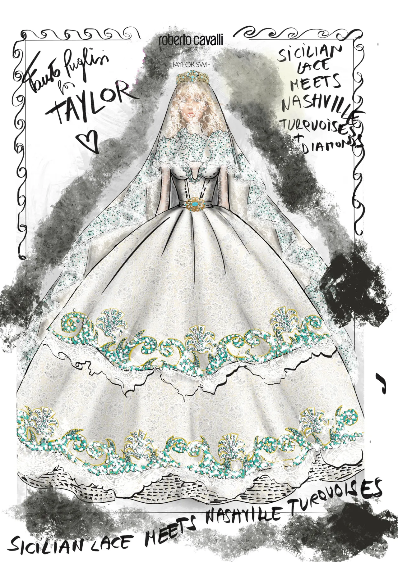 Фаусто Пульизи, дизайнера дома Roberto Cavalli рассказал: «Для Тейлор я придумал свадебный образ, в котором использовал сицилийское кружево, макраме и бирюзовые камни в сочетании с кантри-духом родины Тейлор — Нэшвилла».