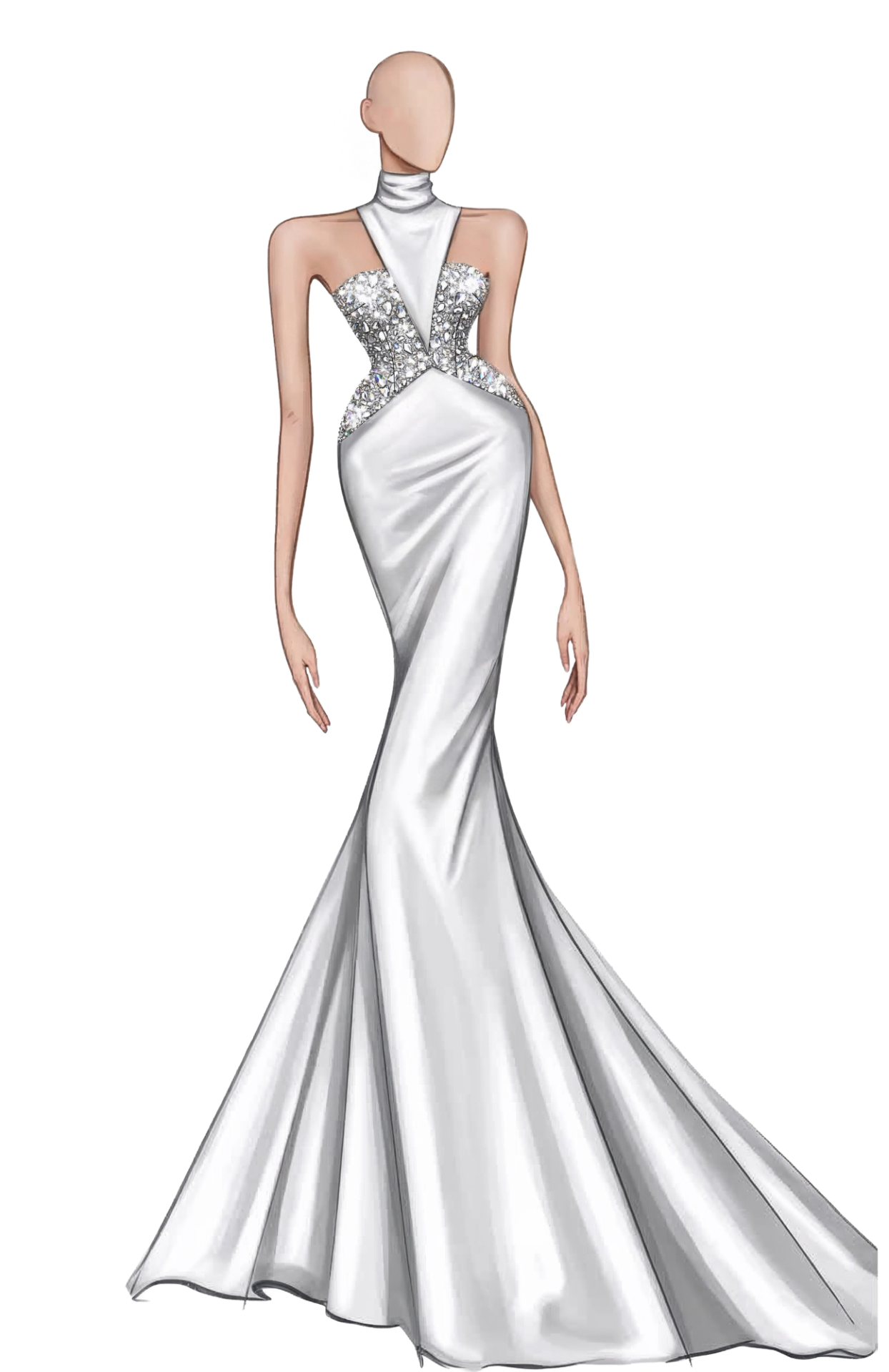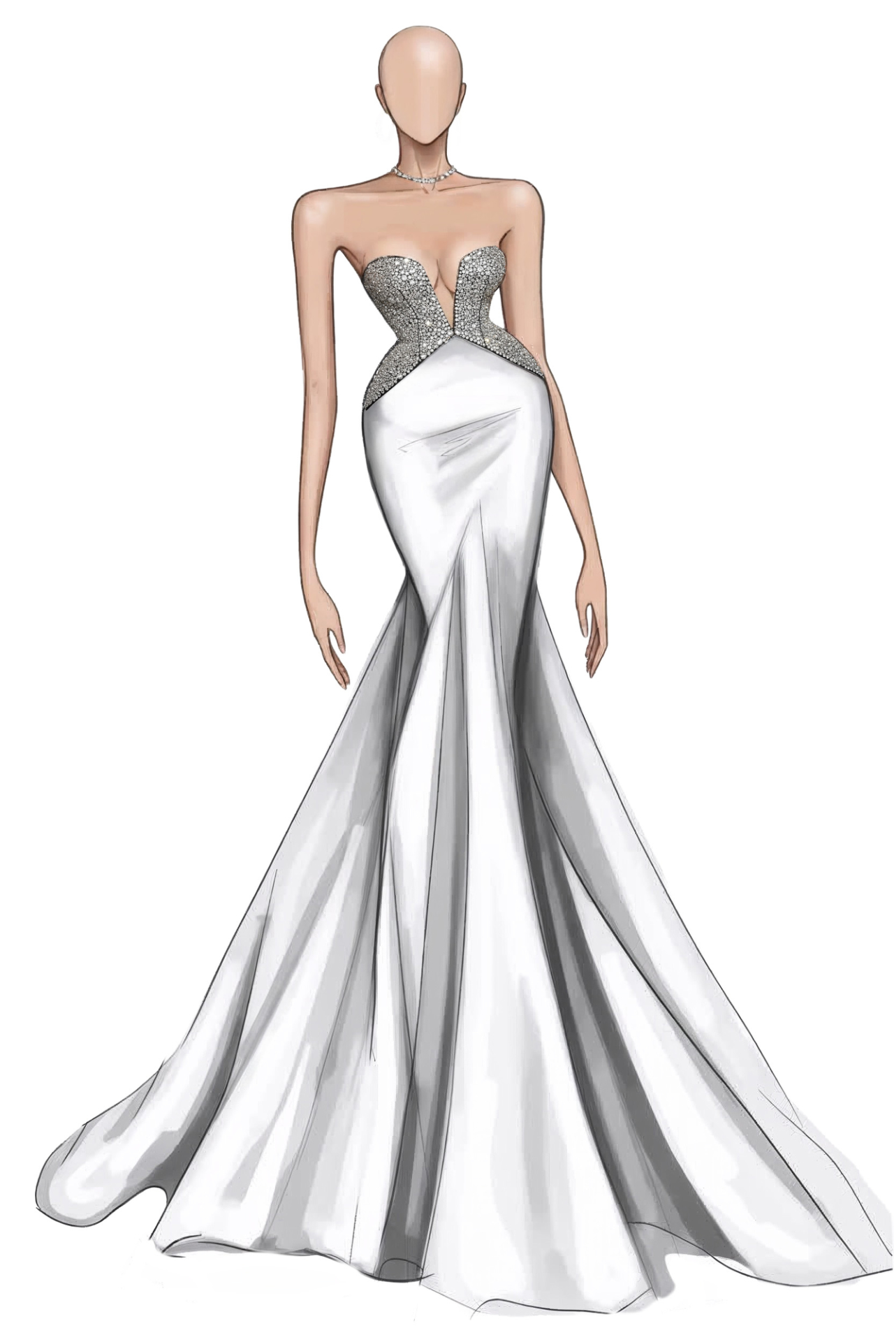 Дизайнер представил два эскиза платья. Оба платья отличаются изысканной простотой, богатой текстурой и драматическим декором из кристаллов. Дизайнер подчёркивает, что настоящая роскошь не в пышности, а в деталях, в гармонии линий и в способности подчеркнуть красоту певицы.