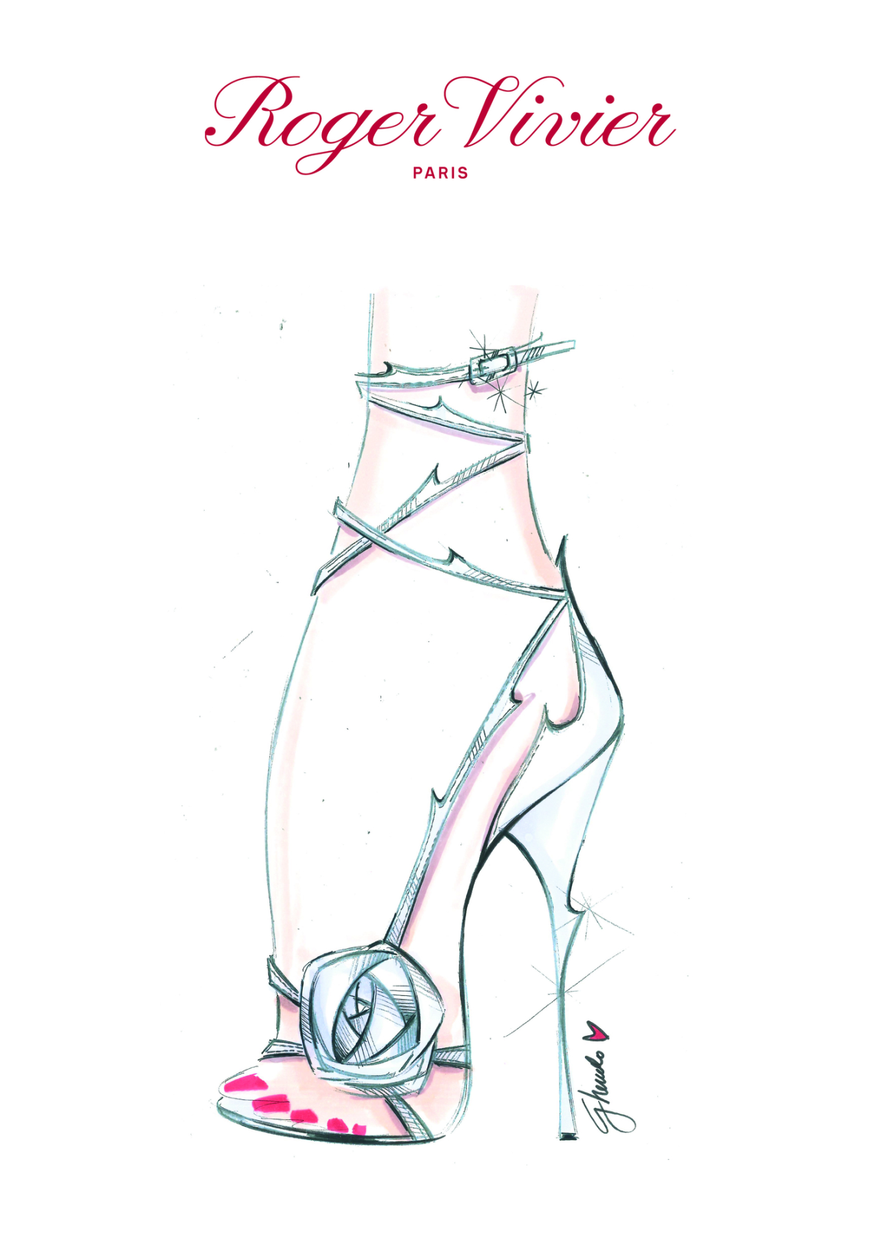 Дизайнер Roger Vivier представил эскиз свадебных туфель для поп-иконы. Босоножки на шпильке с розой и тонкие ленты с шипами выглядят не просто изысканно, но и добавляют индивидуальности, отражая нежный, но в то же время сильный характер Тейлор.