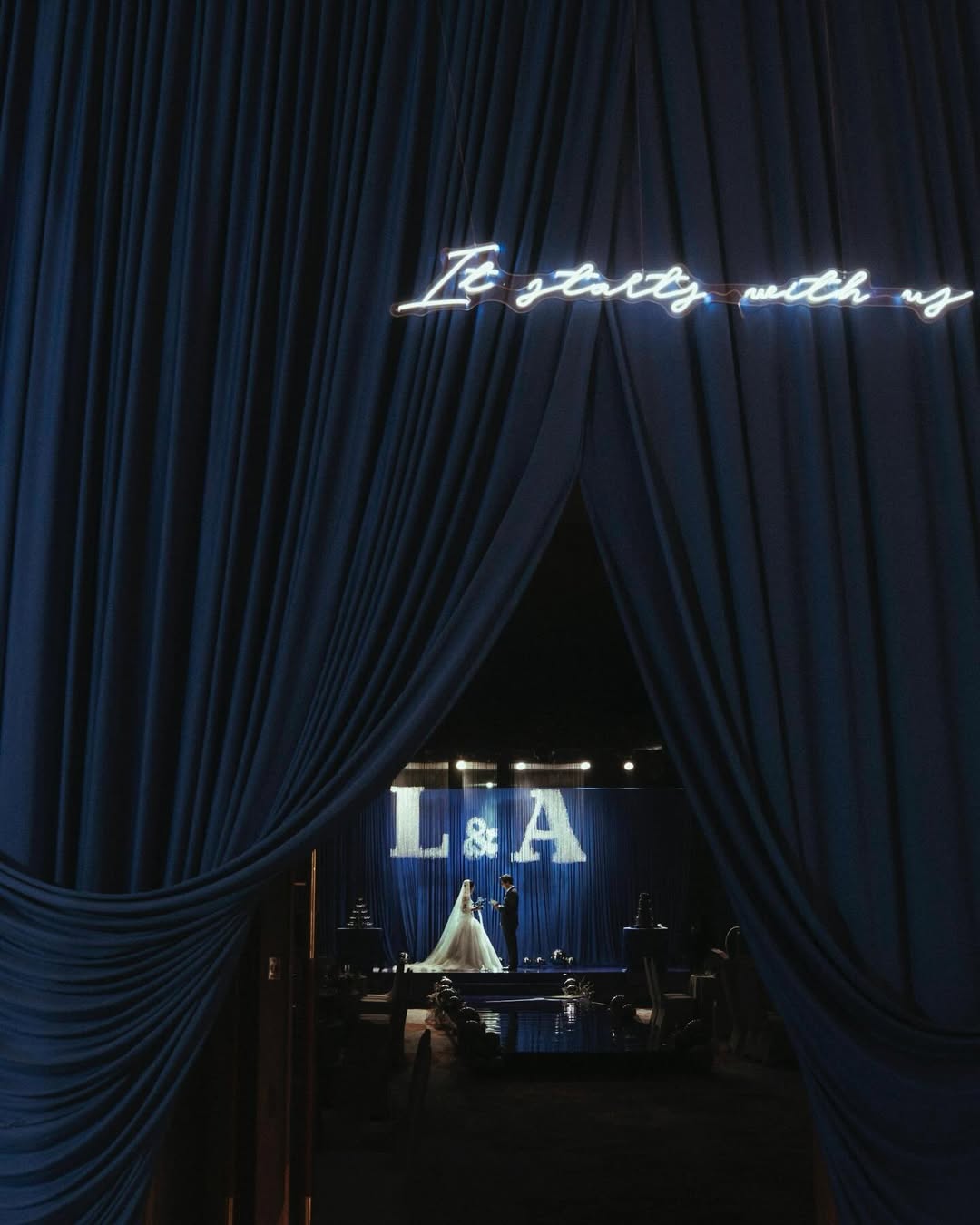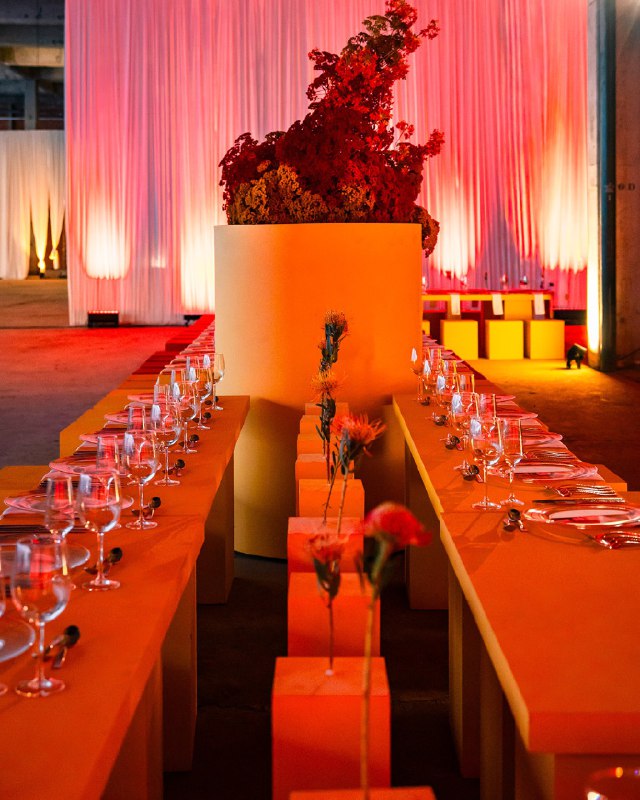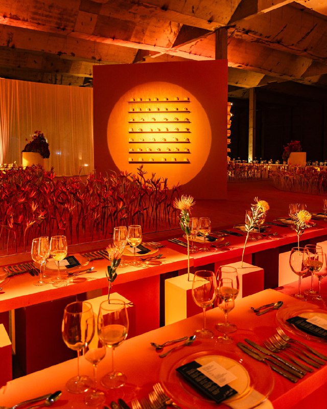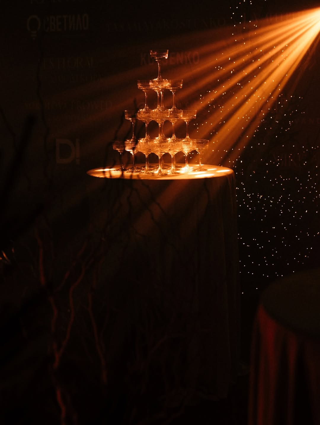 В этой свадьбе ключевым приёмом стала работа со светом, который имитировал закат, наполняя зал глубиной и живым теплом.
