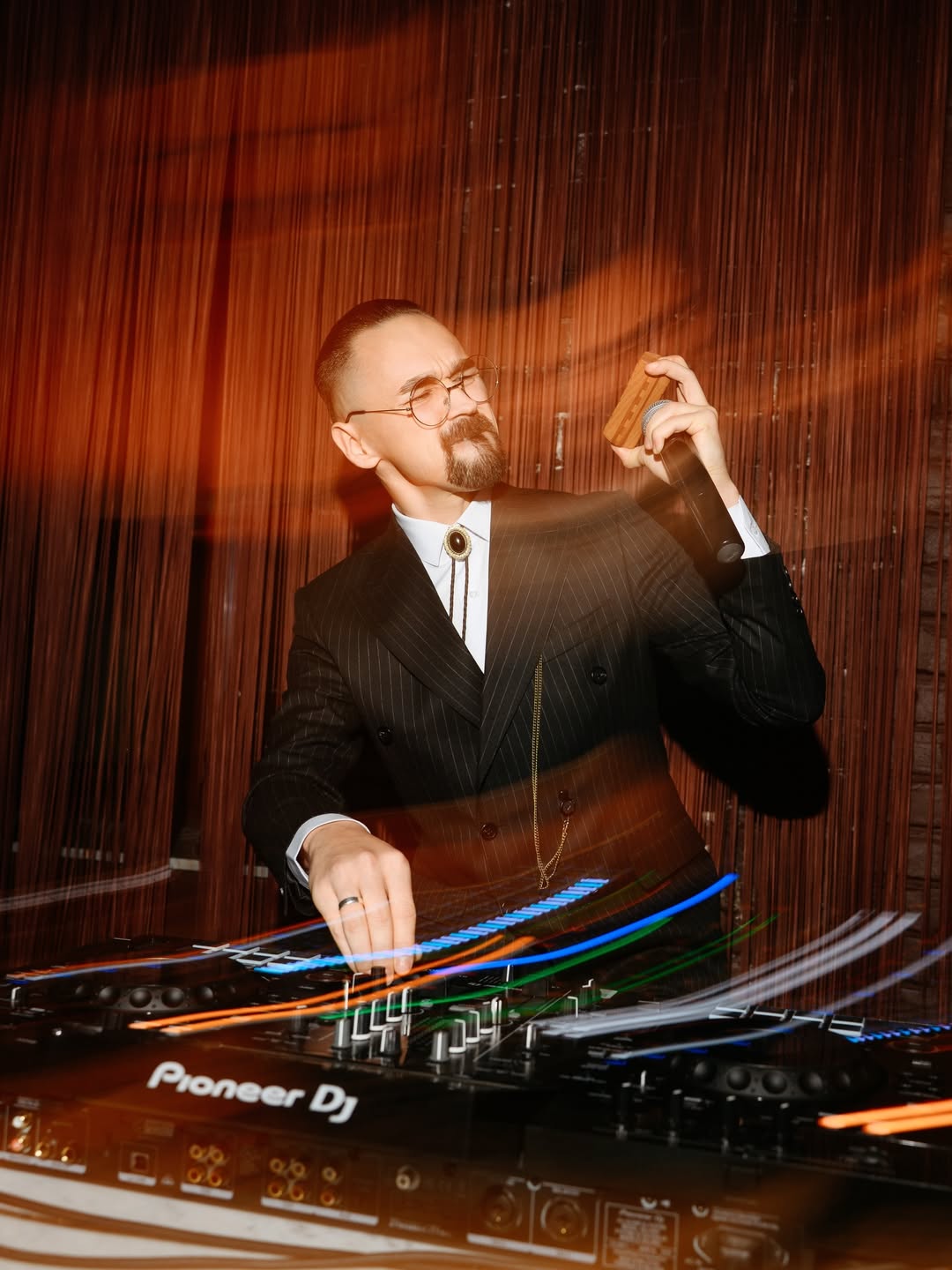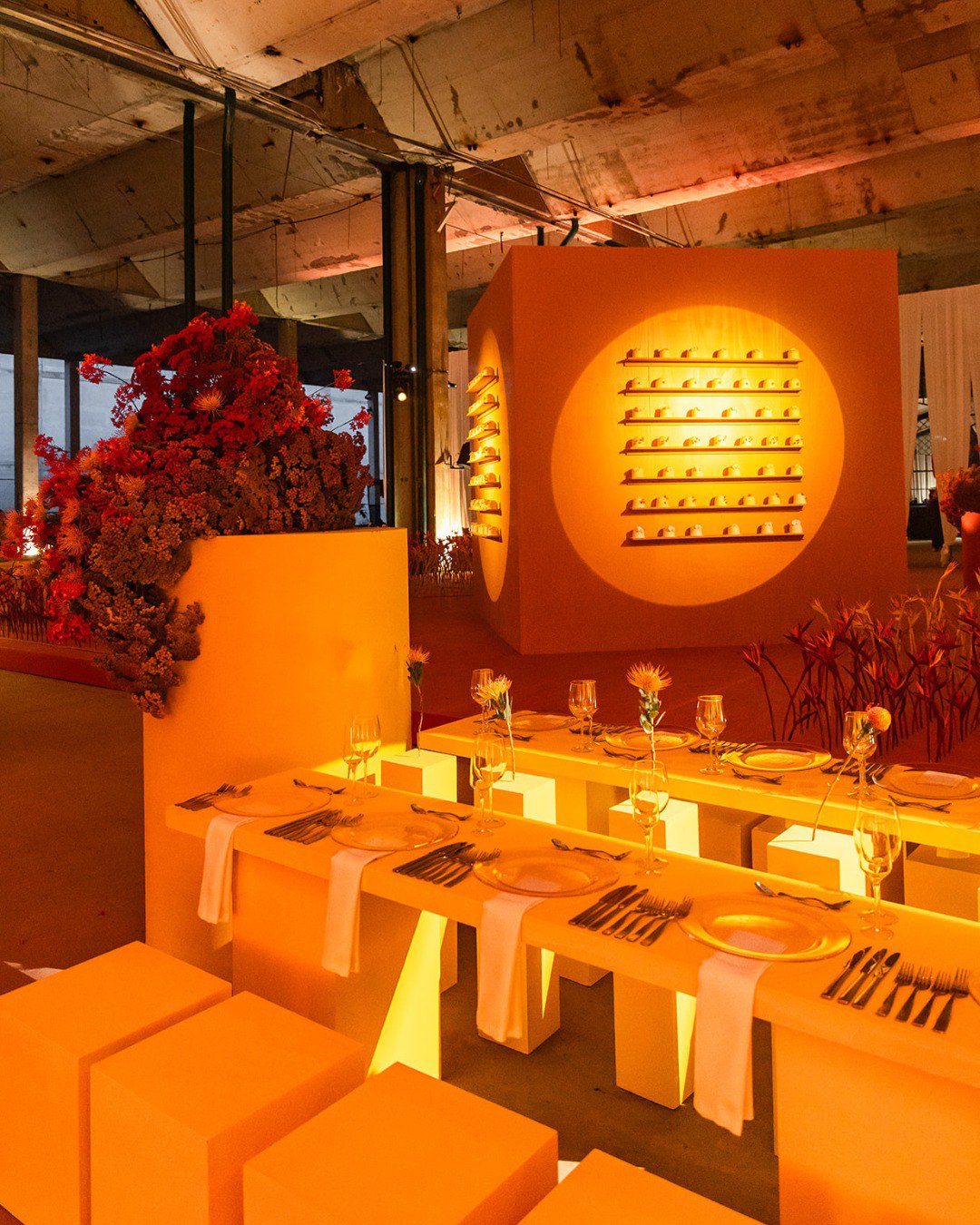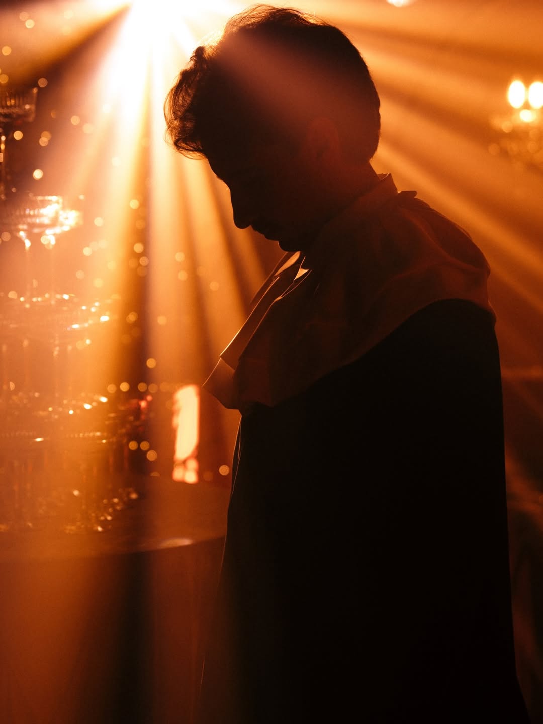 В этой свадьбе ключевым приёмом стала работа со светом, который имитировал закат, наполняя зал глубиной и живым теплом.