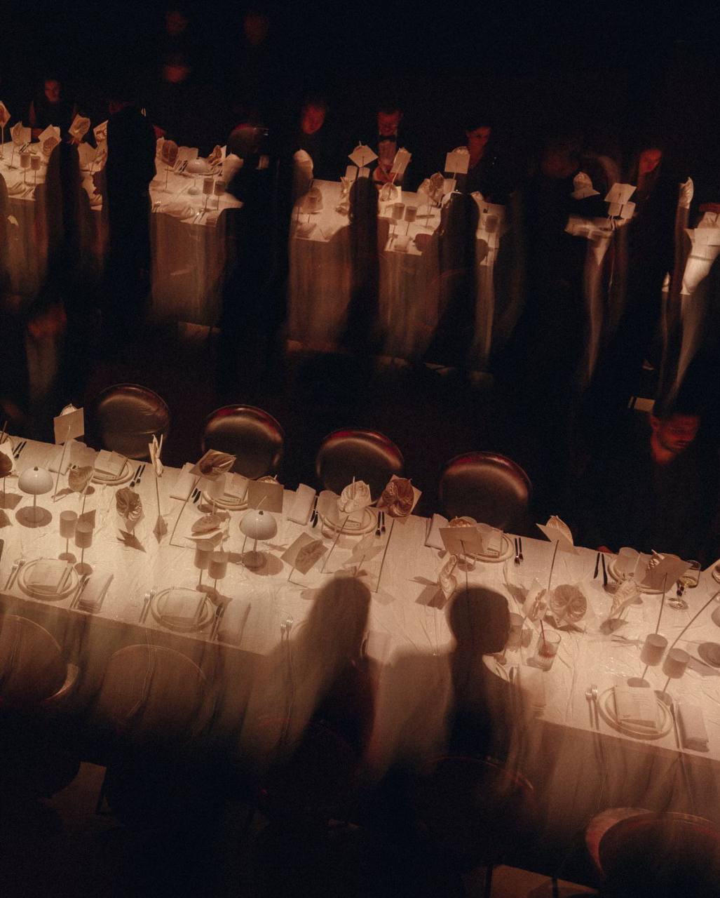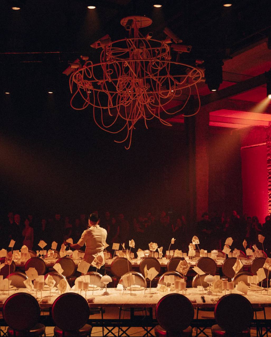 Вся флористика и детали были выкрашены в белый, а над столами висела динамическая люстра со встроенными лазерами, которая создавала магический эффект в затемнённом пространстве. Однозначно вау-идея!