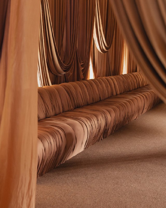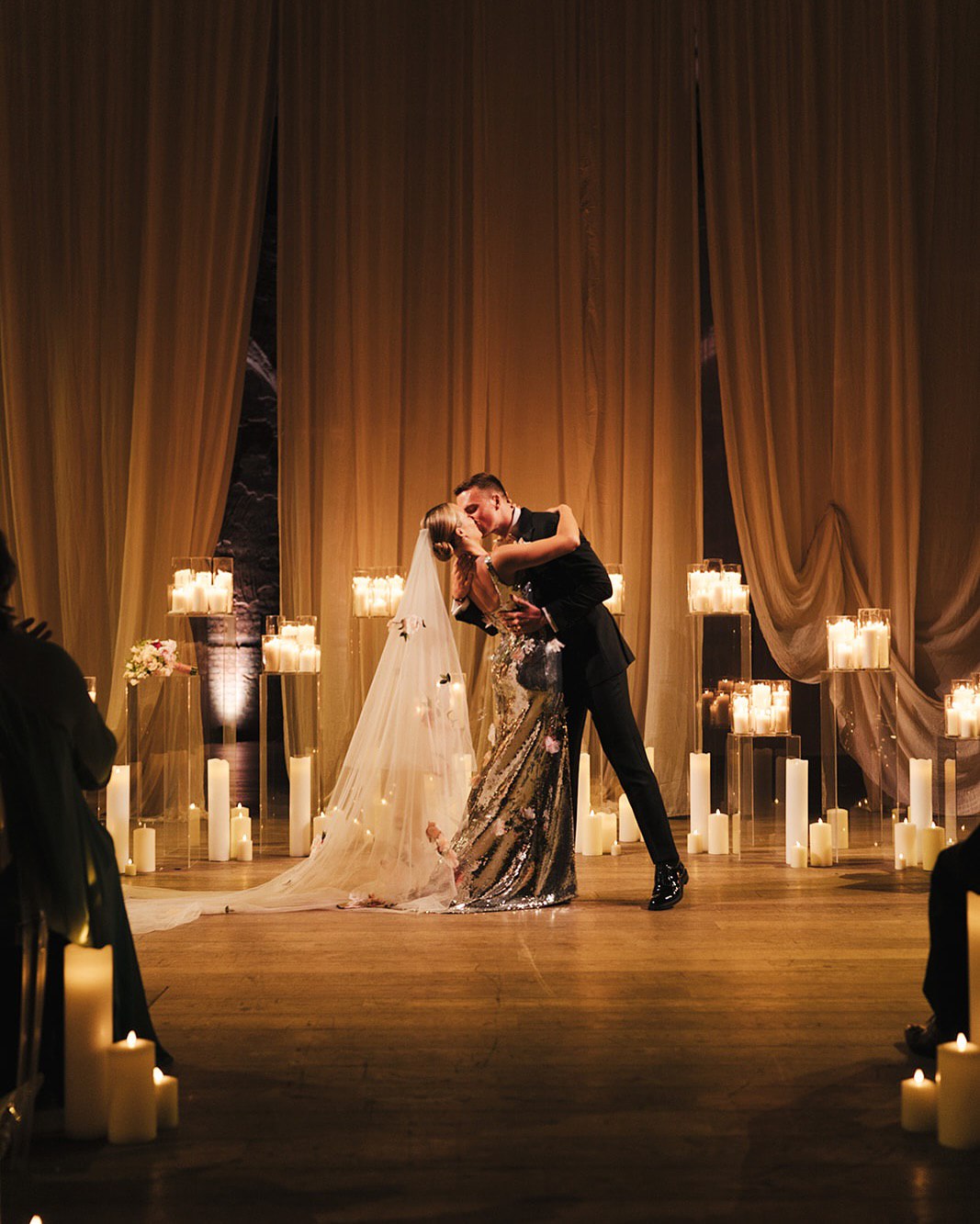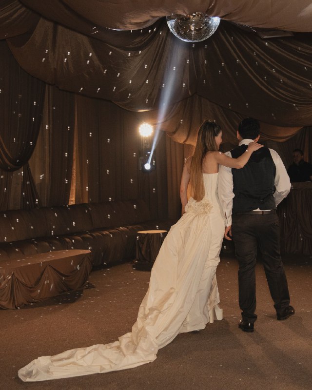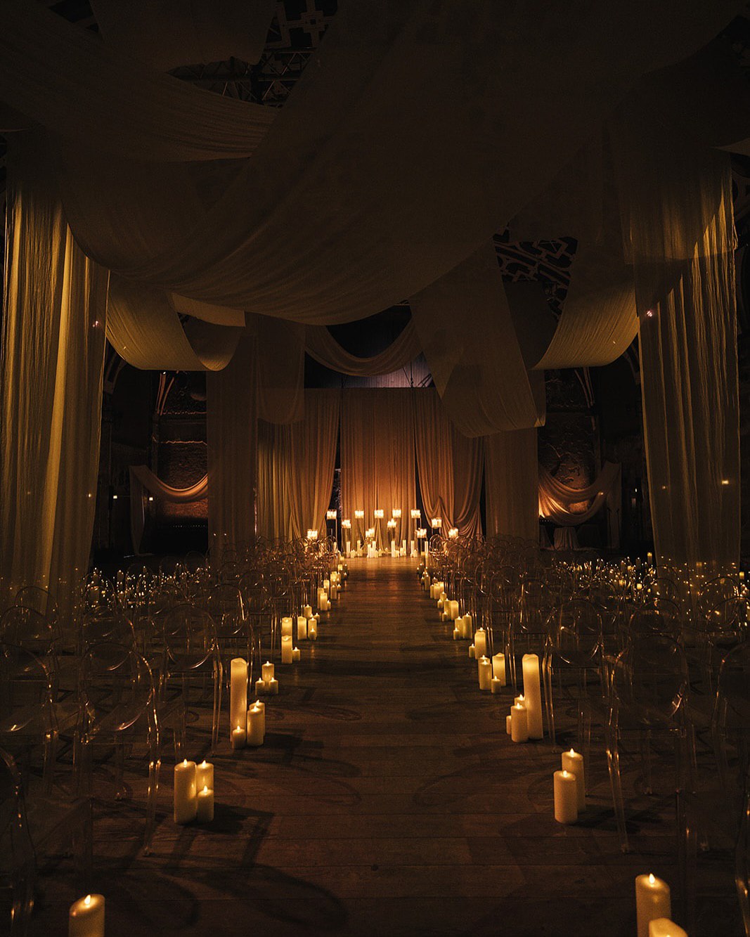 В этой свадьбе нам безумно понравились многослойные драпировки, свисающие с потолка, огромное количество текстуры, которая создавала «обволакивающий» эффект и магический тёплый свет.