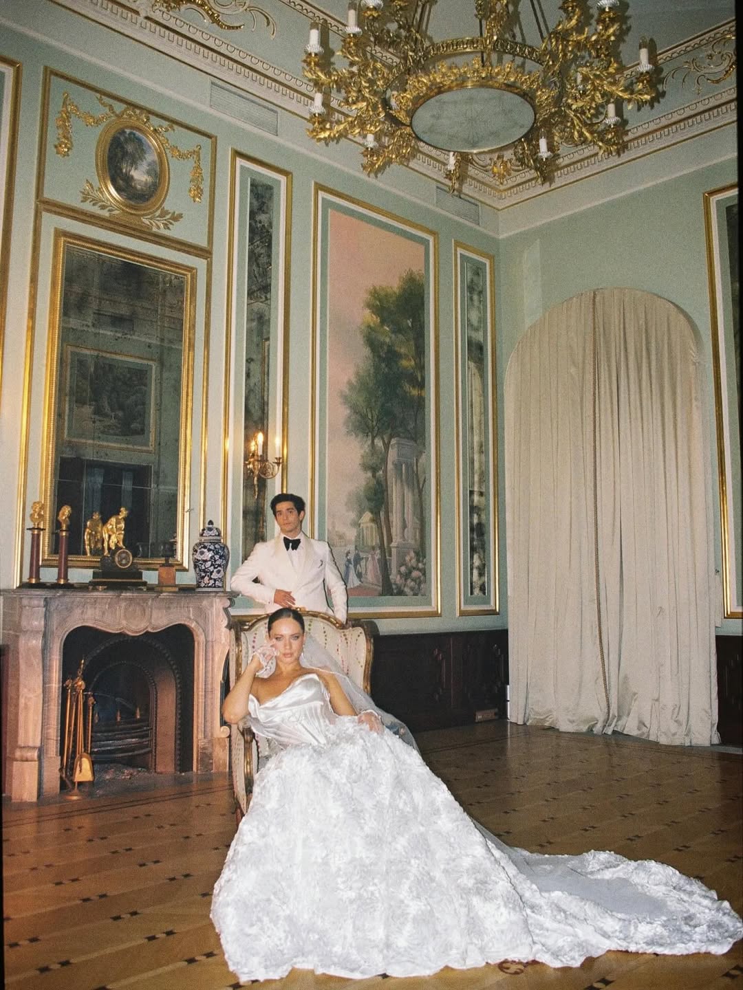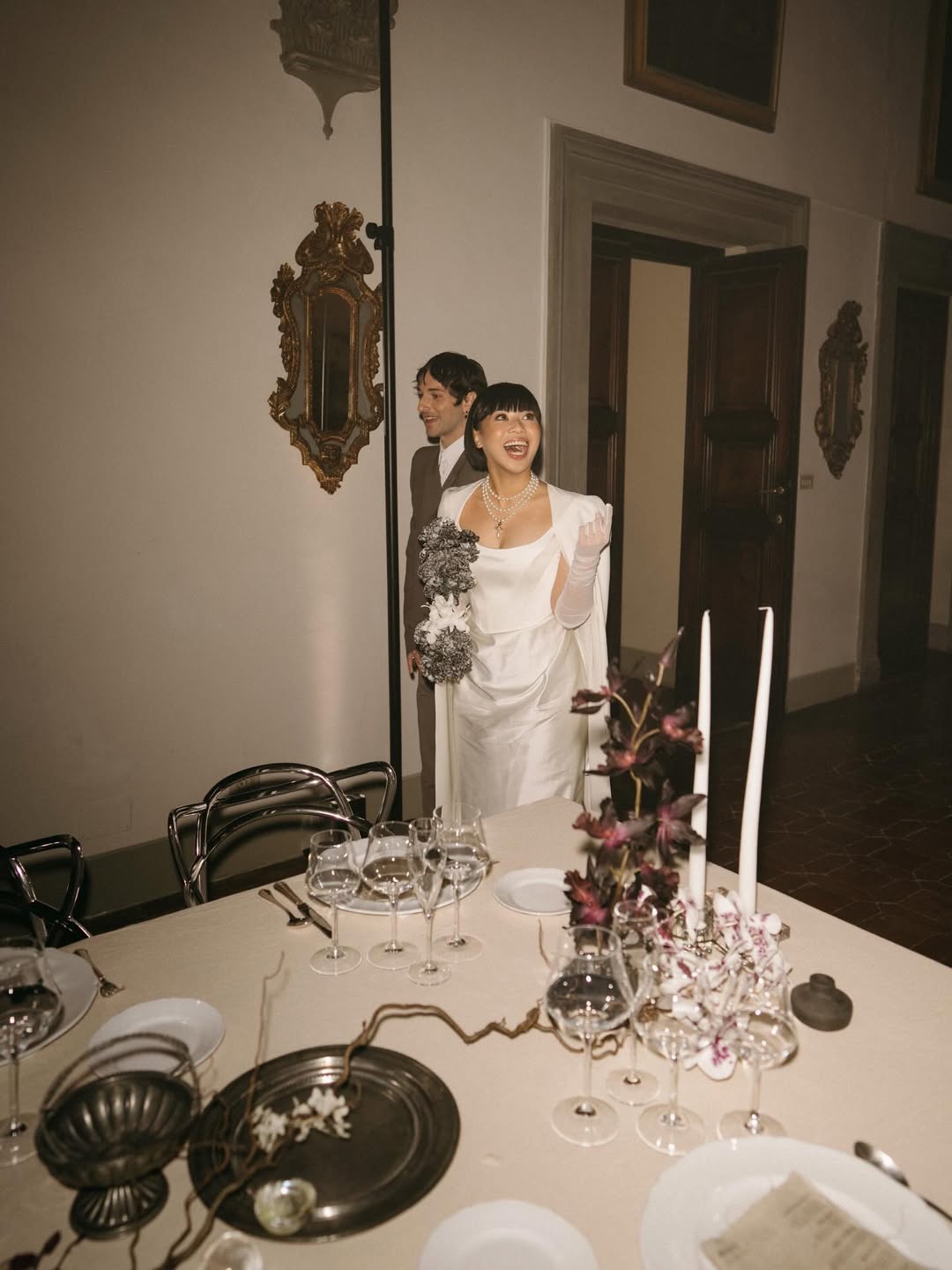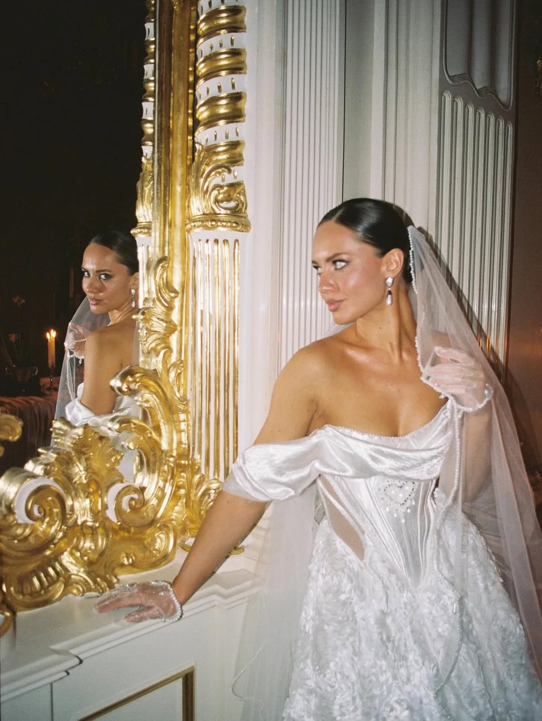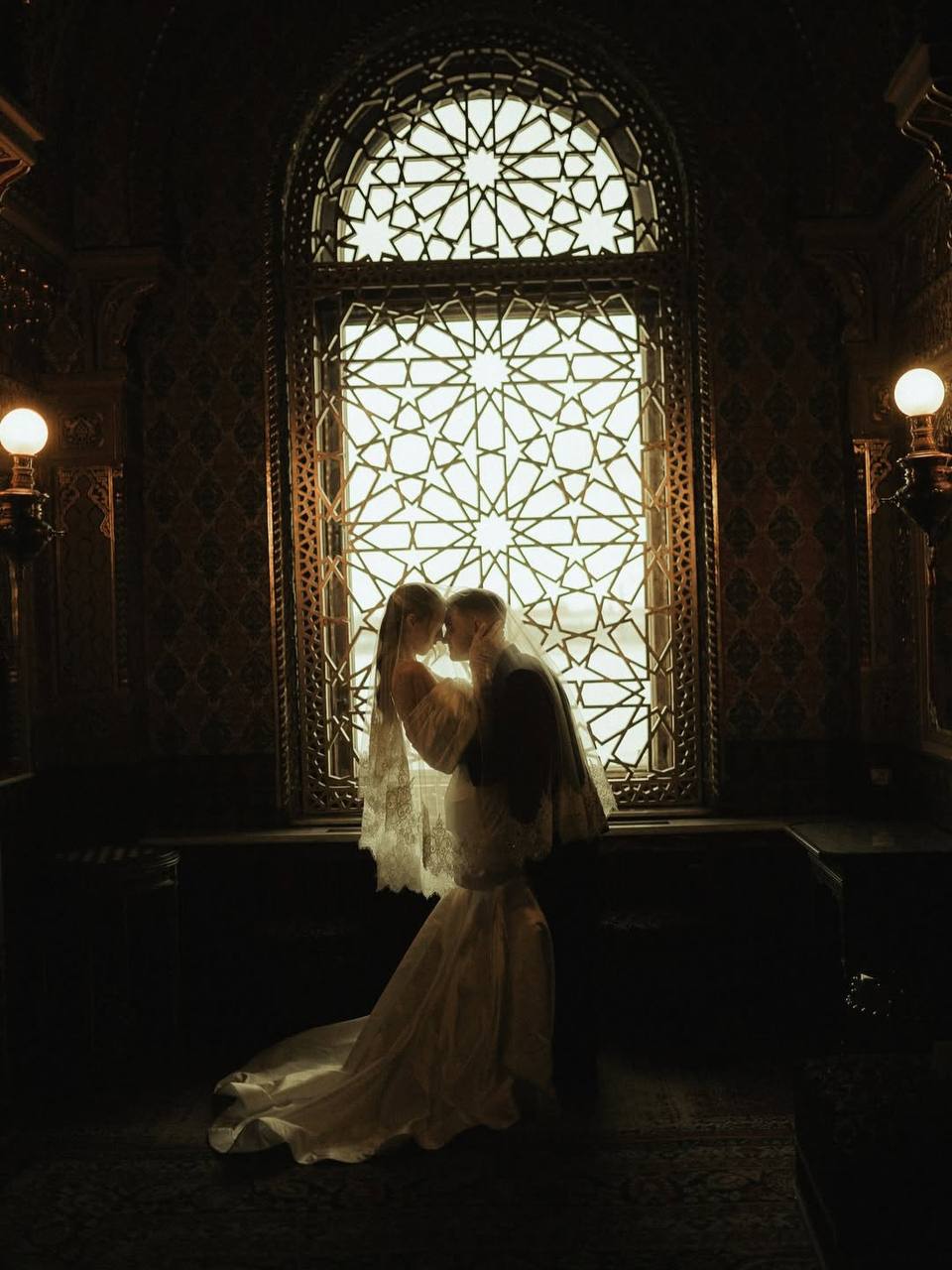 Образ невесты поддерживает эту эстетику: платье с винтажными отсылками, тонкое кружево и длинная фата — всё это так красиво сочетается с классической архитектурой.
