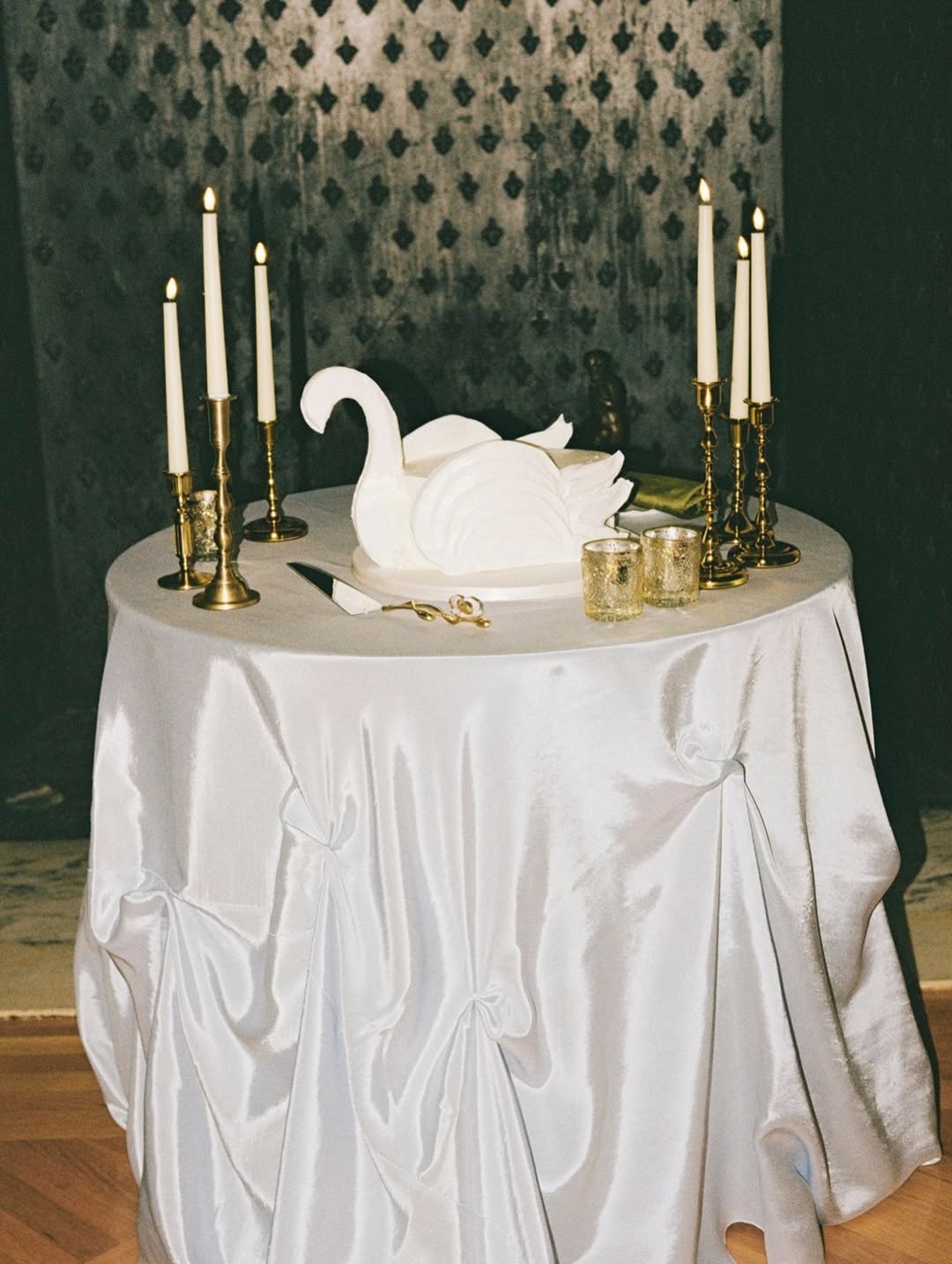 Нам очень понравилось сочетание живой зелени на столах с белоснежным текстилем и декором, а золотые канделябры только добавили композиции торжественной атмосферы. Ну а свадебный торт в виде лебедя нас покорил. Забираем в рефы!