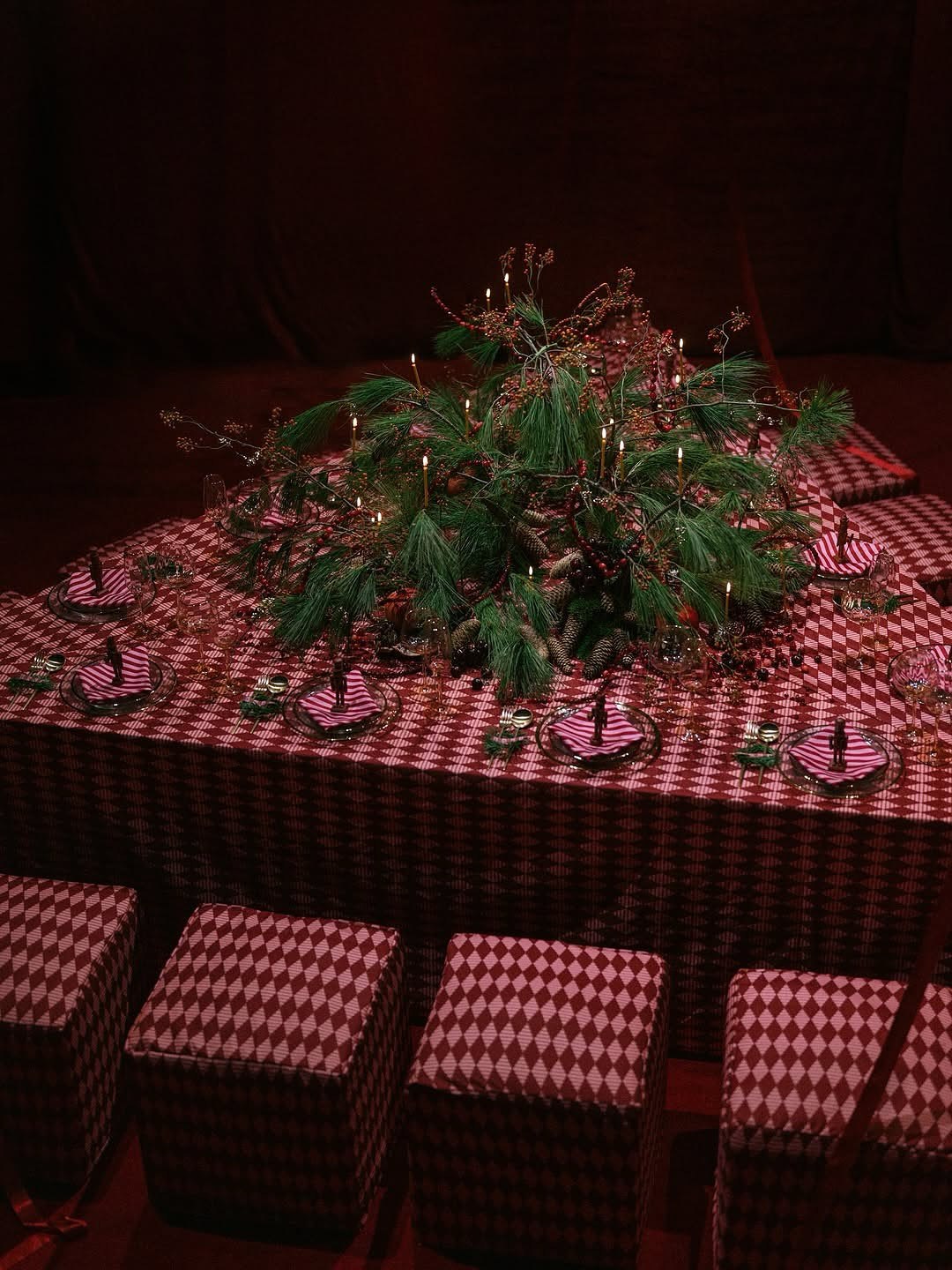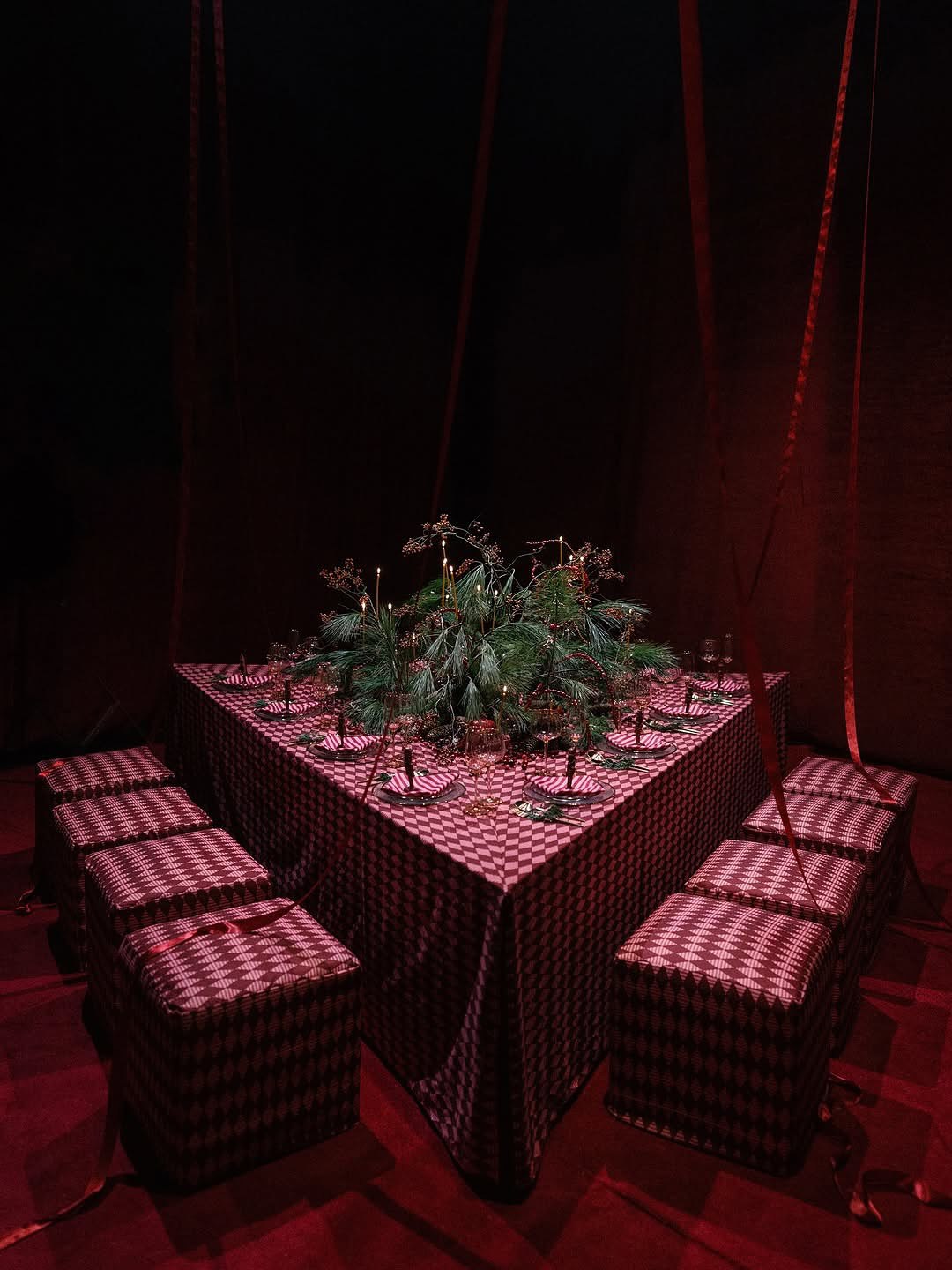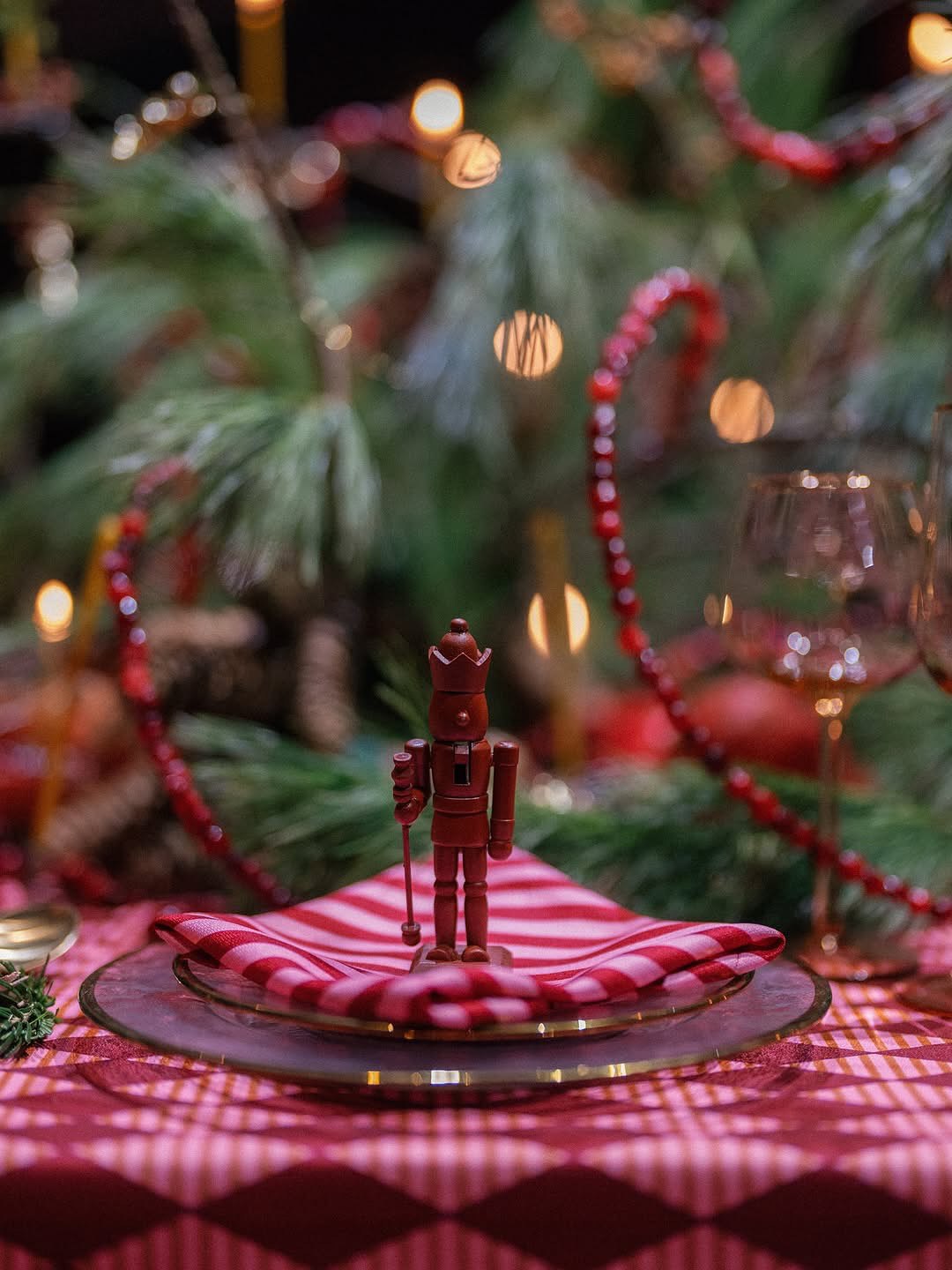 Идеальный сет-дизайн рождественской свадьбы: красно-розовые монопринты, композиция из еловых веток в центре стола, красный текстиль и фигурки щелкунчика, отсылающие к волшебному празднику. А ещё, мы просто влюбились в этот треугольный стол!