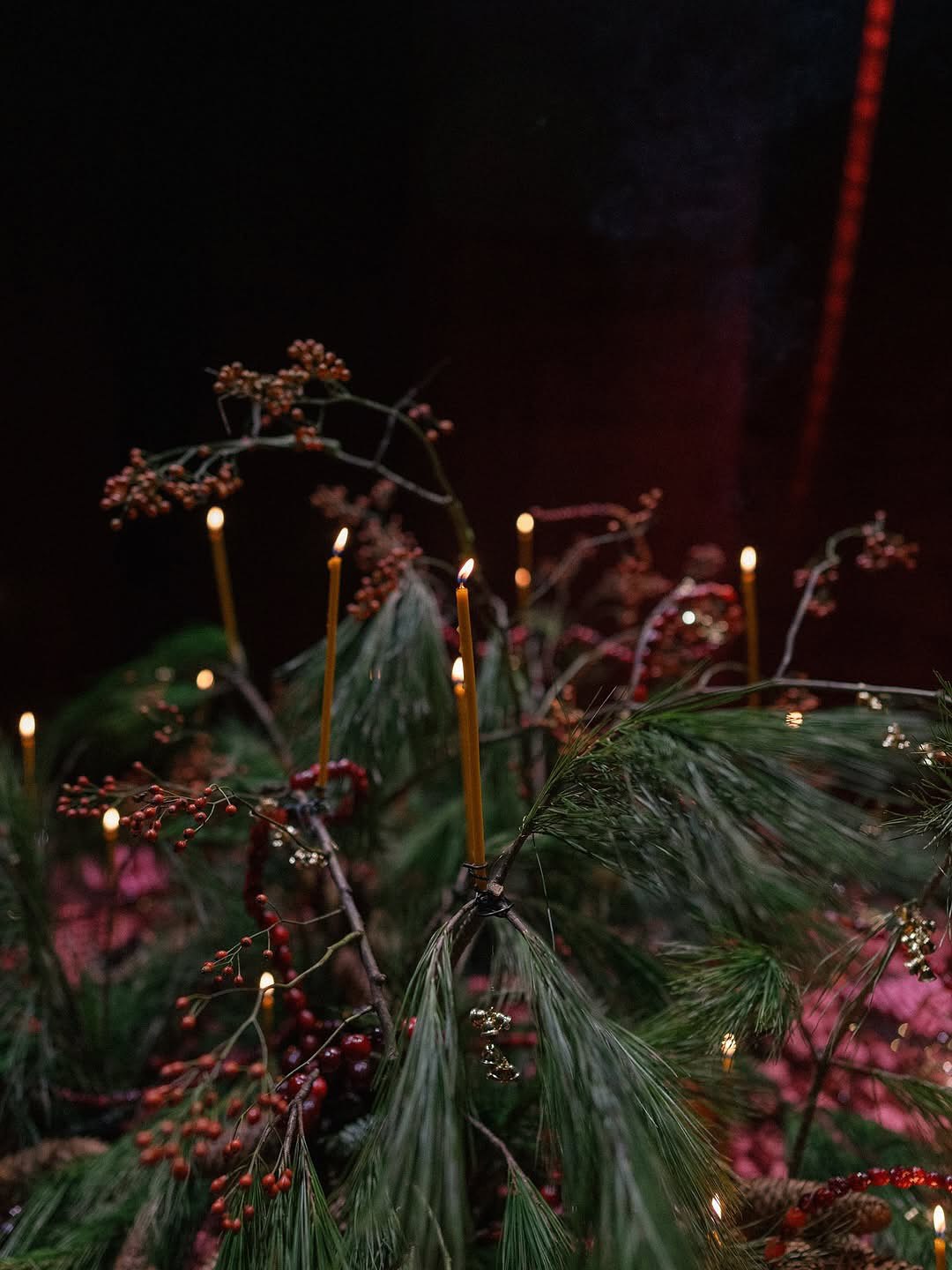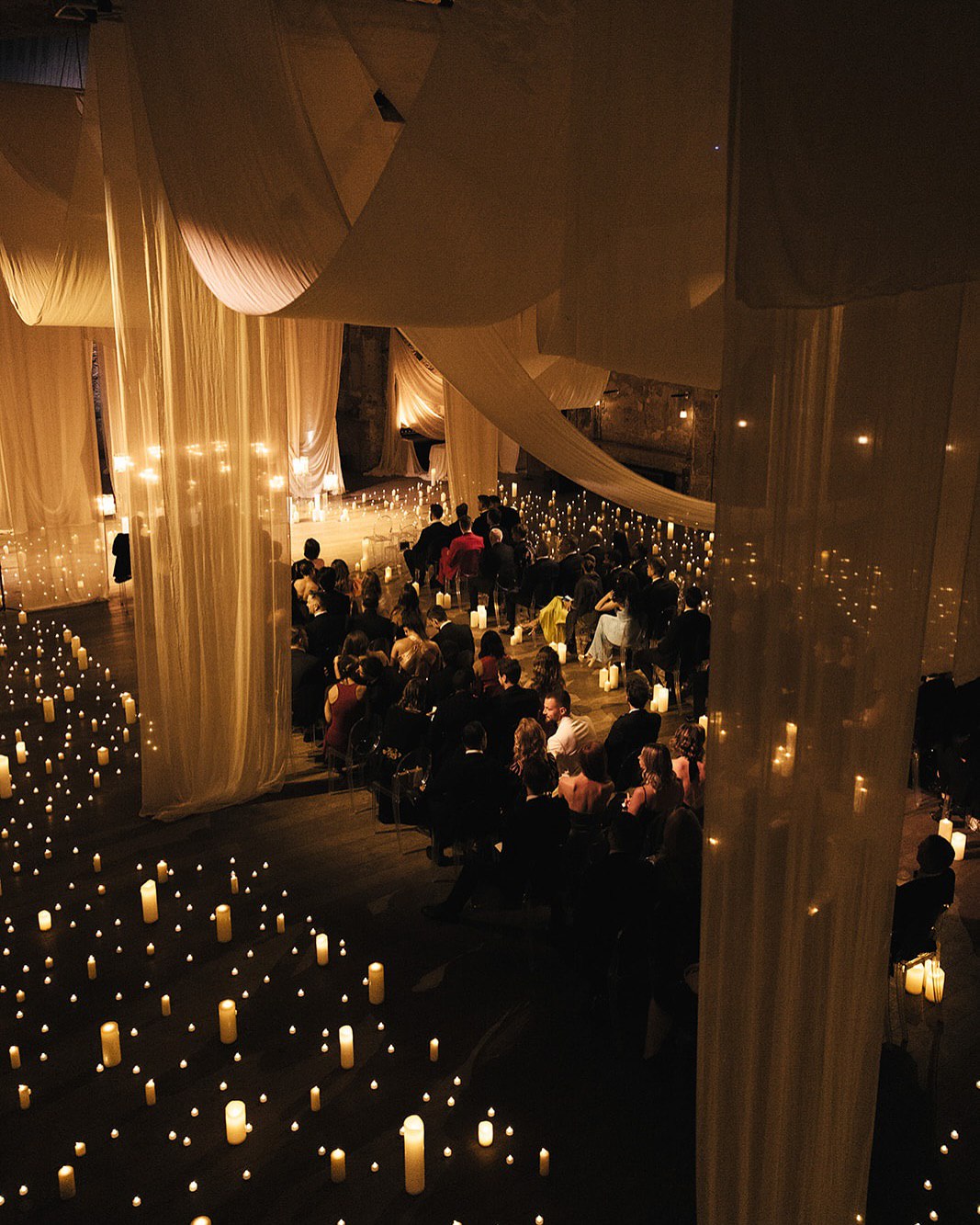 Свечи — это абсолютная классика зимних свадеб. В этом проекте именно они стали основой всей атмосферы. Зона церемонии была окружена тысячами свечей, а свисающие с потолка полотна ткани красиво отсвечивали их и создавали уютную тёплую атмосферу.