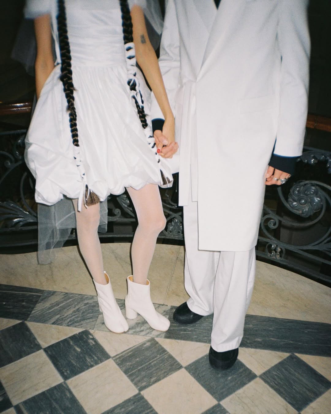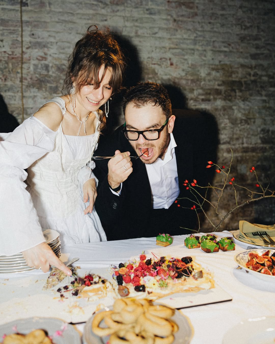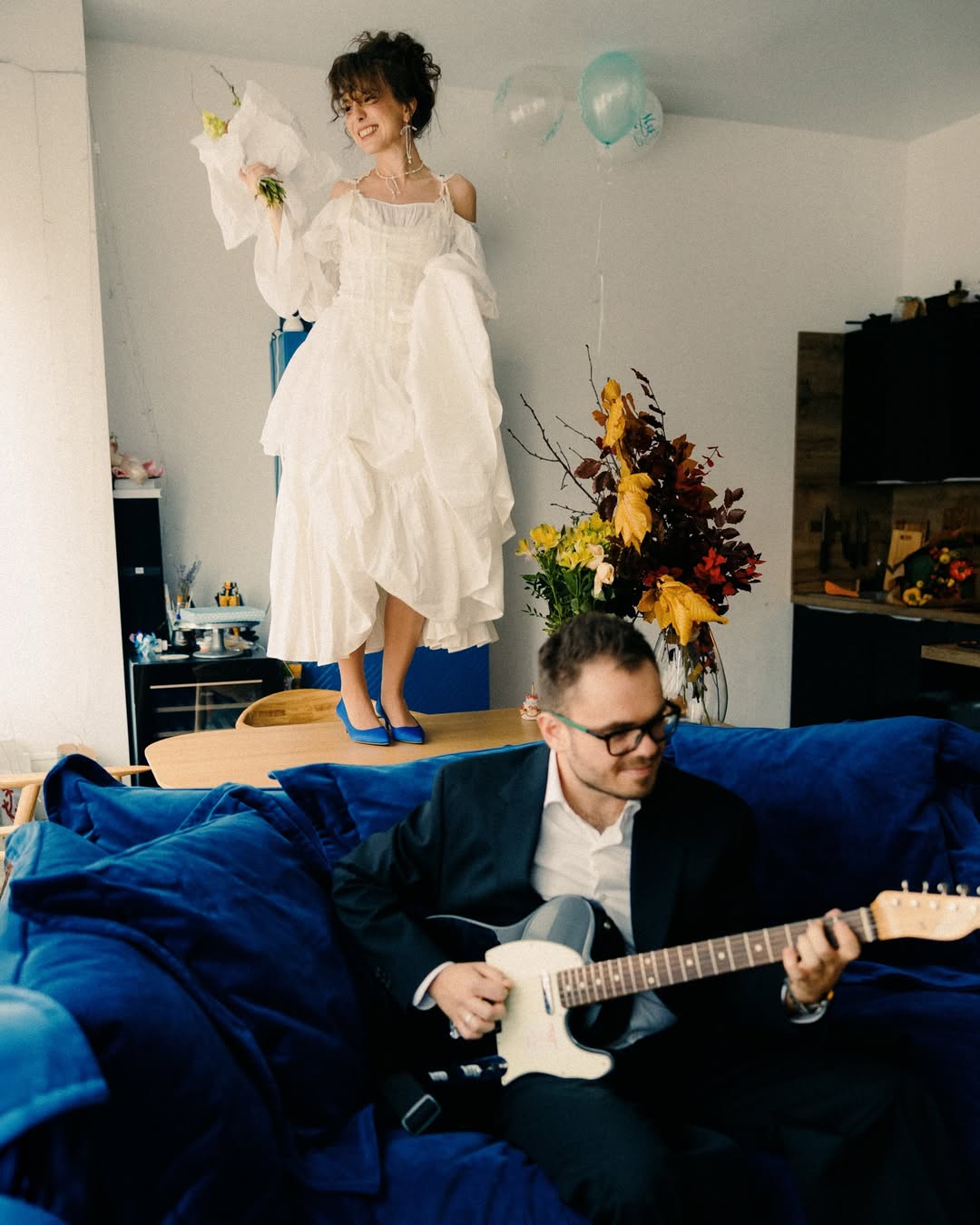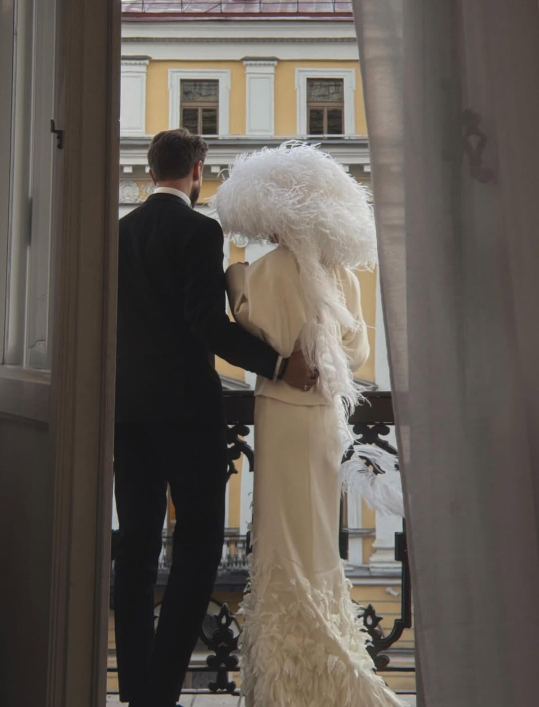 Но больше нас покорили образы пары — необычные аксессуары невесты и почти что театральный наряд жениха.