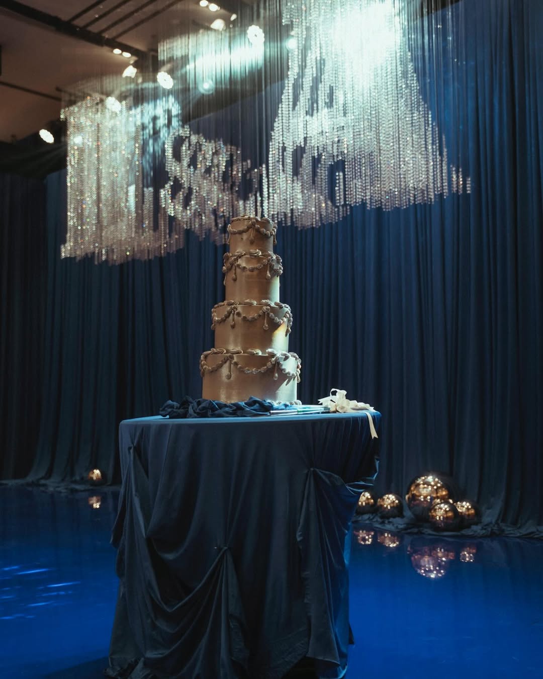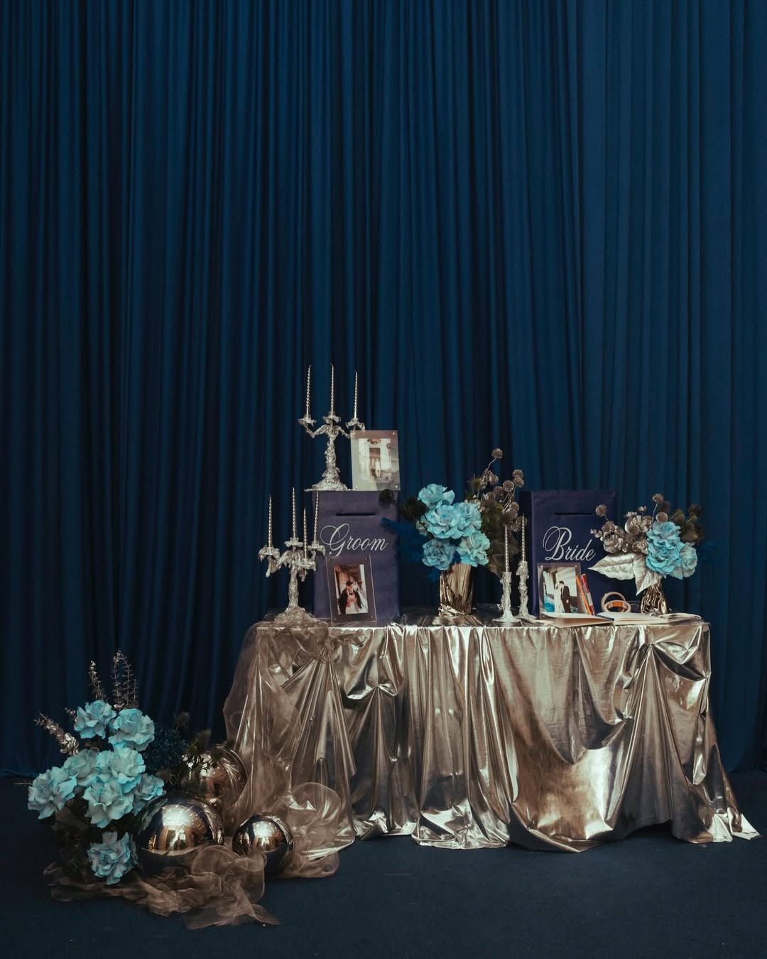 Глубокий синий в паре с металлическими акцентами — одно из самых выразительных сочетаний для зимней свадьбы.