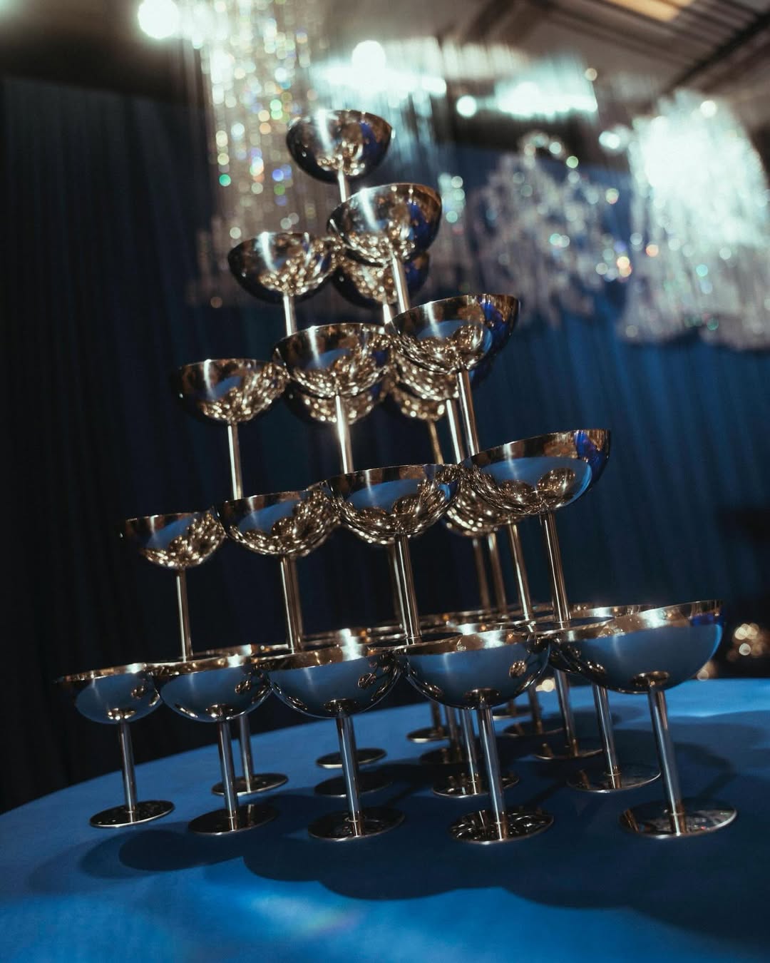 Холодная, благородная палитра отсылает к зимней эстетике, а металл добавляет нужный баланс — свет, блеск и ощущение торжественности.