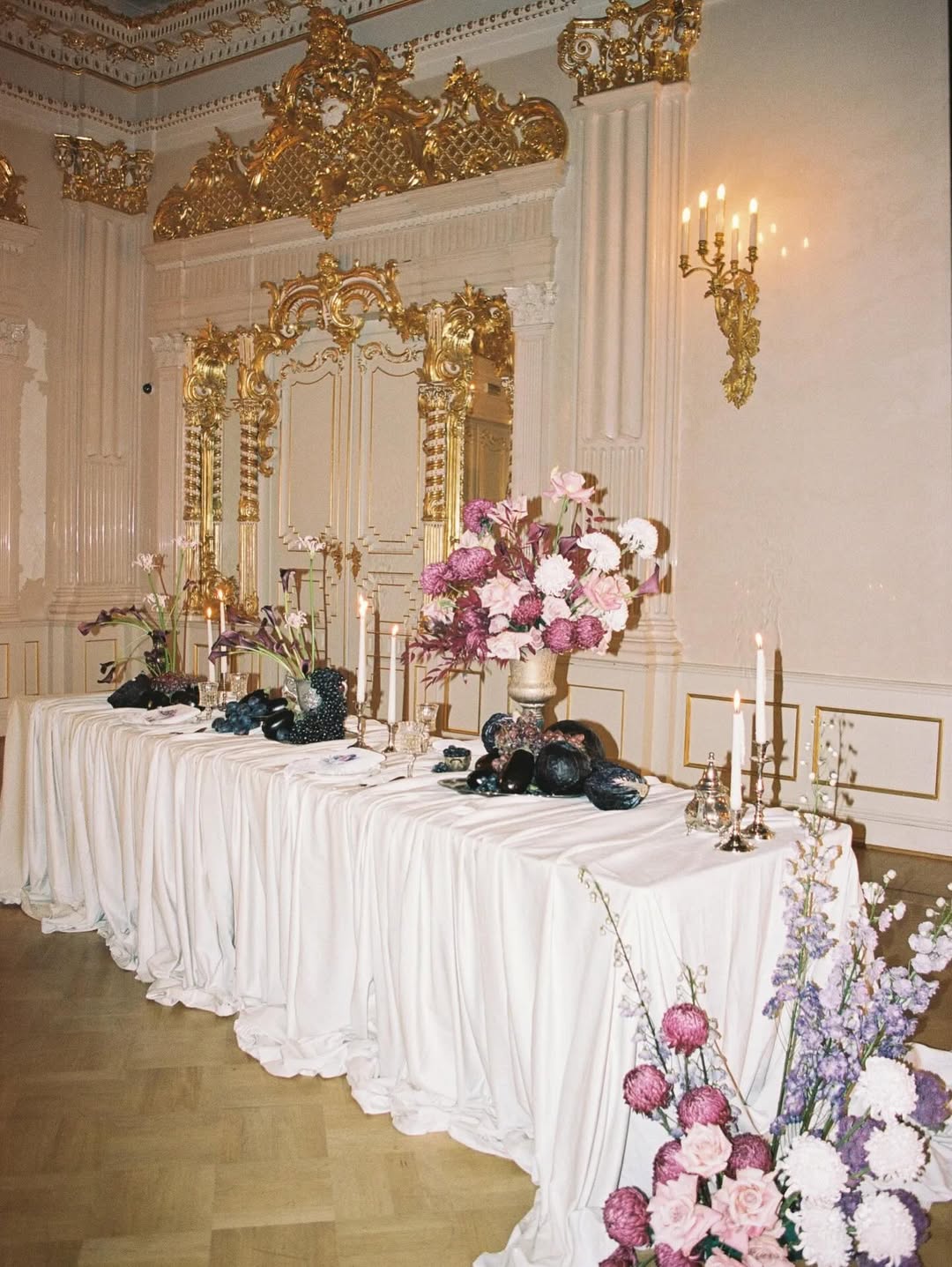 Влюбились в такую элегантную классическую свадьбу в историческом месте — Особняке Мясникова. Помимо белоснежных драпировок, золотых канделябров и свечей, в декоре использовались глубокий сливовый и лиловый — идеальный контраст для светлой палитры.