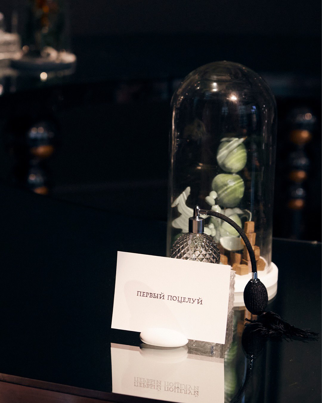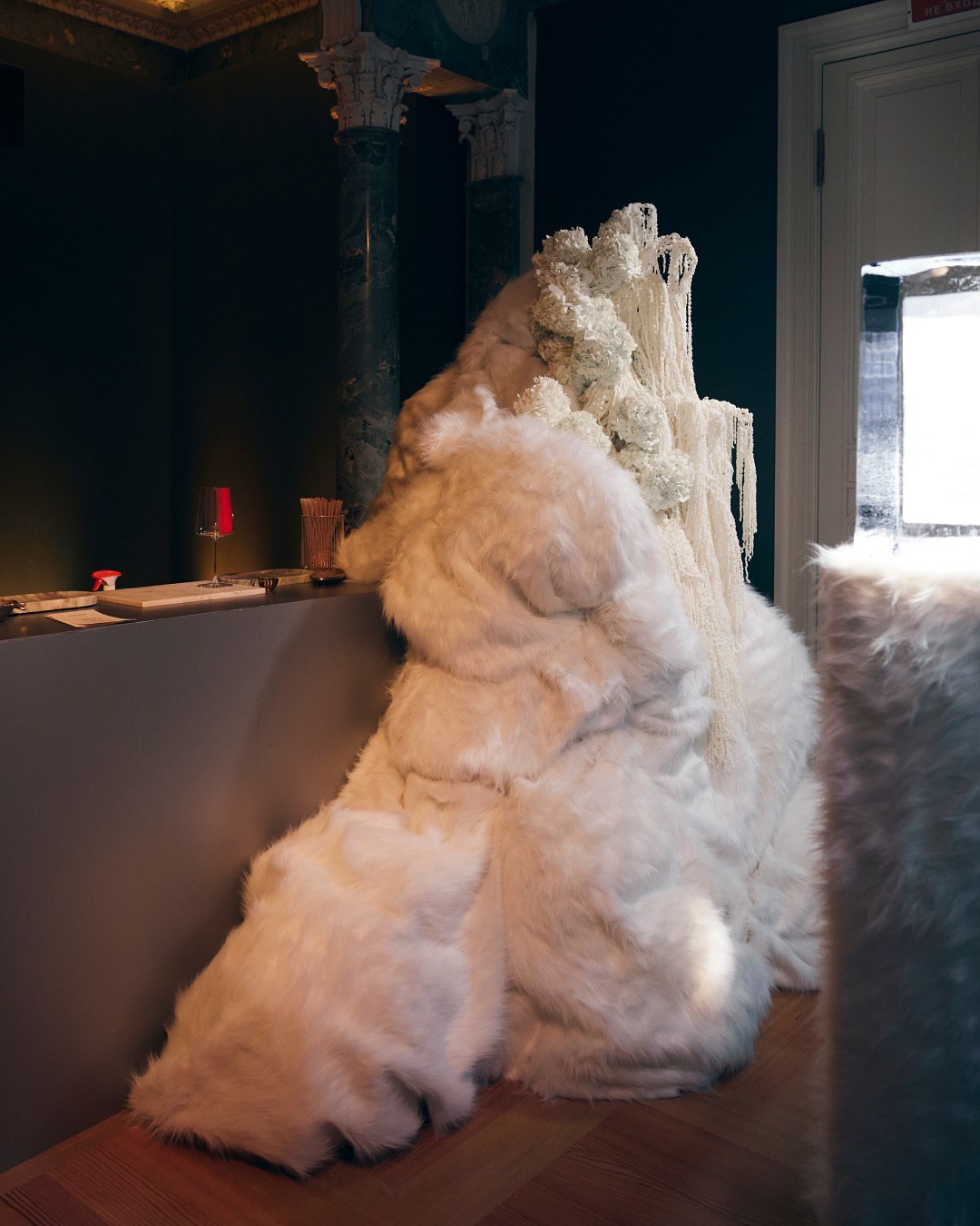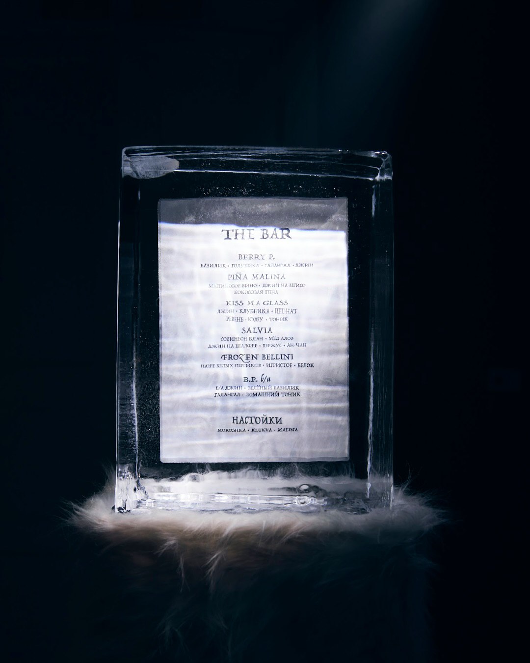 Декор словно отсылает к заснеженному пейзажу: стеклянные колбы, барное меню заковано в ледяную глыбу, рядом разместились арт-объекты из белого меха и цветов, а на столах выросли стеклянные подснежники.
