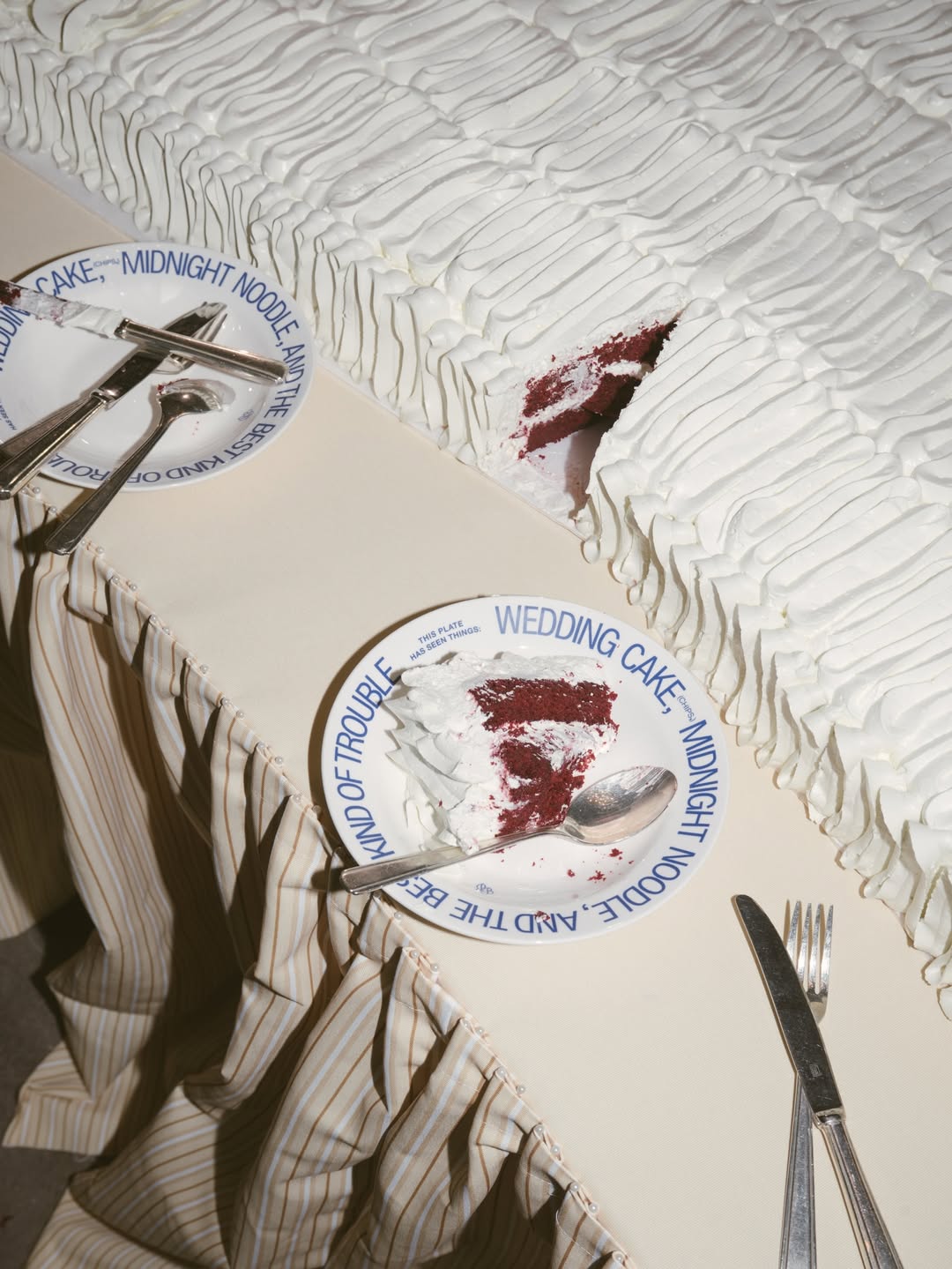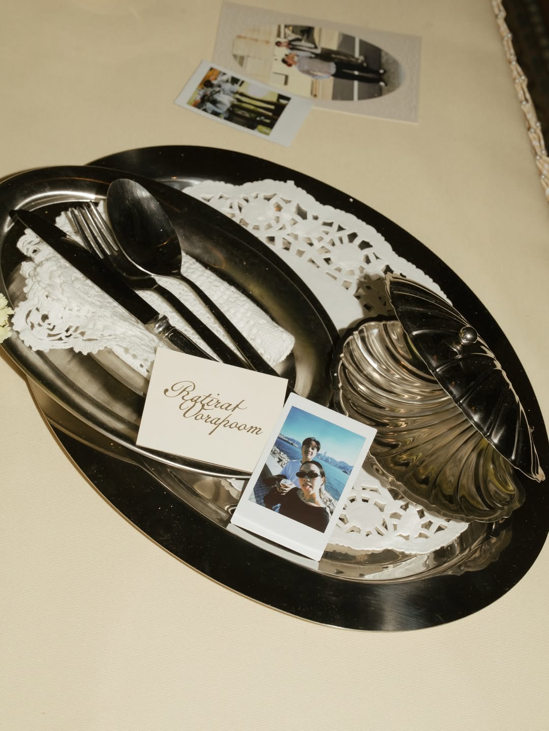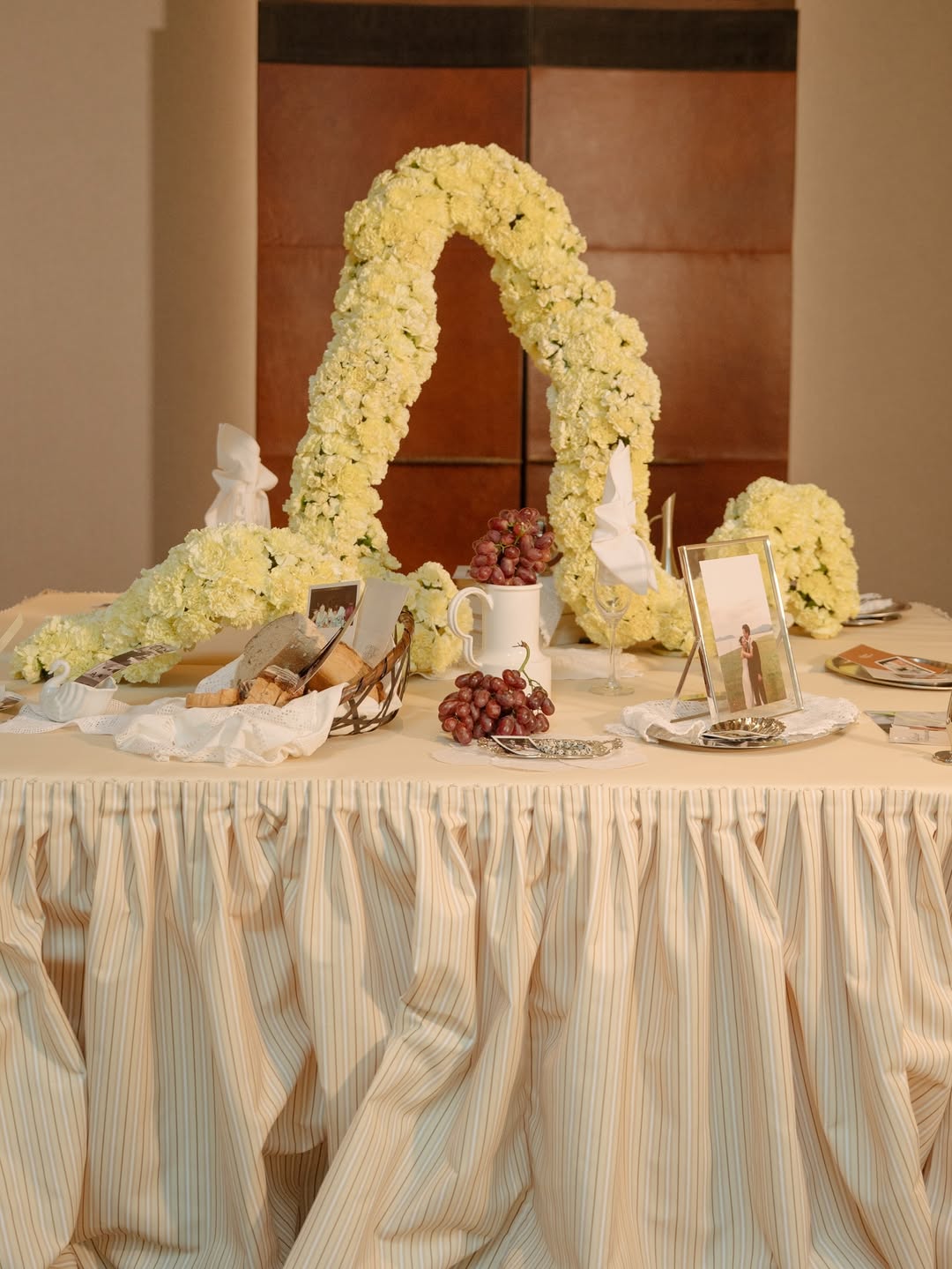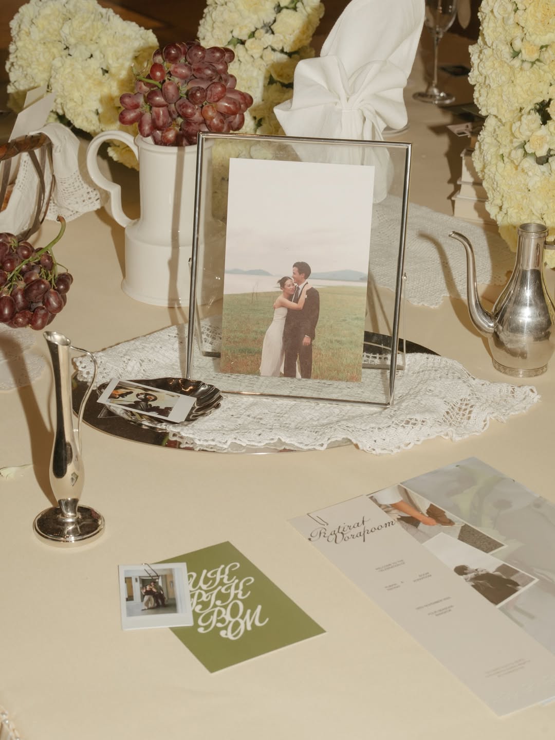 Ностальгические акценты в виде кружева на столах рядом с полароидными фотографиями, цветочные композиции в кремовых оттенках, сливочный текстиль в полоску и белоснежный торт, полностью задекорированный в виде драпировок — всё это создало особую, очень ностальгическую и уютную атмосферу.