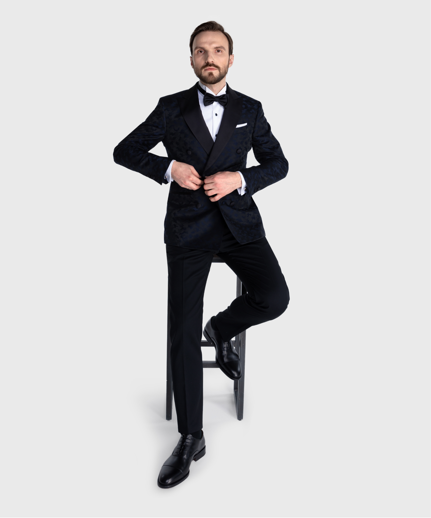 Бархат и велюр мы чаще используем в смокингах и вечерних образах: они красиво реагируют на свет и делают образ по-настоящему праздничным. При этом в индивидуальном пошиве мы редко делаем костюм полностью из таких материалов, а предпочитаем использовать в одном акцентном изделии, в основном в пиджаке.