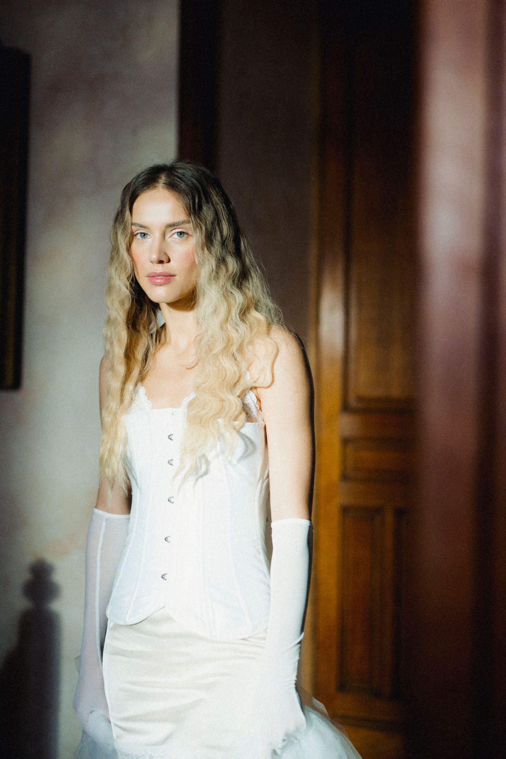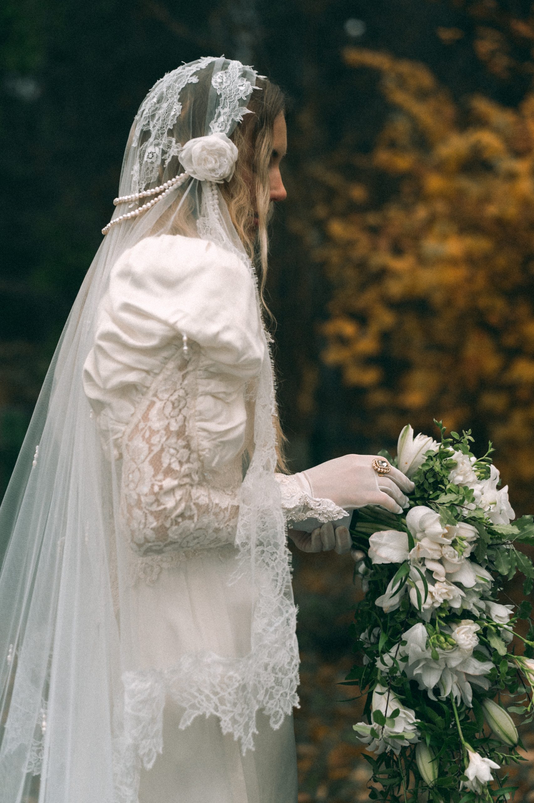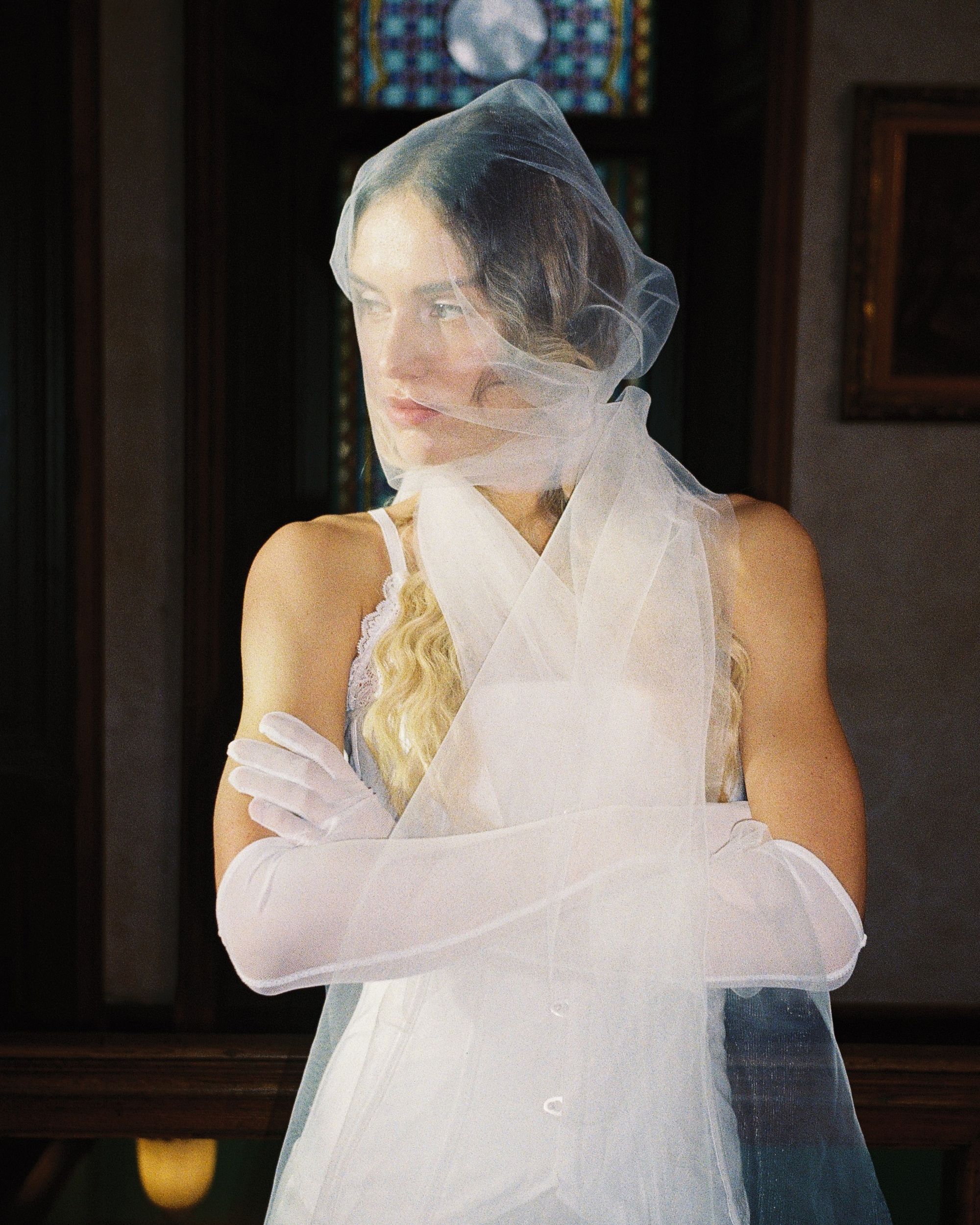 Для утра я рекомендую использовать длинные вуальные варианты, чтобы добавить изюминки в будуарный образ, но не перегрузить его. Для церемониального образа можно смотреть укороченные варианты, либо длинные из более плотной ткани, или модели расшитые жемчугом, контрастные перчатки, и даже чёрные для более смелых невест. Зависит от концепции свадьбы, характера невесты и образа в целом.