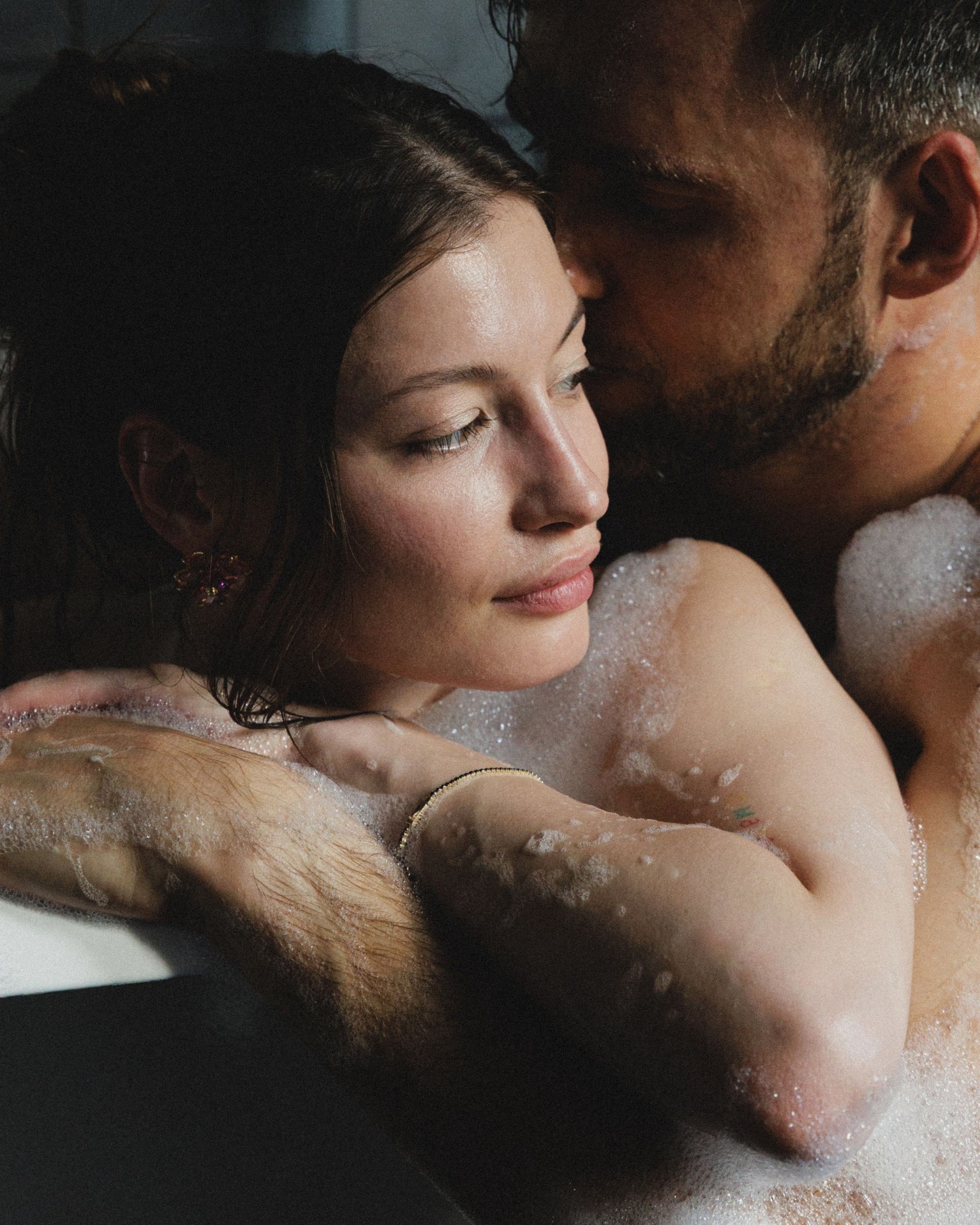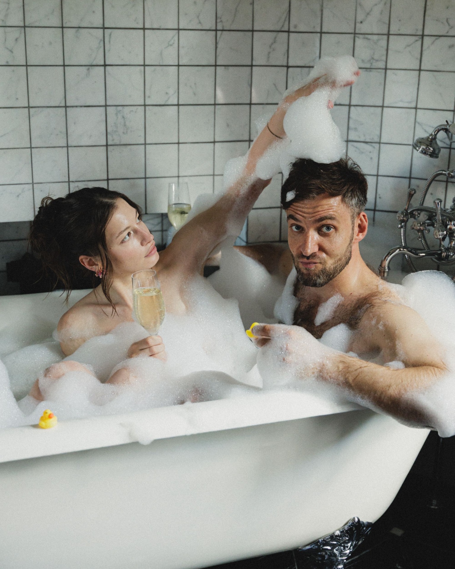 Мы проснулись в замке, позавтракали, и с приездом команды всё закрутилось. Сначала у нас была съёмка утра на полянке, где мы дурачились и были собой. А в номере нас ждала ванна с пеной. С её помощью мы добавили романтики и расслабленности нашему началу дня.