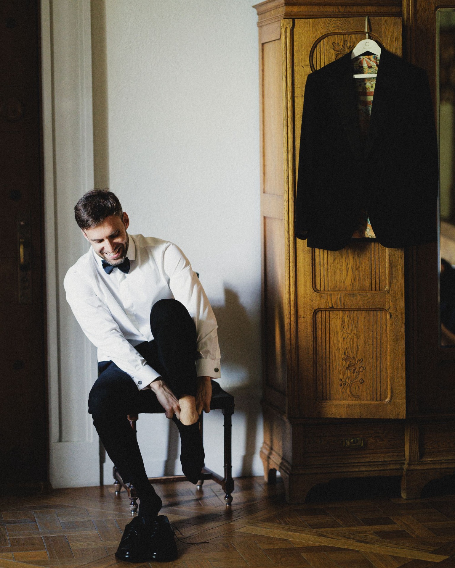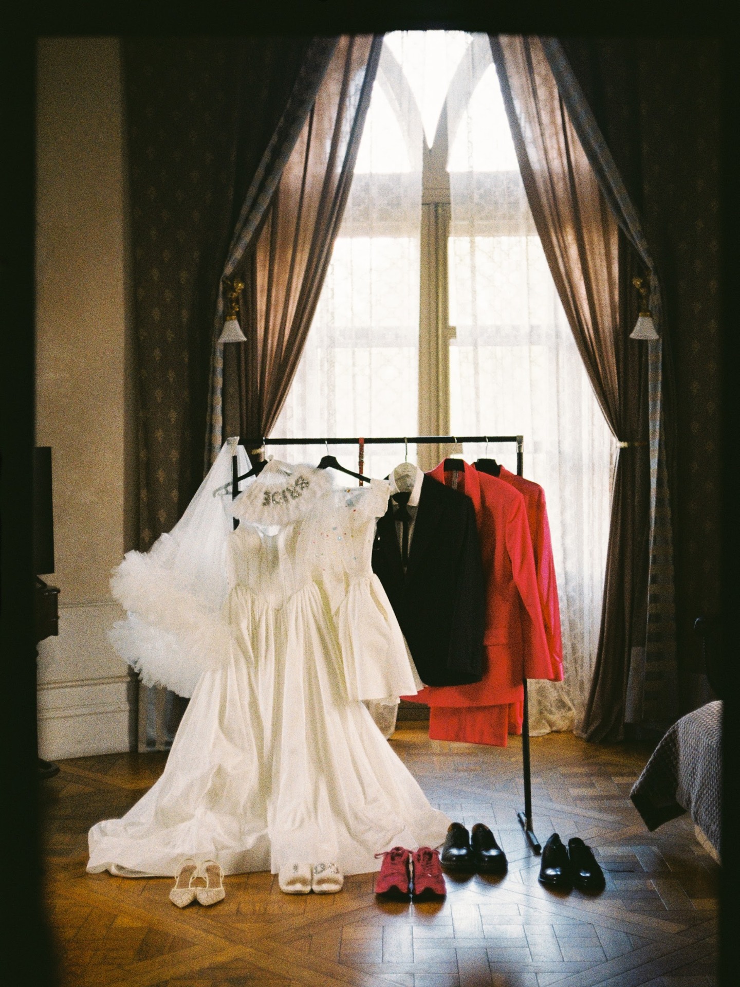 Так как у нас было две части свадьбы, мы подготовили несколько образов. Паша сшил классический смокинг в ателье, а я заказала платье с V-образным корсетом в стиле Марии-Антуанетты.
