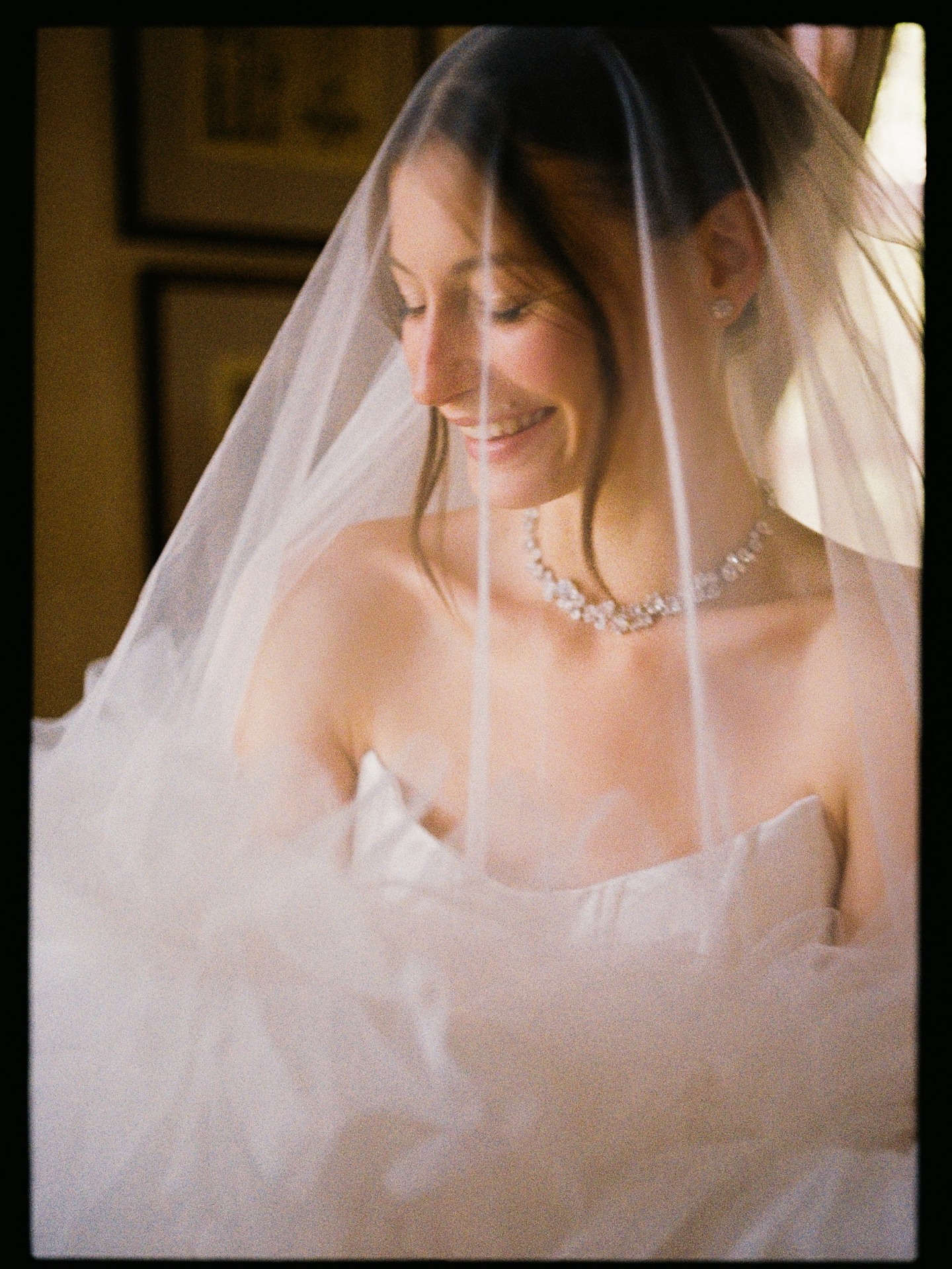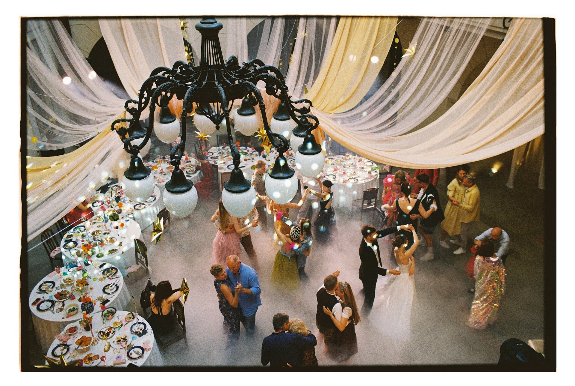 У гостей на местах лежали зеркальца с их именами — мы попросили использовать их во время нашего первого танца, и лучи света отражались повсюду.