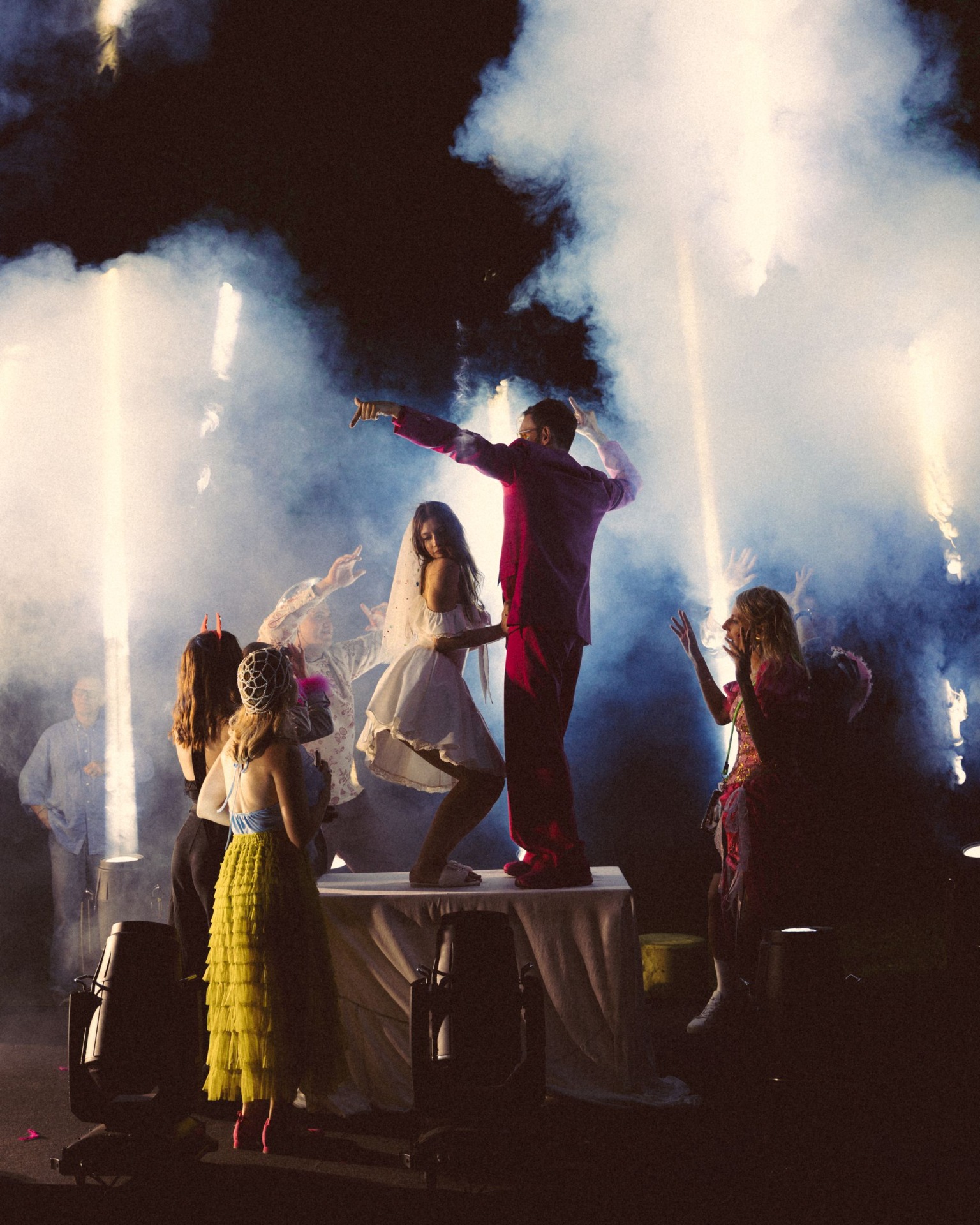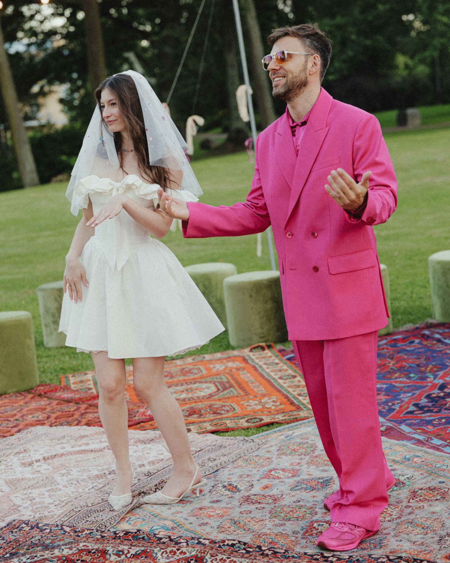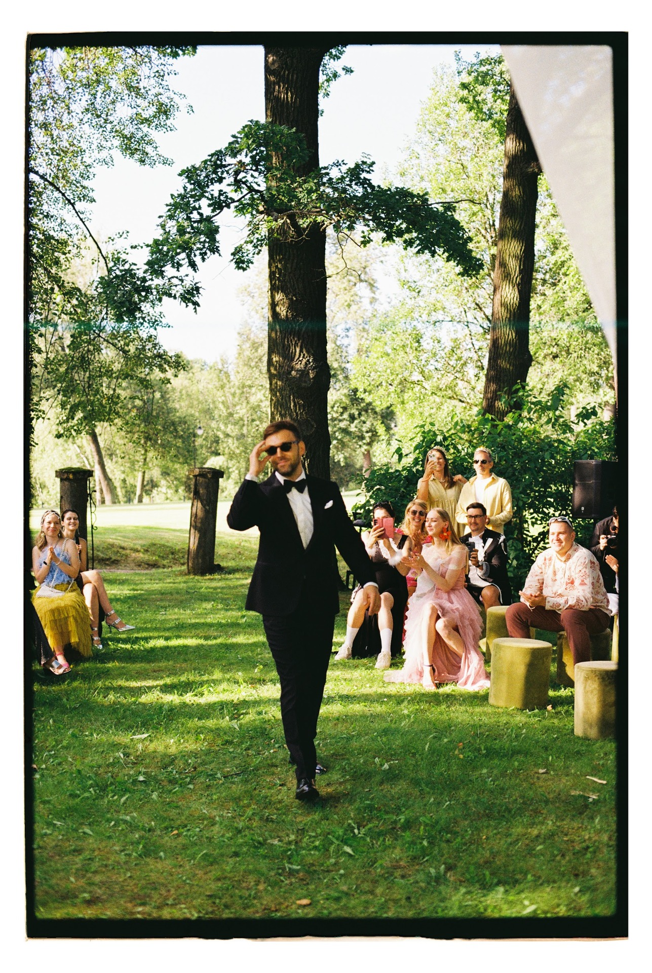 Вторая часть стала эмоциональным контрастом. После того как мы с гостями полежали на траве, включились прожекторы. А дальше началась вечериночная часть: мне хотелось освободить гостей от формального дресс-кода. И они с удовольствием поддержали эту идею! Вдохновившись эстетикой показов YSL, мы построили настоящий подиум с профессиональным светом, лучи которого били в небо. Но цель была не в модном показе, а в обратном — отпустить внутреннего ребёнка и продемонстрировать наряды в стиле «то, что давно ждало своего часа в шкафу». Это было невероятно ярко и энергично! Потом мы обсуждали, что у всех гостей было ощущение, что удалось отпустить своего внутреннего ребёнка и действительно кайфануть.