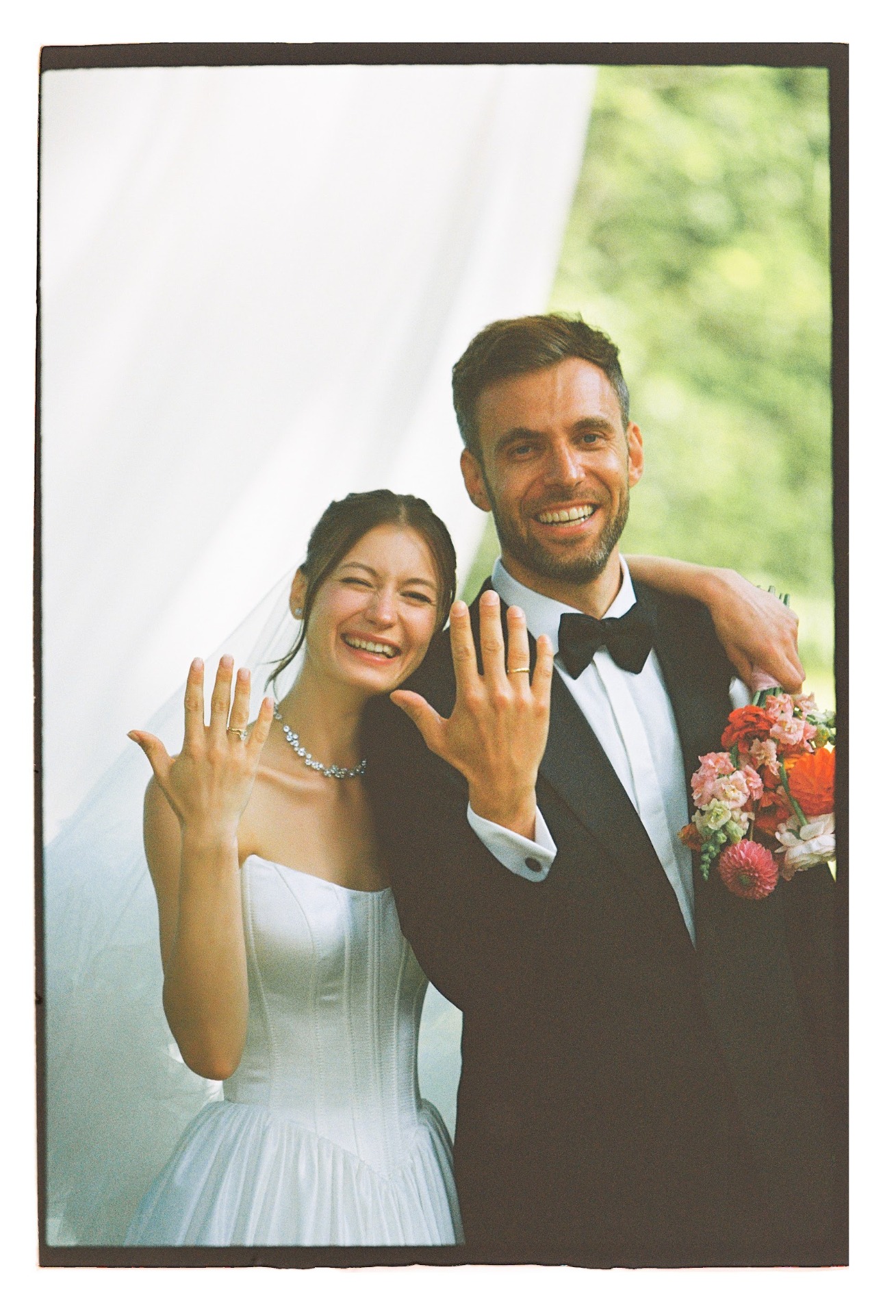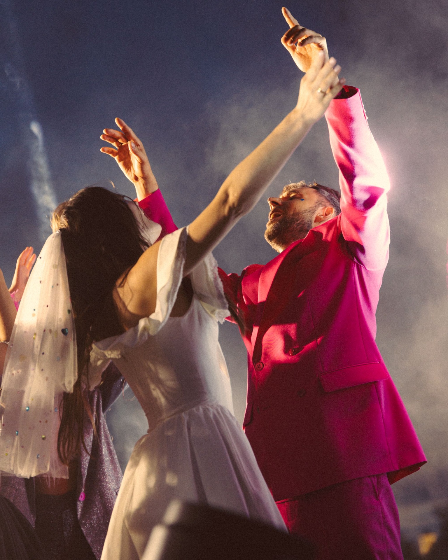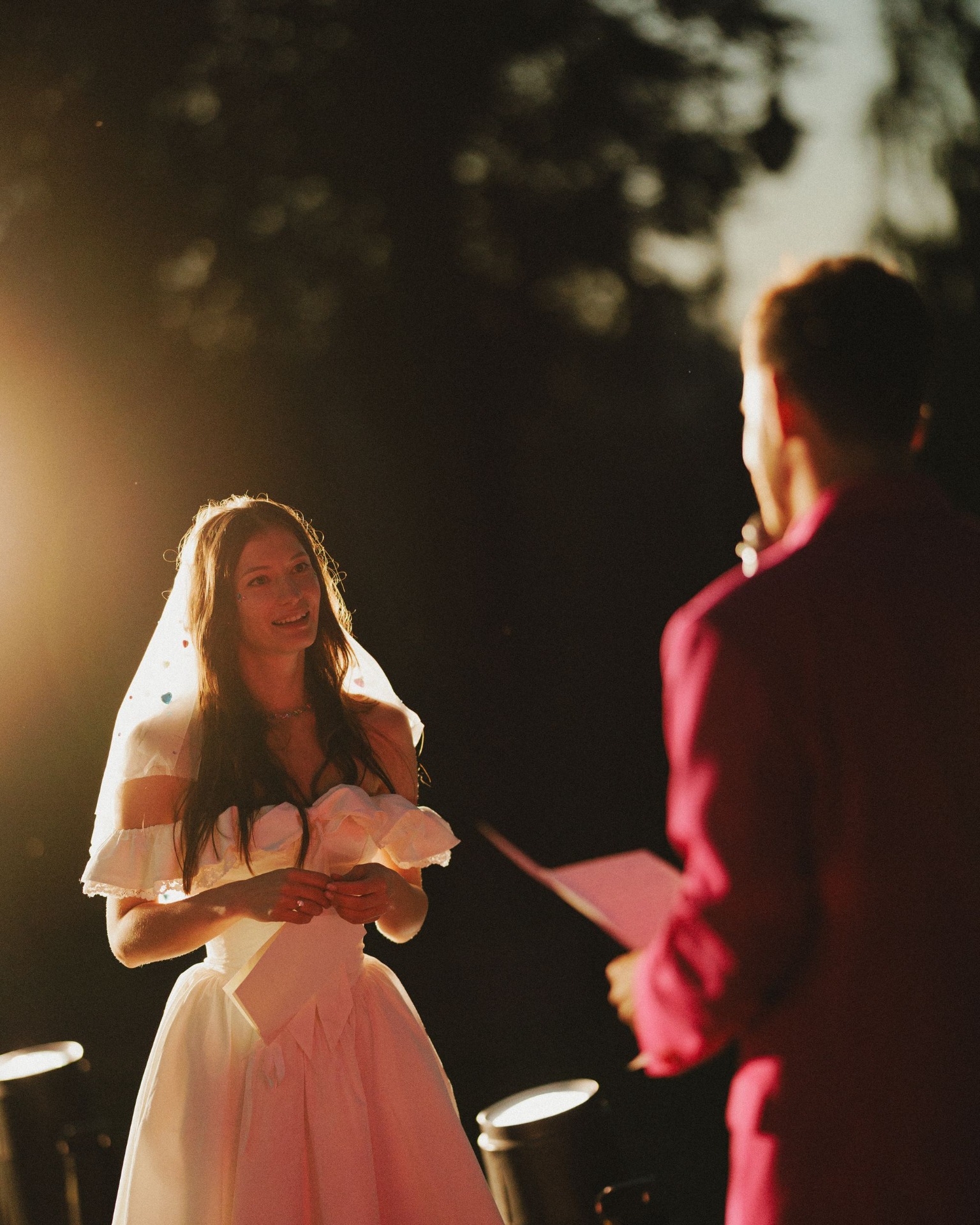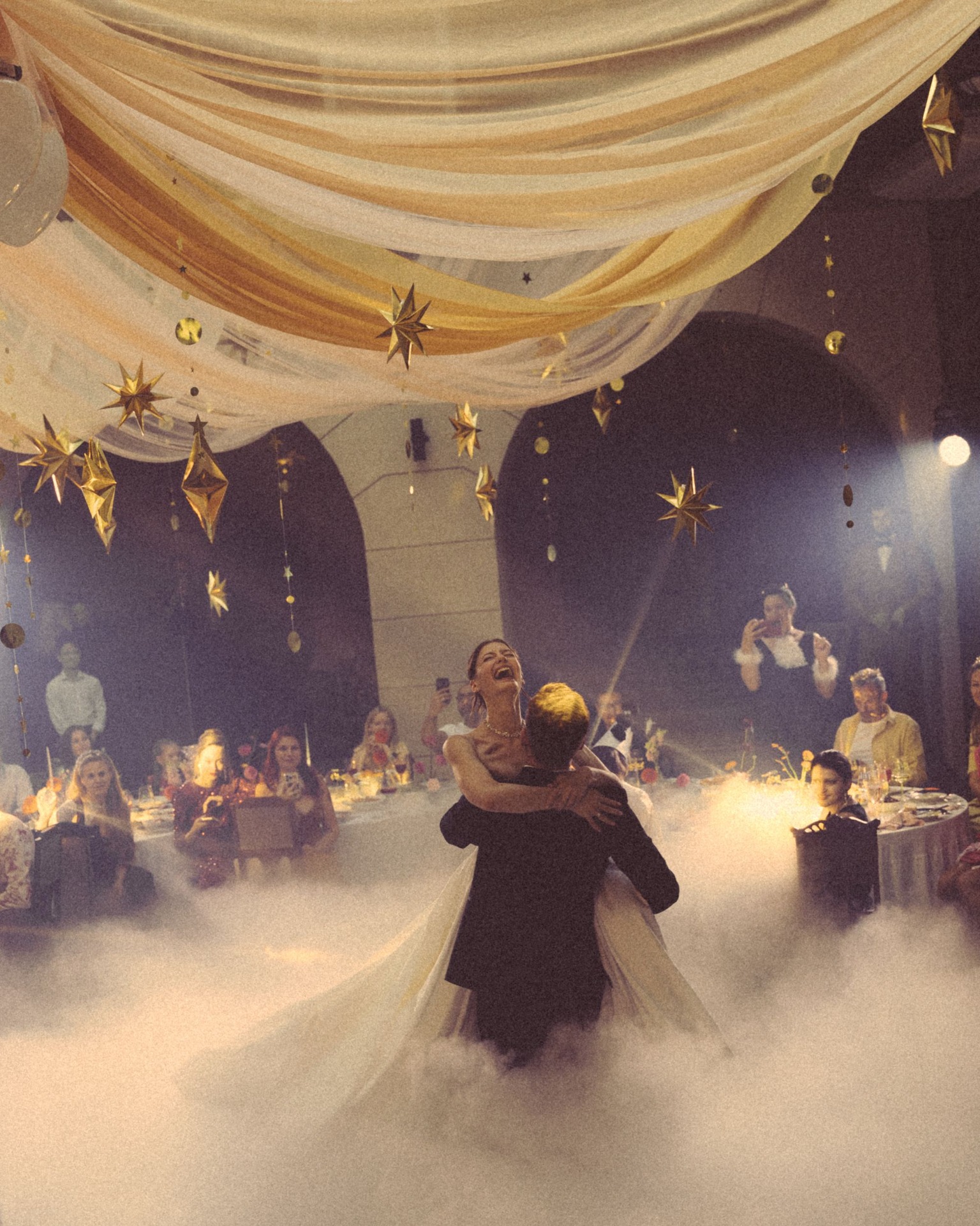 У нас было две части праздника: первая — классическая. Паша в чёрном смокинге, я в белом платье и фате. У арки мы сказали «да» и отправились на ужин, который длился около трёх часов: с поздравлениями семьи и первым танцем. Вторая — вечеринка с клятвами на подиуме, от которого лучи «били» в самое небо.