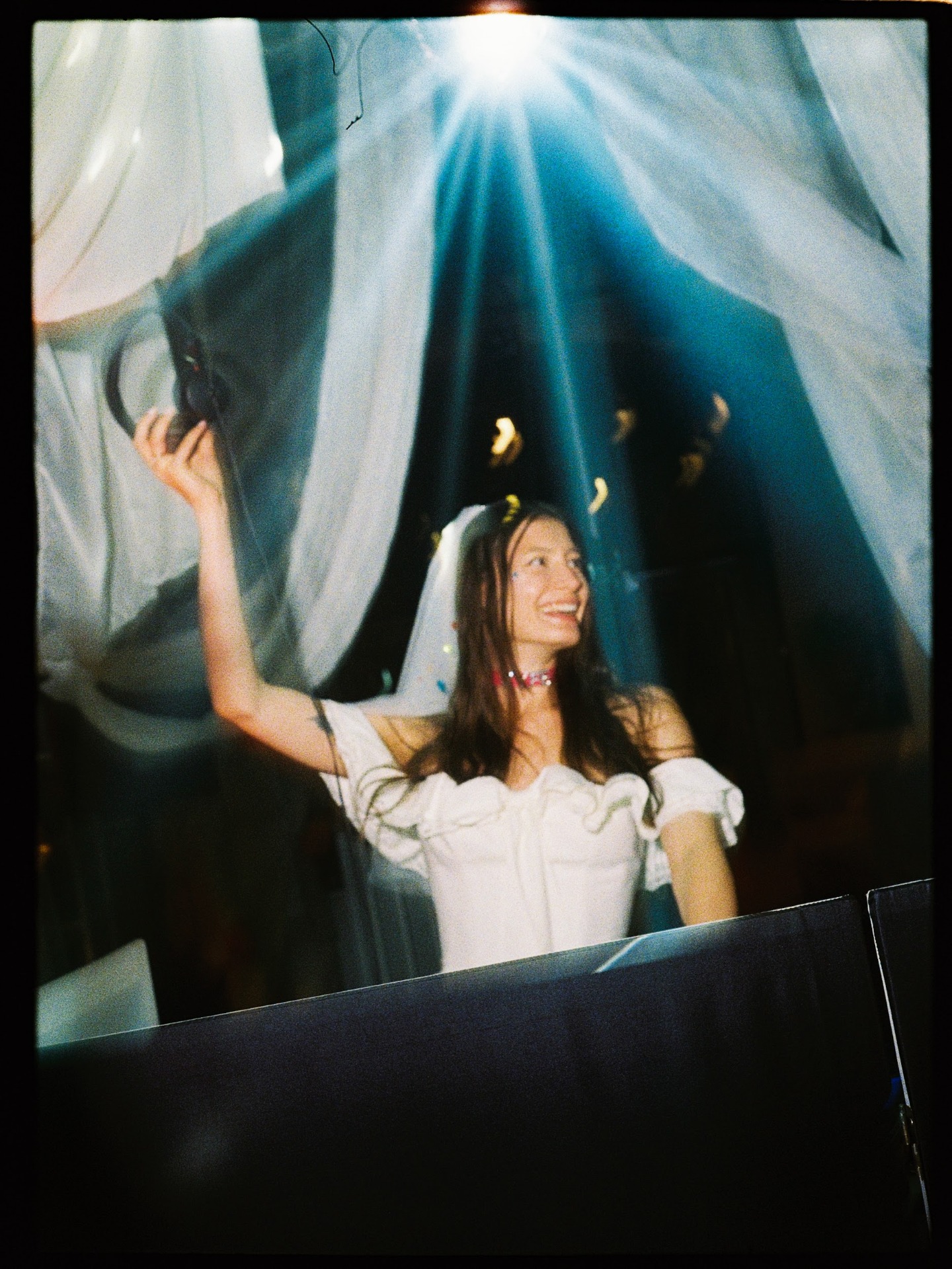 Декор мы задумали сказочным: луна и звёзды, обилие тканей, котики из моей коллекции, карусельки со свечами, которые мы потом дарили гостям. Себе мы, кстати, оставили цветные бокалы, которые я заказывала специально для нашего праздника. На столах были размещены меню в форме солнца, а на нём — зеркальце с именем гостя (их мы использовали в программе). Попадая в зал, гости проходили сквозь полотна тканей. А вечером мы их подвязали, создав эффект балдахина — именно там состоялся мой диджей-сет в новом статусе жены.