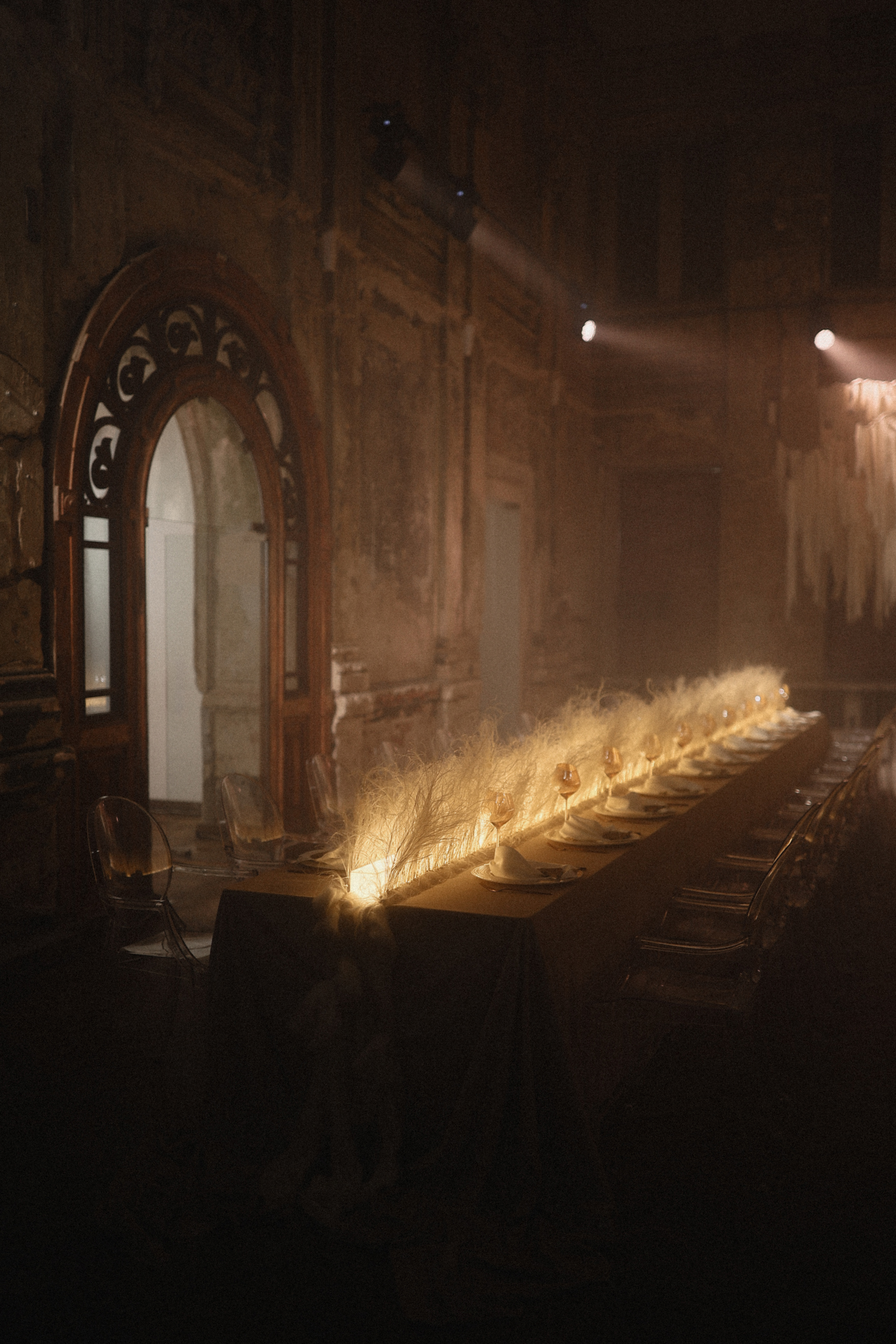 Нет такого правила, которое говорит, что на столе обязательно должны стоять цветы. Их место могут занять другие элементы. Свечи, стеклянная посуда, лампы, фонари и акцентные элементы декора «в тон» концепции — всё это отличные варианты центральных элементов гостевых столов.