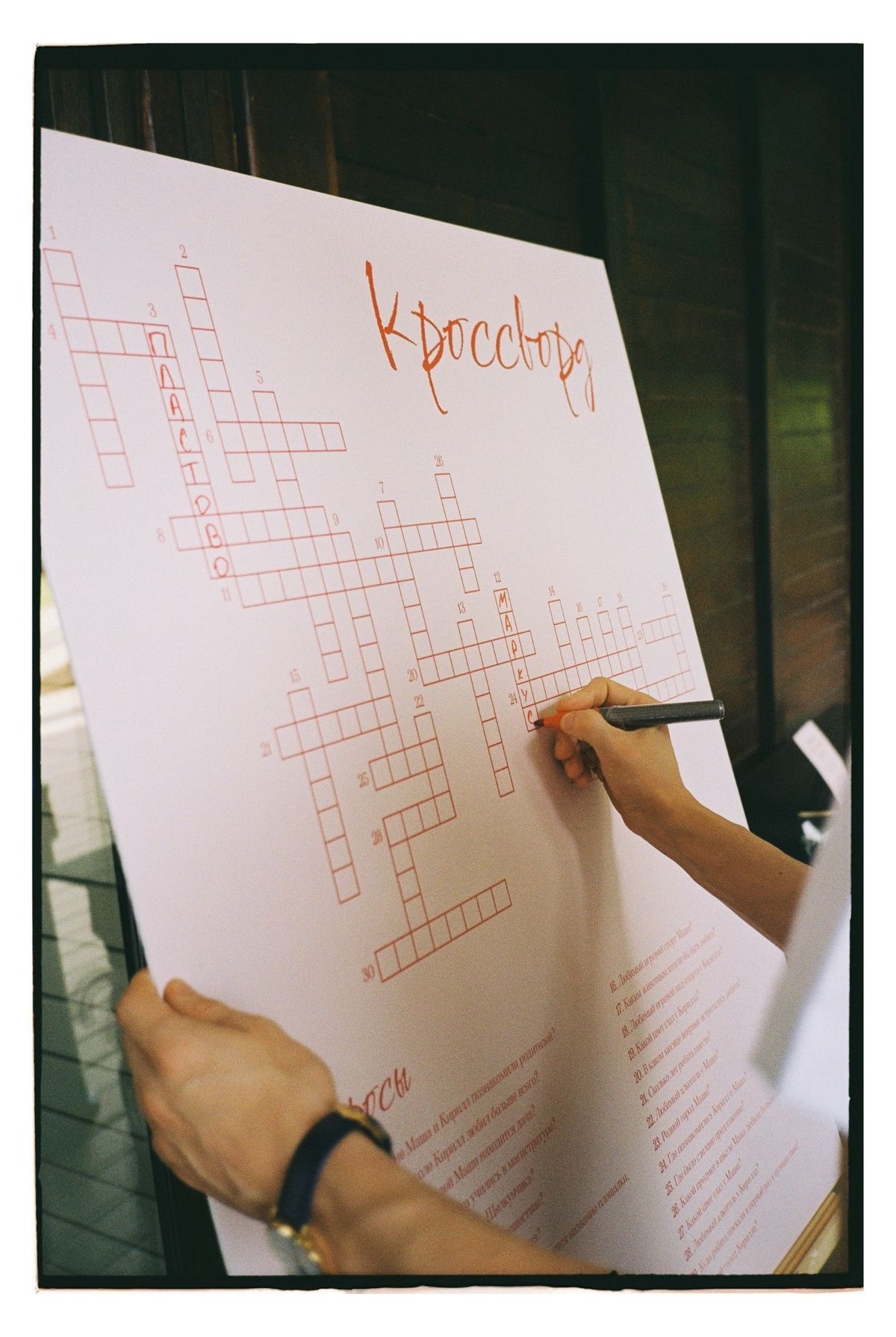 Во время welcome уже могут быть лёгкие ненавязчивые развлечения, которые фоном остаются на весь вечер. Помимо кроссворда, это может быть «to do list» для гостей, в котором они пишут, что хотят сделать вместе с парой в ближайший год.