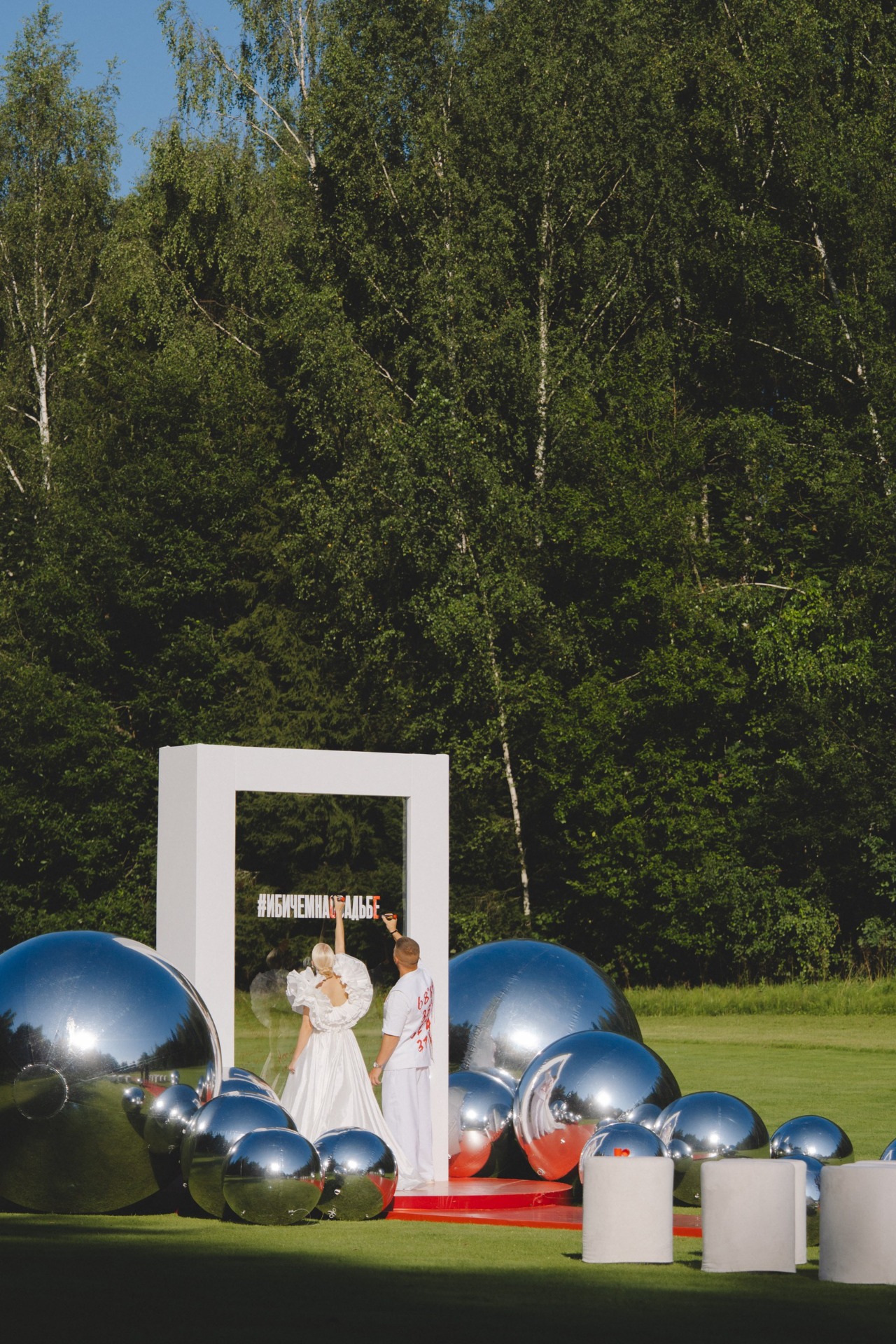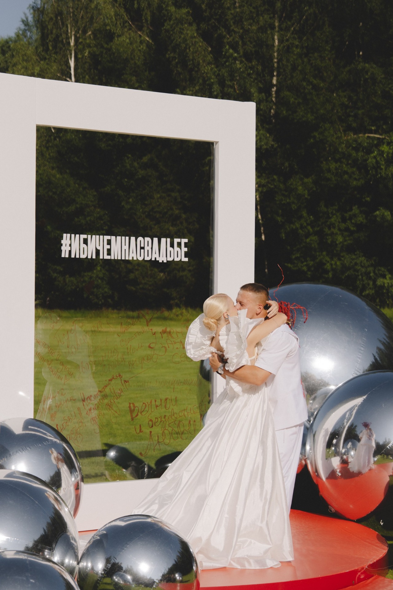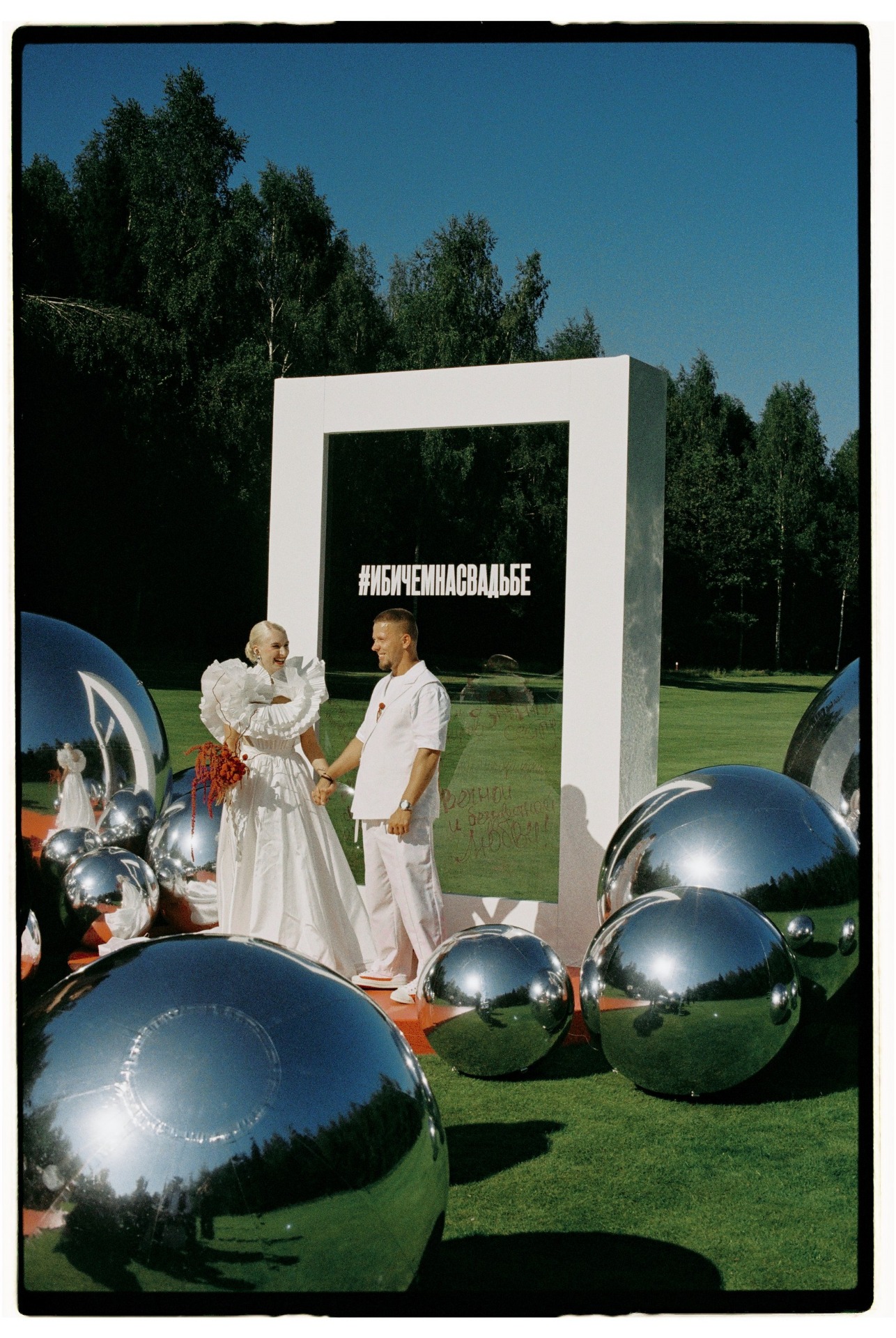 Мы начали готовиться за год до даты торжества, и это было мудрым решением. С ребятами из агентства VOZDUKH всё шло легко: я быстро представила визуальную картинку, даже нарисовала арку для зоны церемонии сама. Она напоминала рамку полароида с хромированными сферами по бокам — символом путешествий, благодаря которым мы и встретились. В центре был хэштег из нашей тревел-истории, а перед церемонией гости оставили на арке свои пожелания.