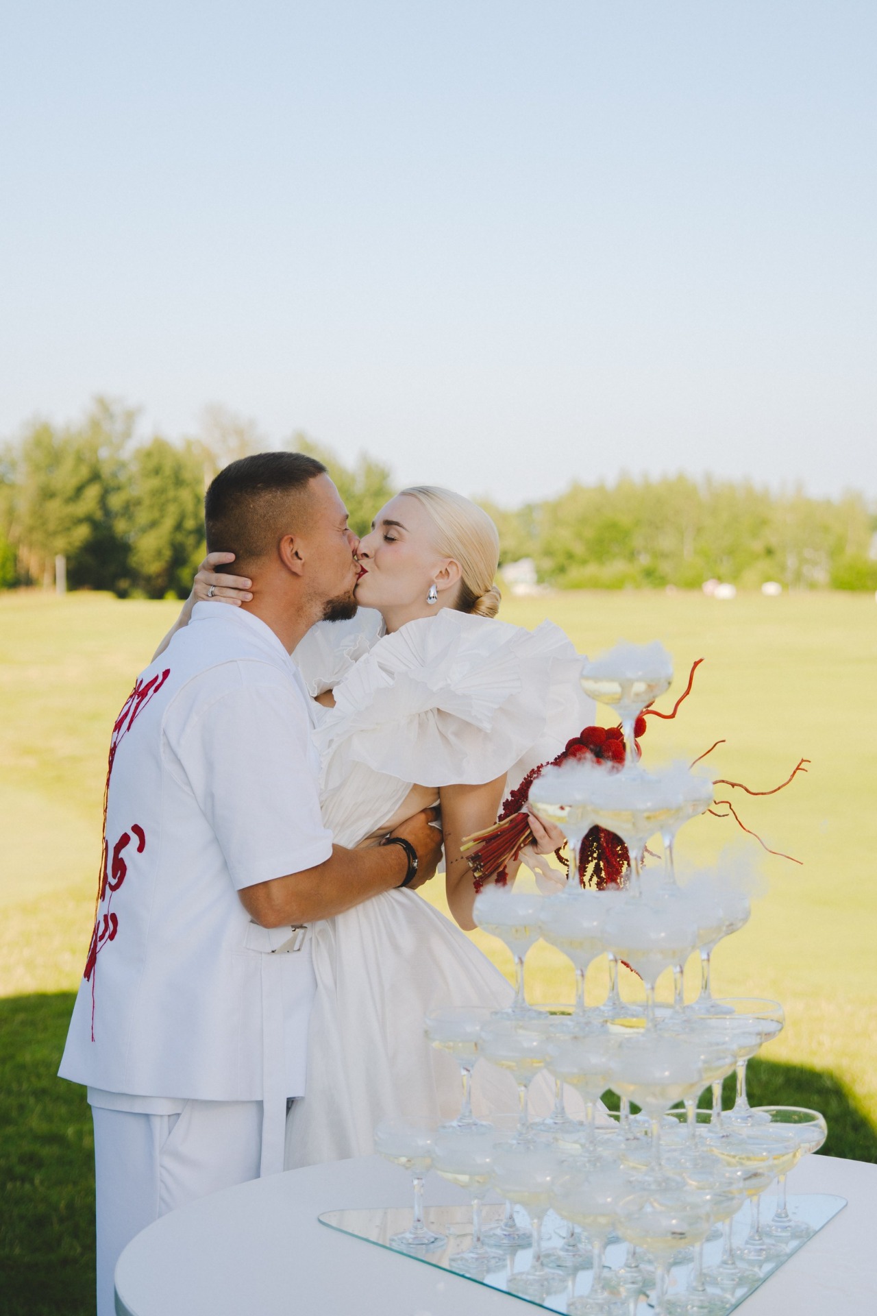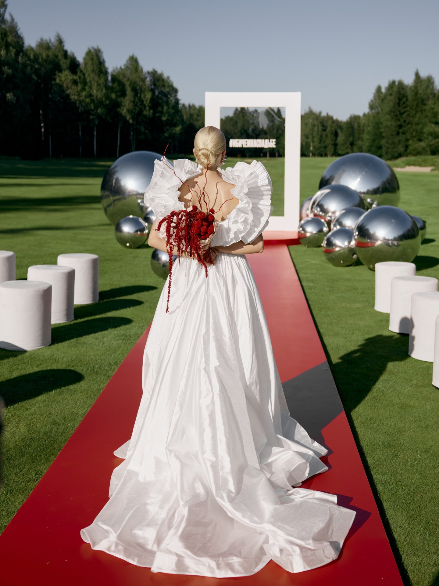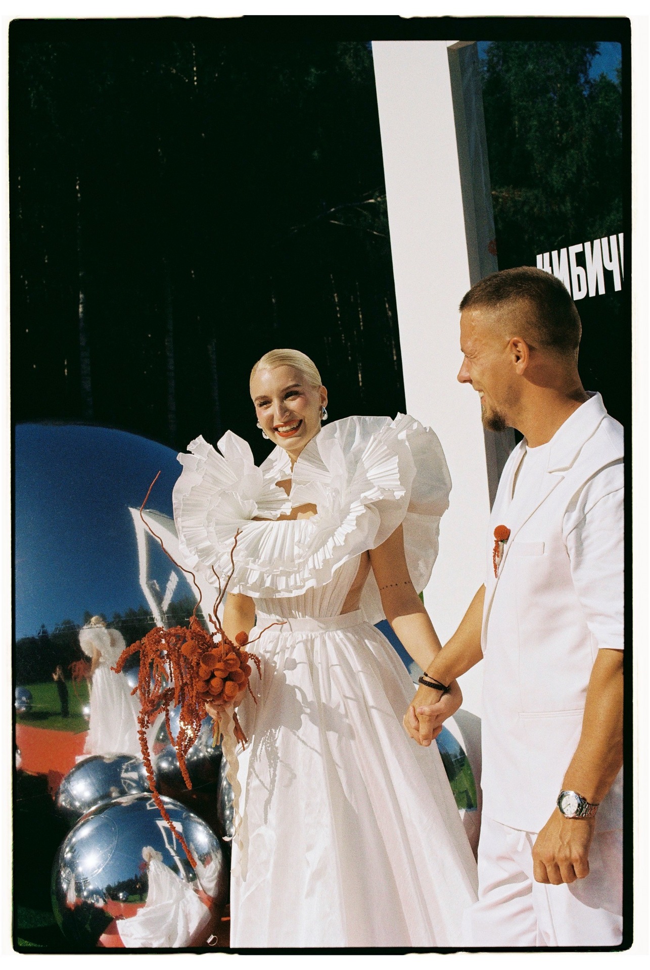 Мы начали готовиться за год до даты торжества, и это было мудрым решением. С ребятами из агентства VOZDUKH всё шло легко: я быстро представила визуальную картинку, даже нарисовала арку для зоны церемонии сама. Она напоминала рамку полароида с хромированными сферами по бокам — символом путешествий, благодаря которым мы и встретились. В центре был хэштег из нашей тревел-истории, а перед церемонией гости оставили на арке свои пожелания.