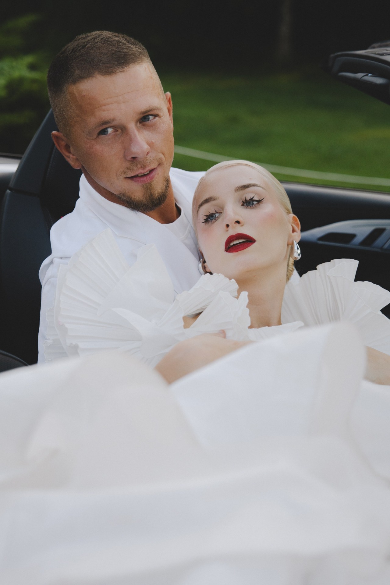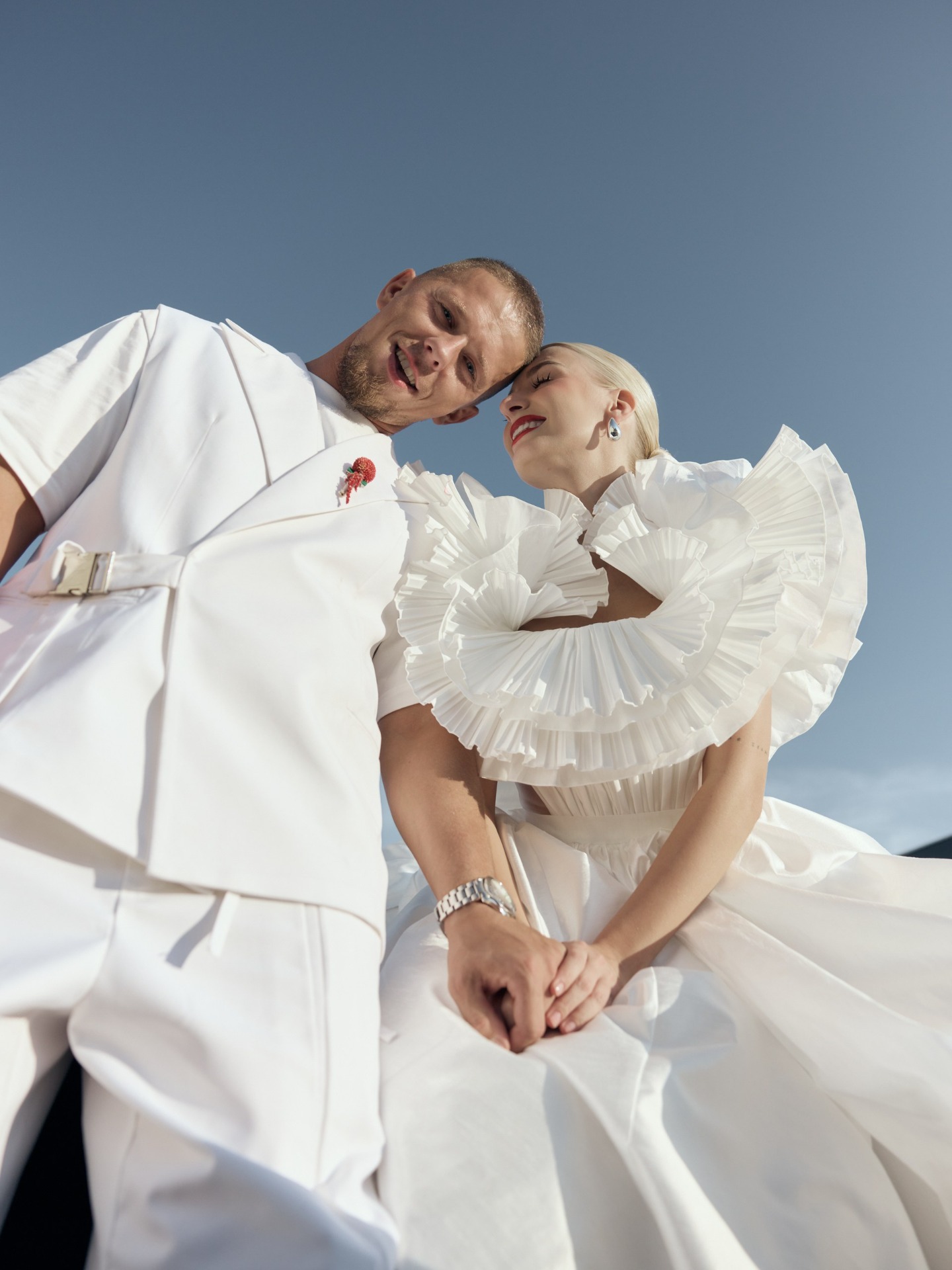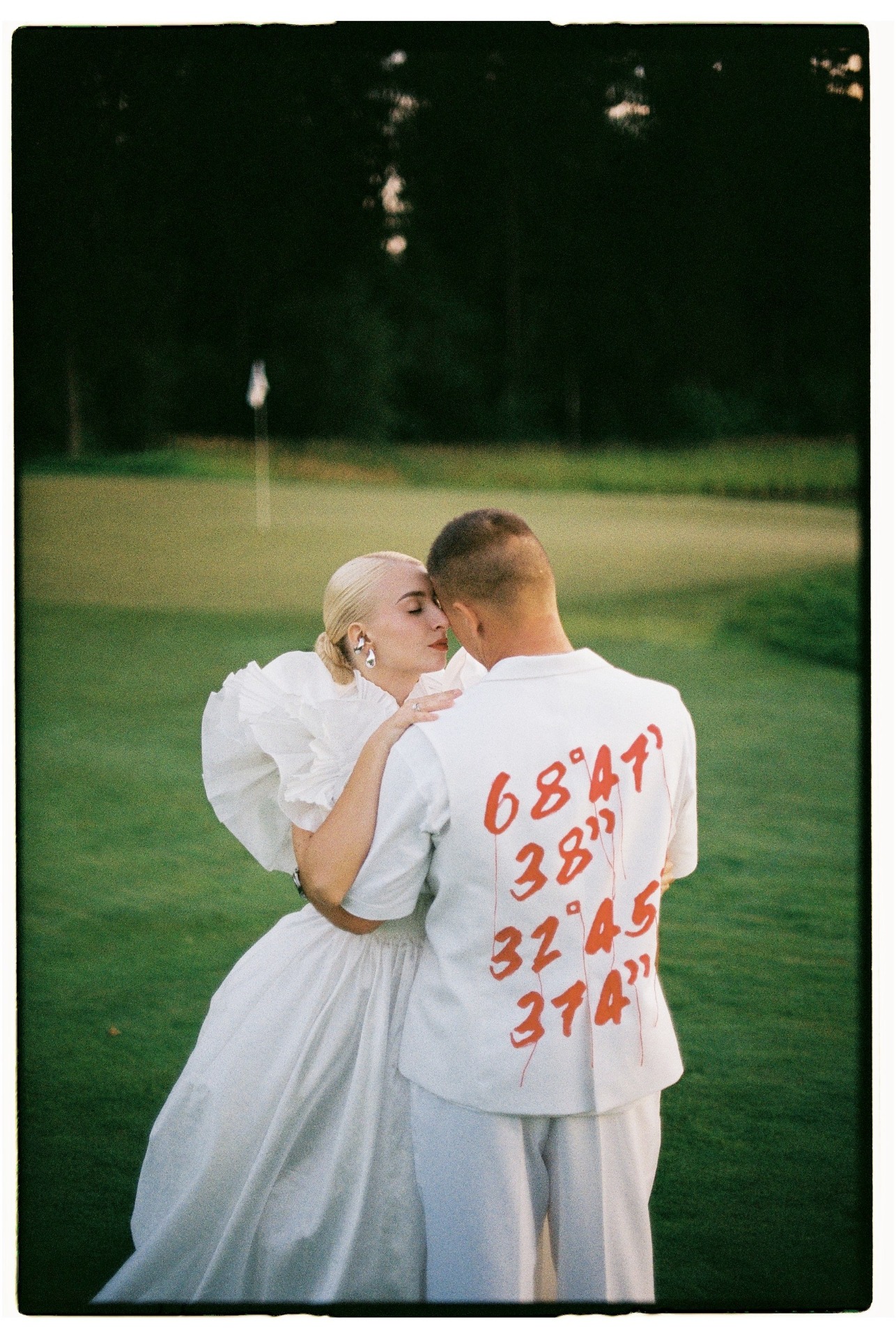 Для Дениса костюм мы шили у Артёма Мидда. Нам хотелось вариант «не как у всех», чтобы его можно было носить после свадьбы. Фишкой образа стала красная аппликация на спине с координатами места нашей первой встречи. Вместо классических ботинок Денис выбрал кеды Diesel.