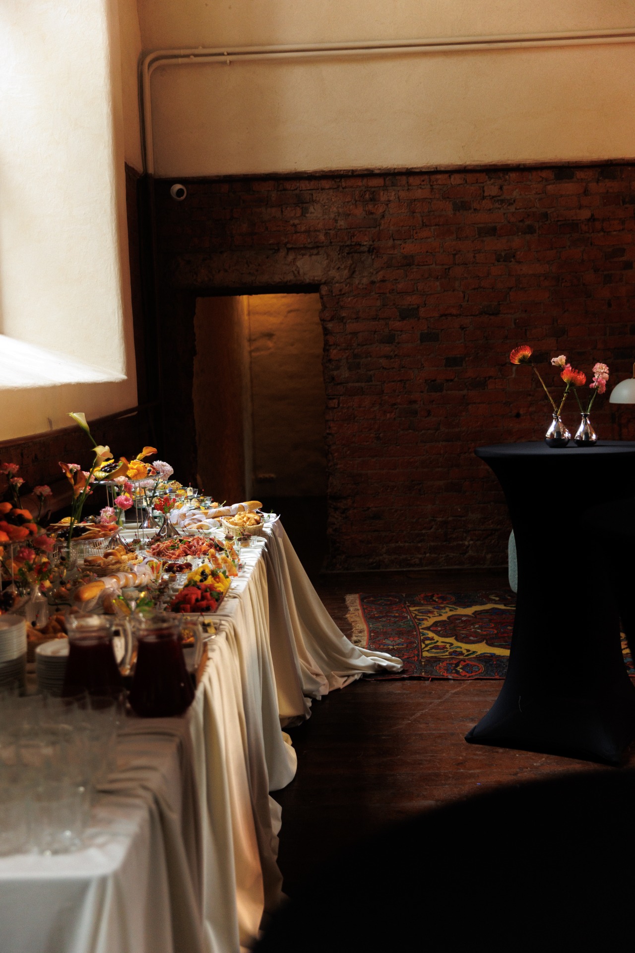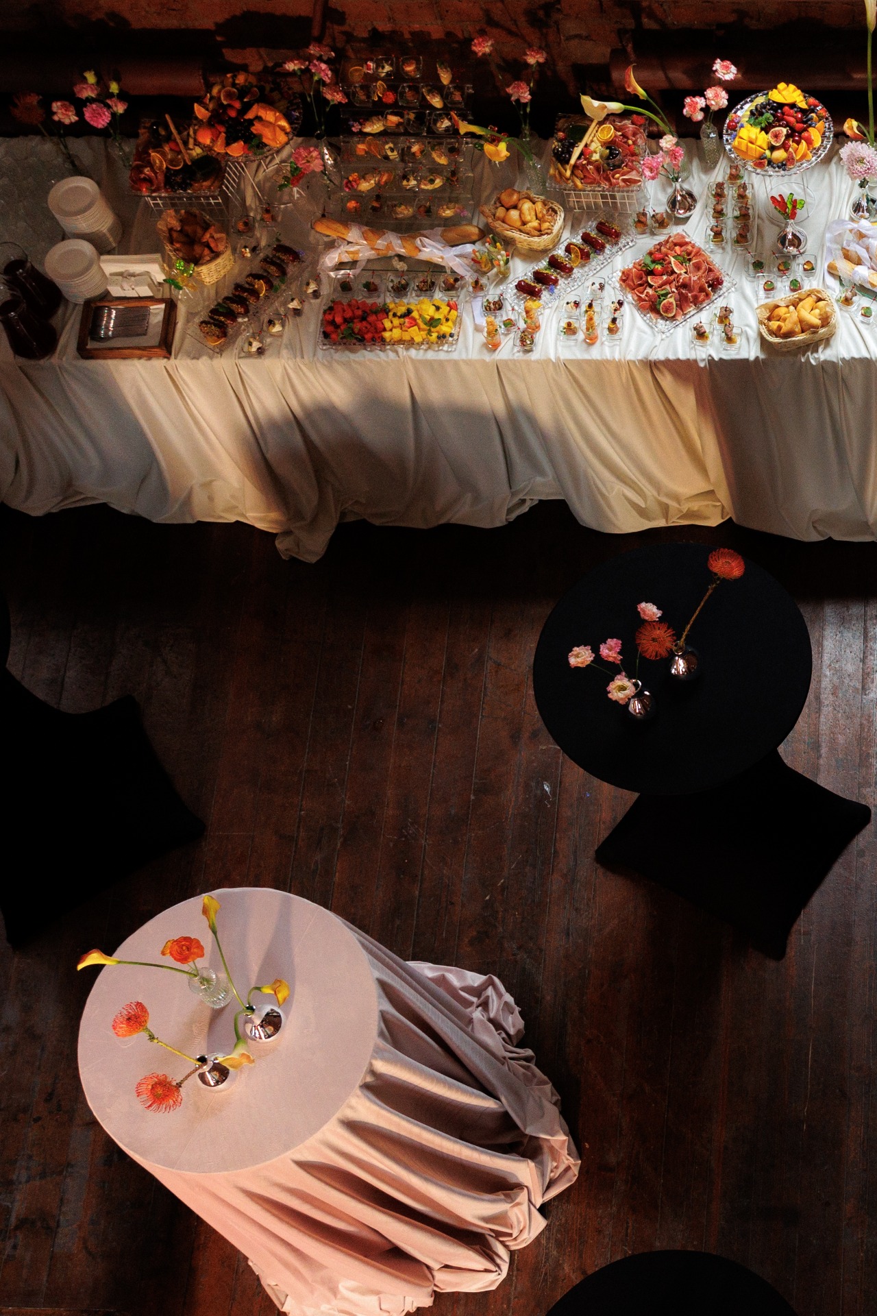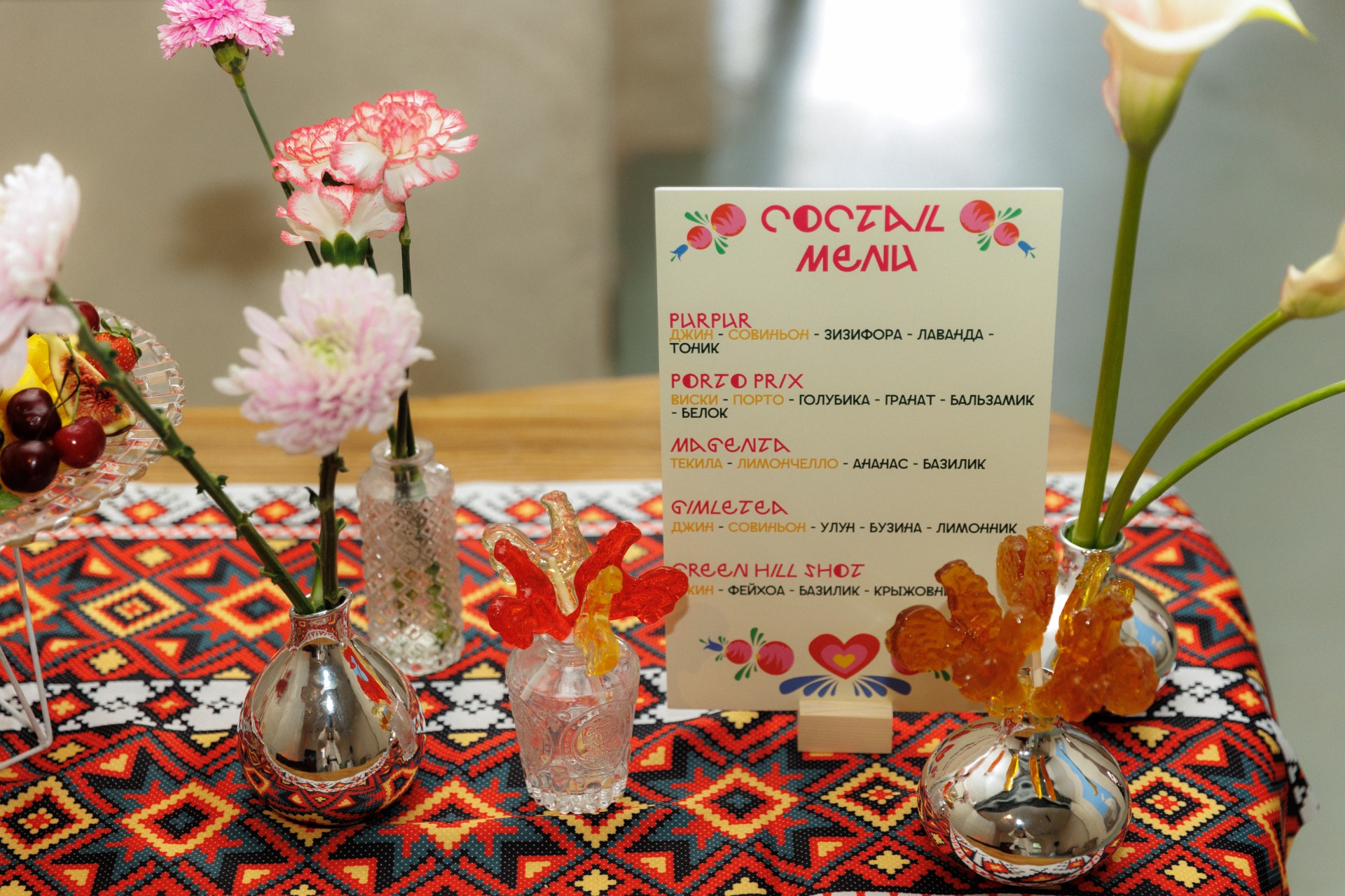 На второй день, в лофте, на welcome-зоне была кружевная дорожка с закусками. На фуршетных столах — хлеб и яркие простые цветы в стеклянных вазах под хрустальные водочные бутылки. По пространству были разбросаны и другие детали нашей концепции: сахарные петушки, яблоки в розовой карамели, диско-шары.