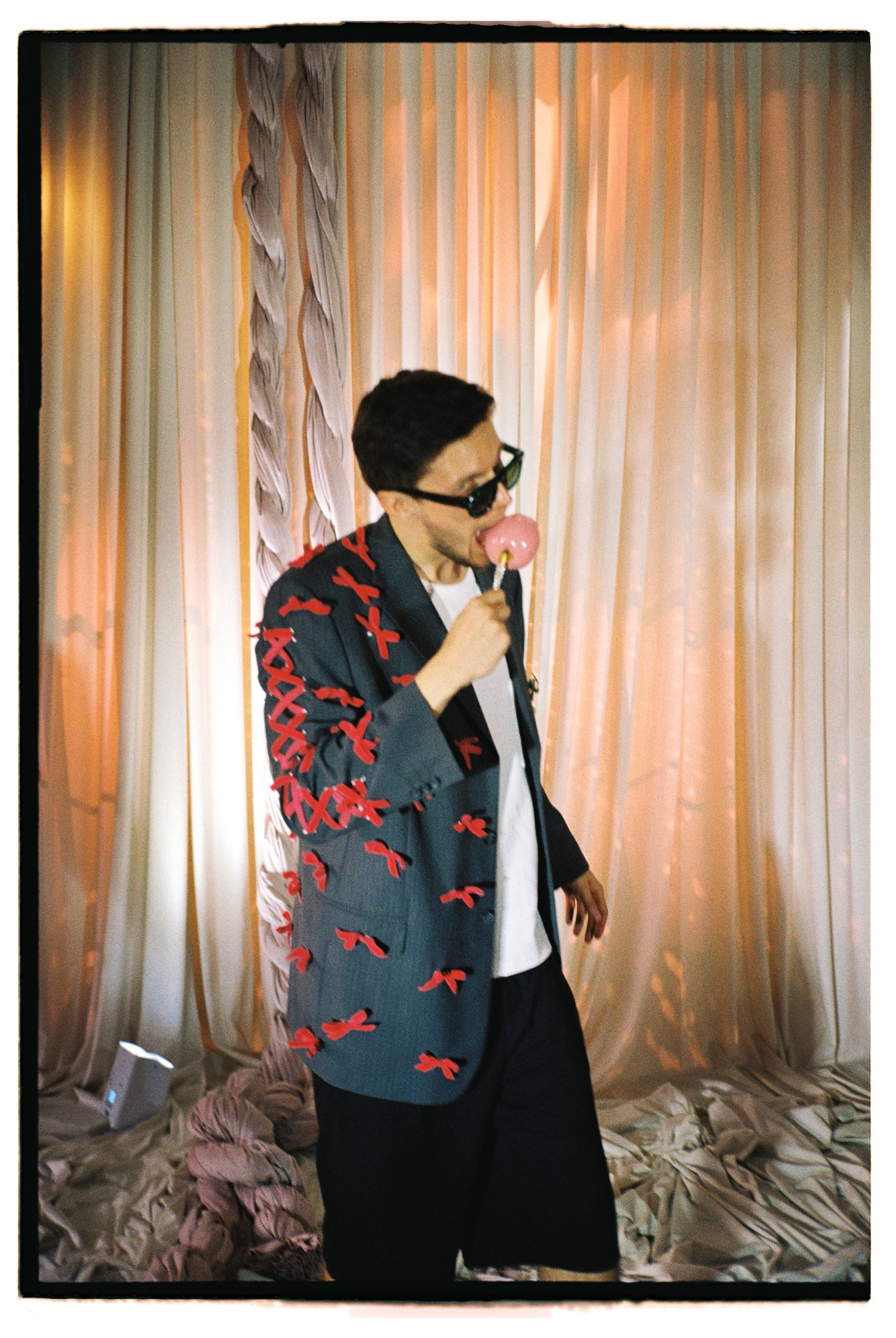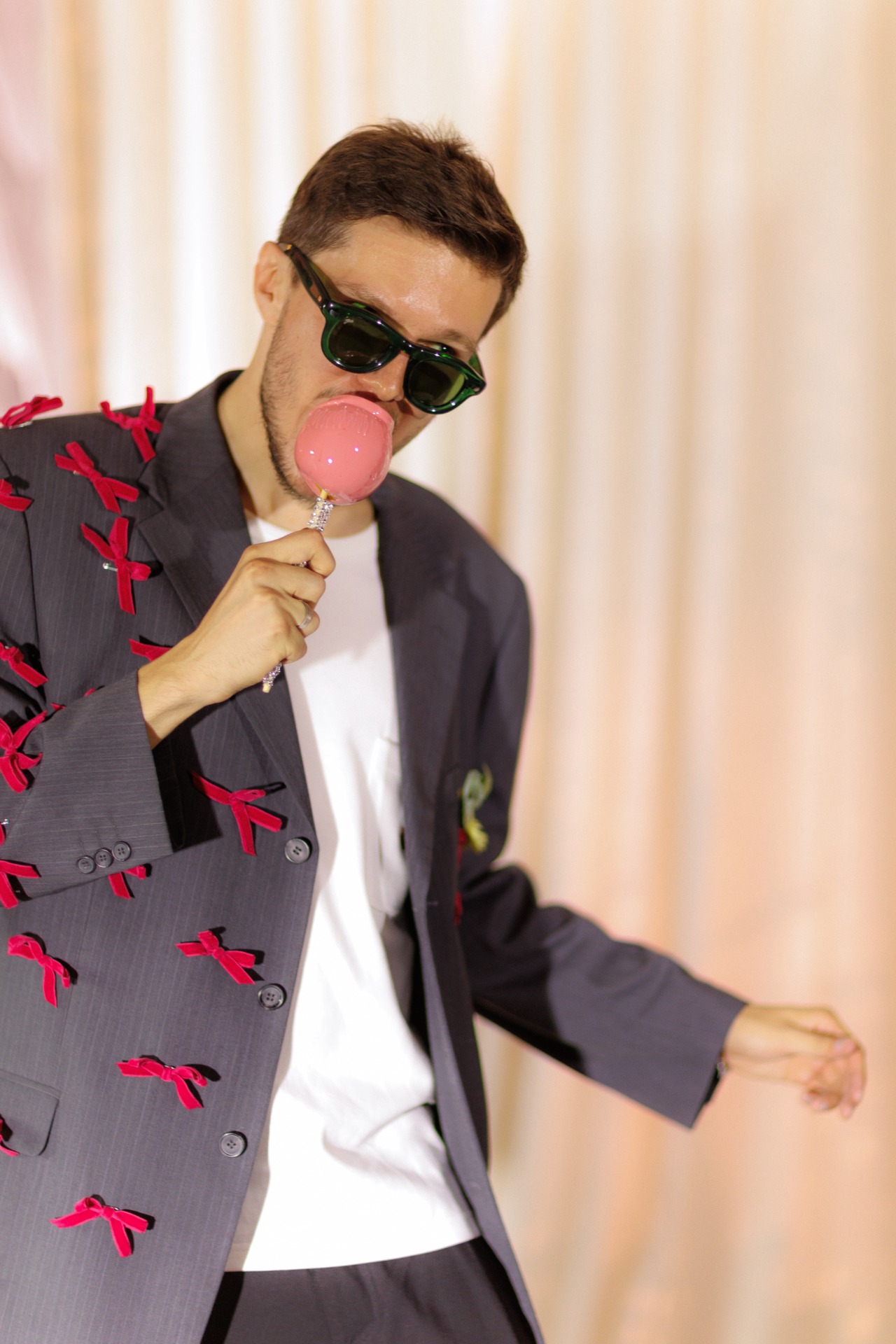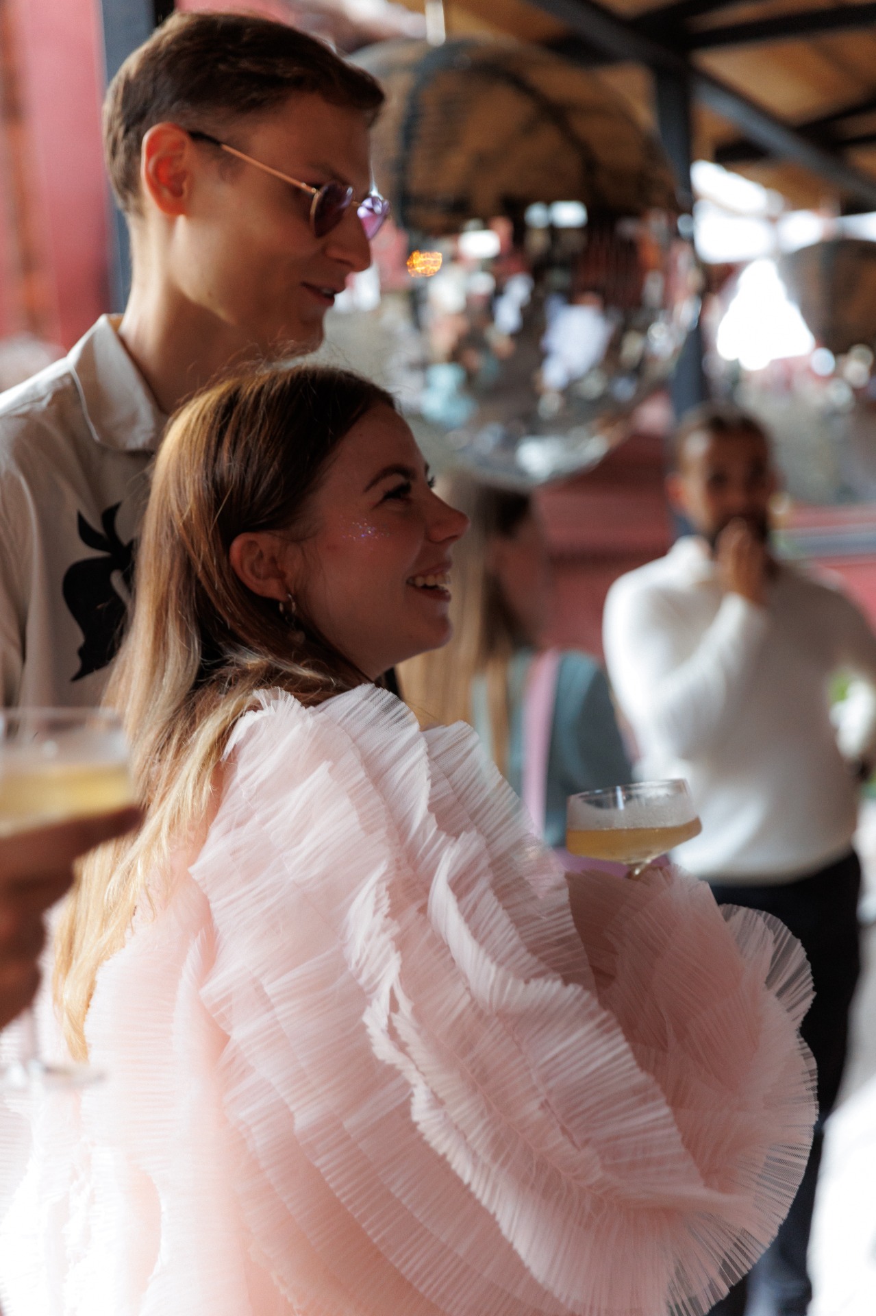 На вечеринке мы решили оторваться! У меня было 2 платья: первое — пышное платье-баллон на одно плечо с таким же пышным рукавом и блестящими туфлями, второе – белое платье простого кроя в пайетках для активных танцев. У жениха — сумасшедший пиджак в красных бантах и чёрные шорты.