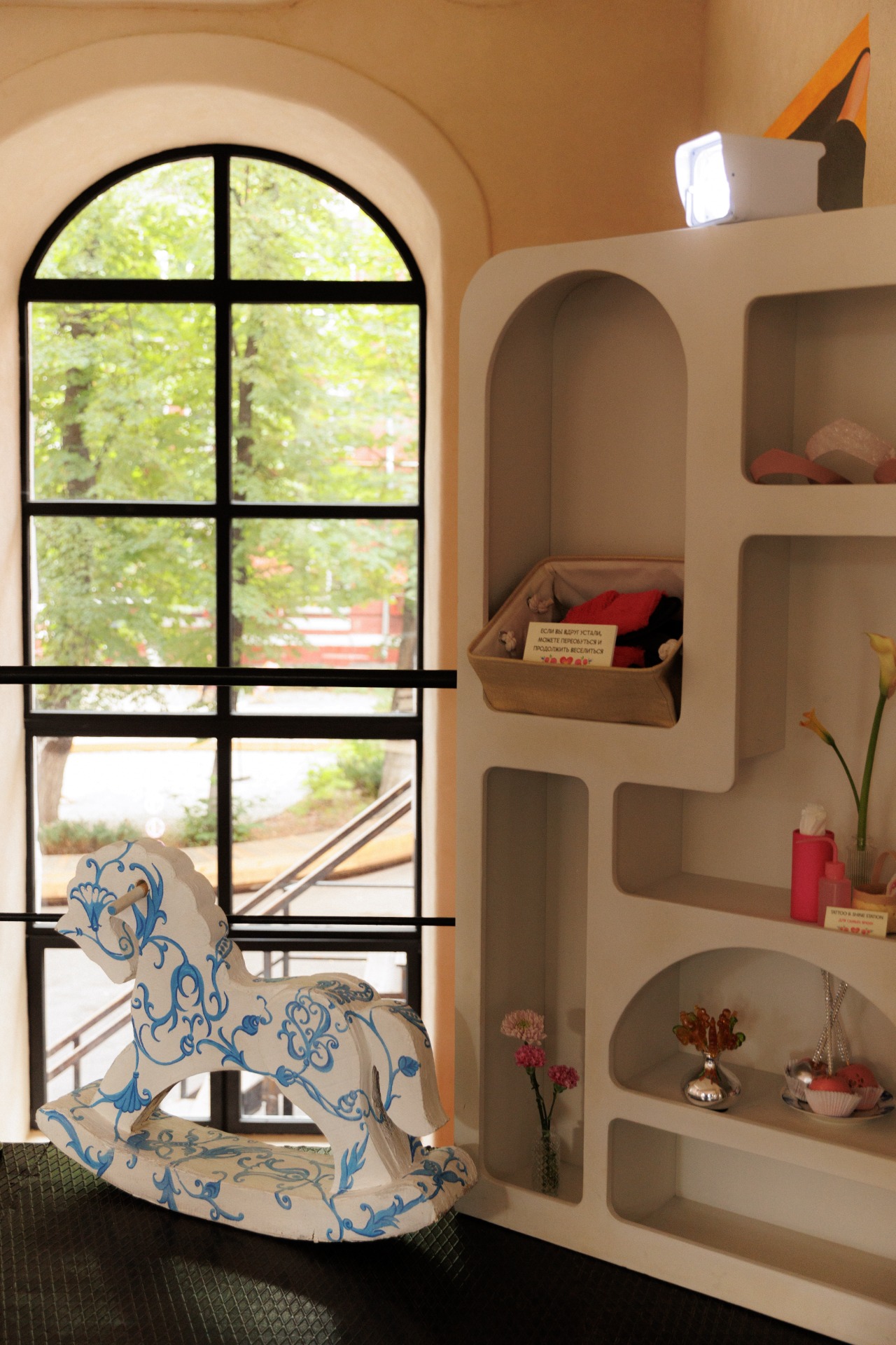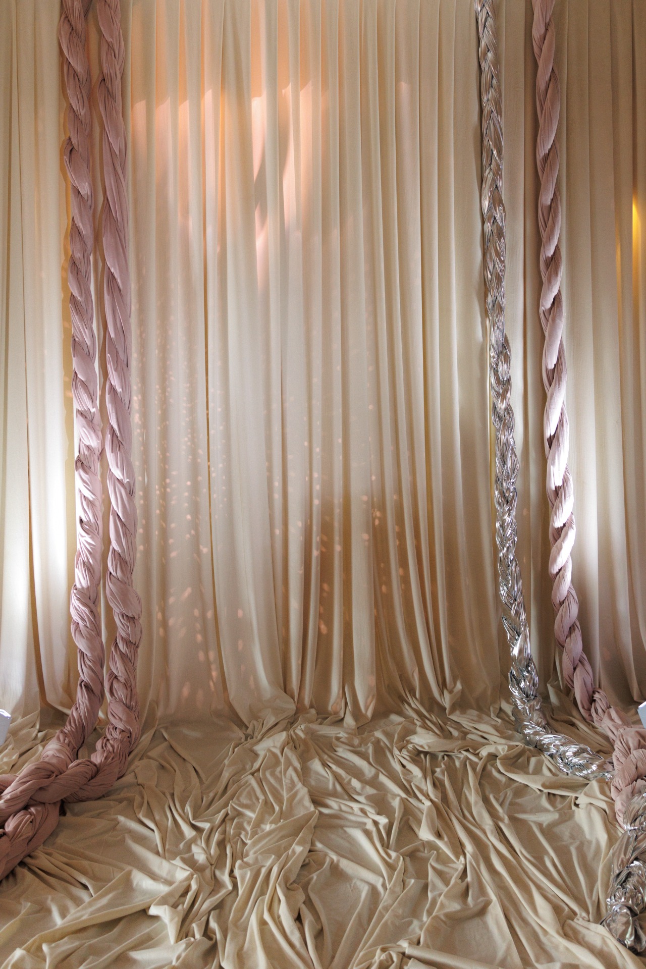 Второй день мы хотели провести максимально расслабленно, в кругу близких друзей. Я, как любительница розового, сразу определила основной цвет вечеринки. Поскольку мы много путешествуем внутри России, дополнением к розовому цвету стал русский стиль. Было важно не уйти в откровенный лубок и пародию, поэтому мы аккуратно смешивали одно с другим: на фотозону вместе с декоратором подобрали косы, которые сплели из серебристой и нежно-розовых тканей, рядом поставили корзину с яблоками и деревянного коня-качалку.