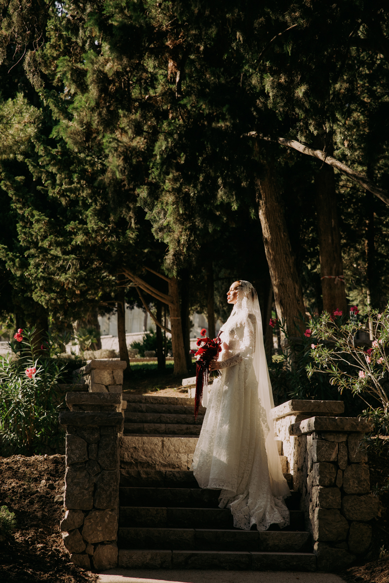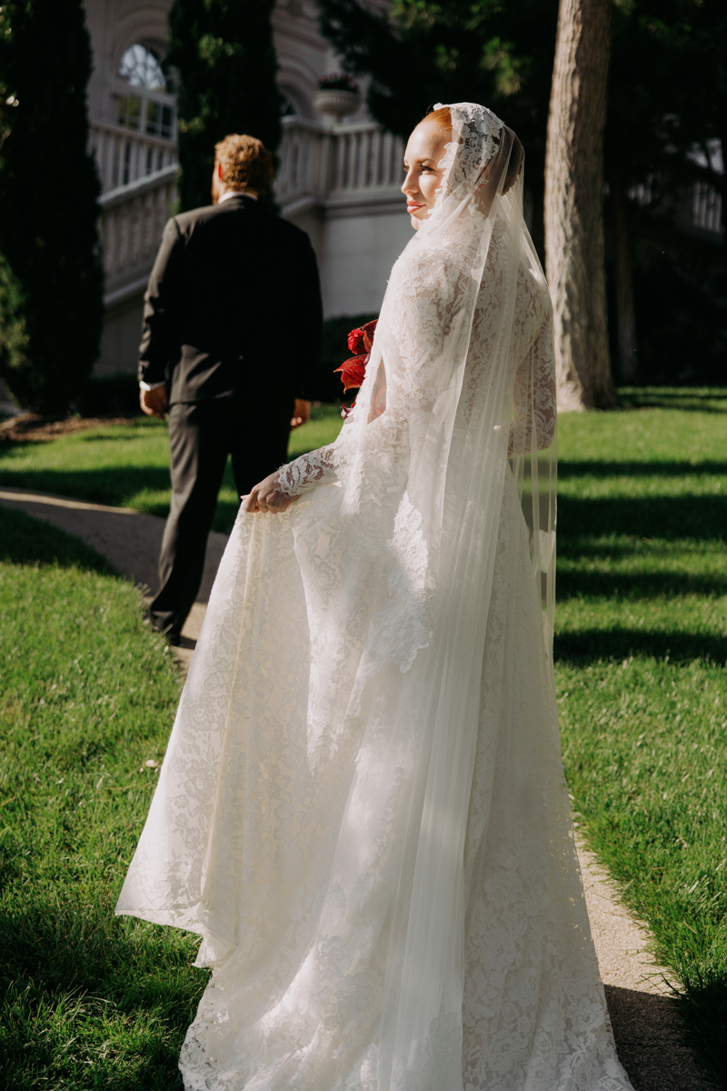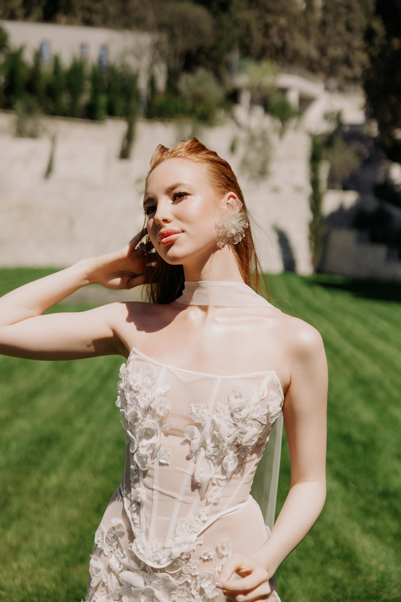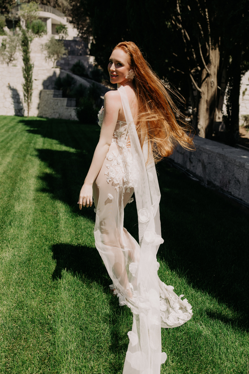 Основной свадебный образ был, напротив, очень сдержанным и выполненным из кружева. Именно он выводил естественную красоту Марии на первый план. Третий образ стал смесью сексуальности и гедонизма, в сочетании с россыпью жемчуга, украшающего шею и талию корсета невесты.